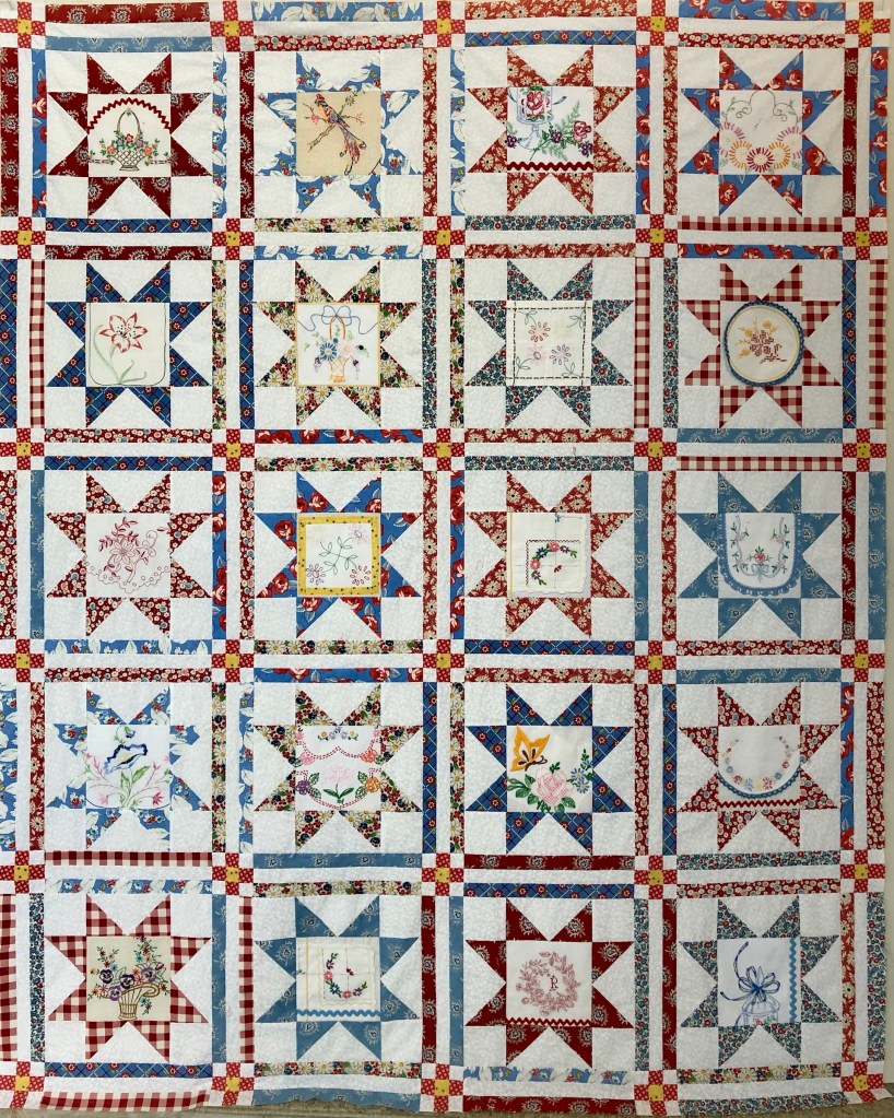 This red/blue/yellow/white Star quilt top makes me smile every time I see it! No, it is not finished, I am still deciding on borders. I’m in no hurry so it may stay unfinished for a month or two.