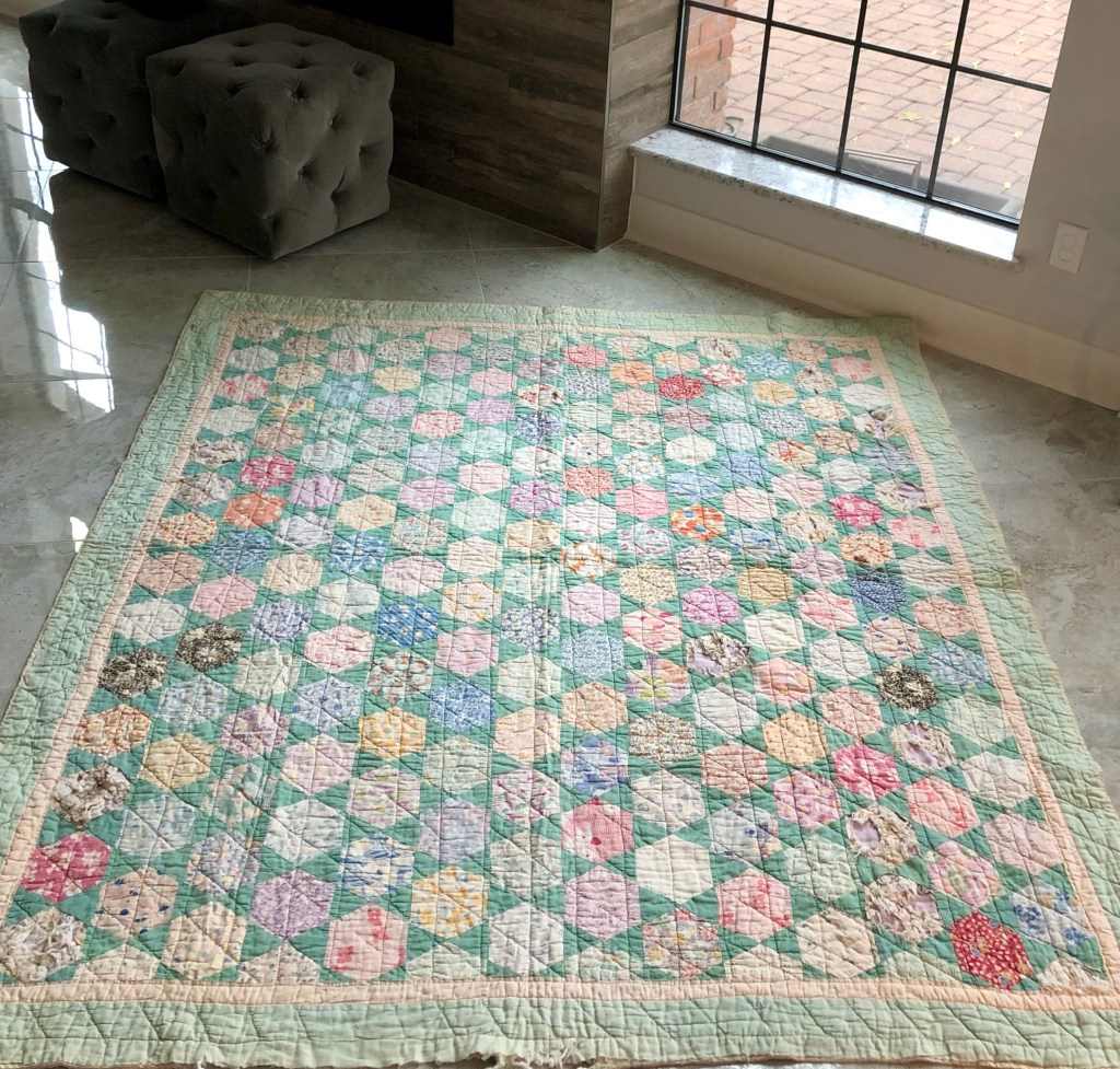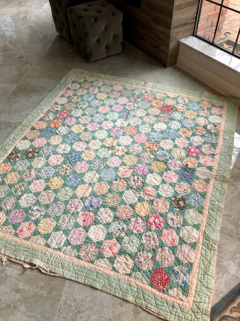 A recent find and you know me and hexagons, I could not pass on it. But let me tell you…this quilt was filthy! So filthy I could not bring myself to do more than cover the holes with soft white tulle. I had to stop and wash my hands frequently and while I’m not a crazy germophobe, I did wonder at times what kind of dust and grime I was inhaling as I attached the protective tulle. 😕