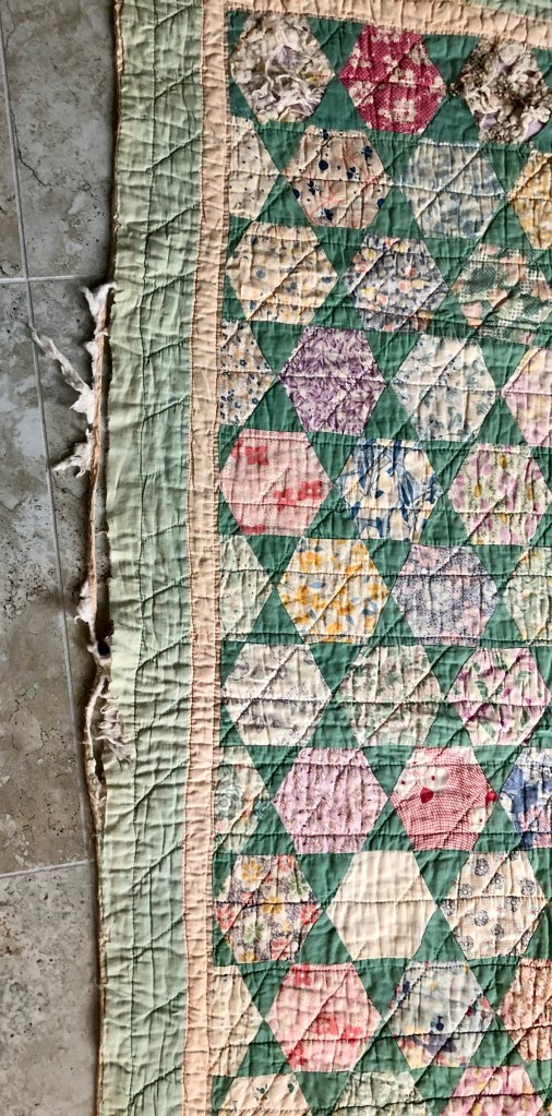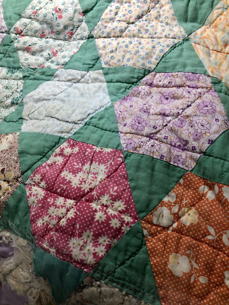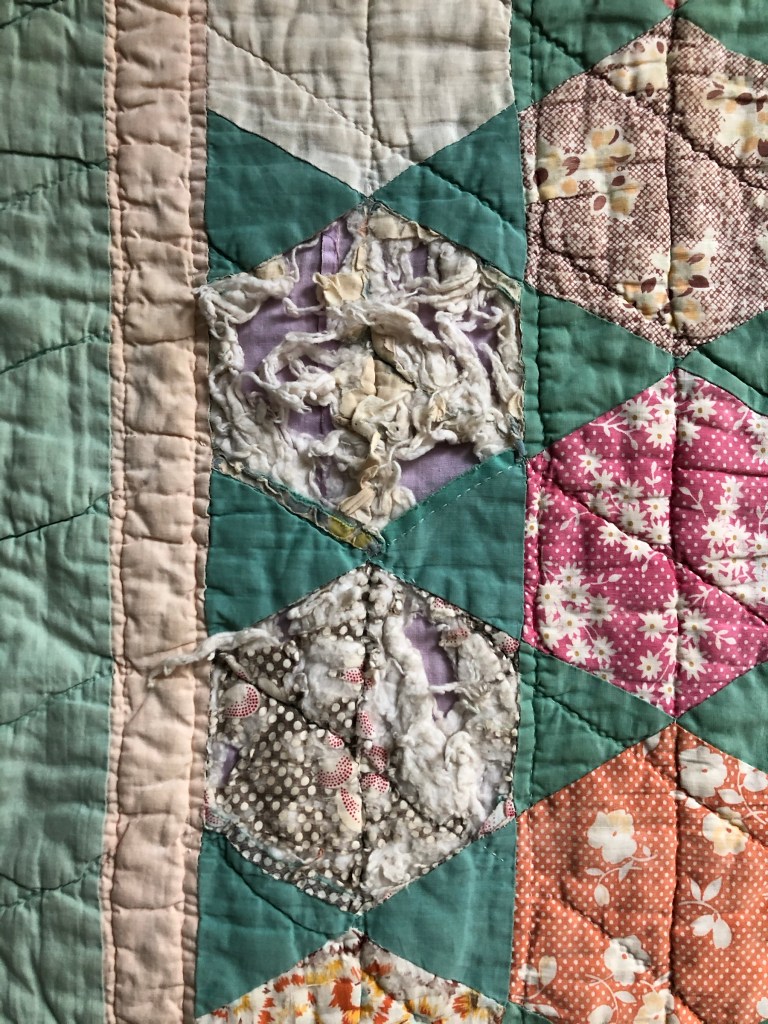 About 9 different full and several half hexagons had the fabric literally rot away. While I am not an expert on feed sacks I do believe the hexies are mostly if not all made from feed sack fabrics.