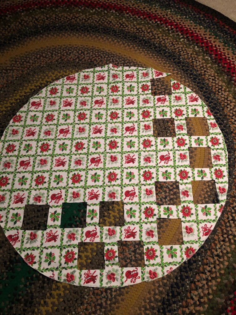 Another idea I’m developing: I went eBay shopping a few weeks ago looking for a vintage Christmas tablecloth. I purchased one, soaked and laundered it when it arrived. Because I discovered it had been printed on the fabric bias, spray starch came to my rescue as I pressed out the laundry wrinkles.