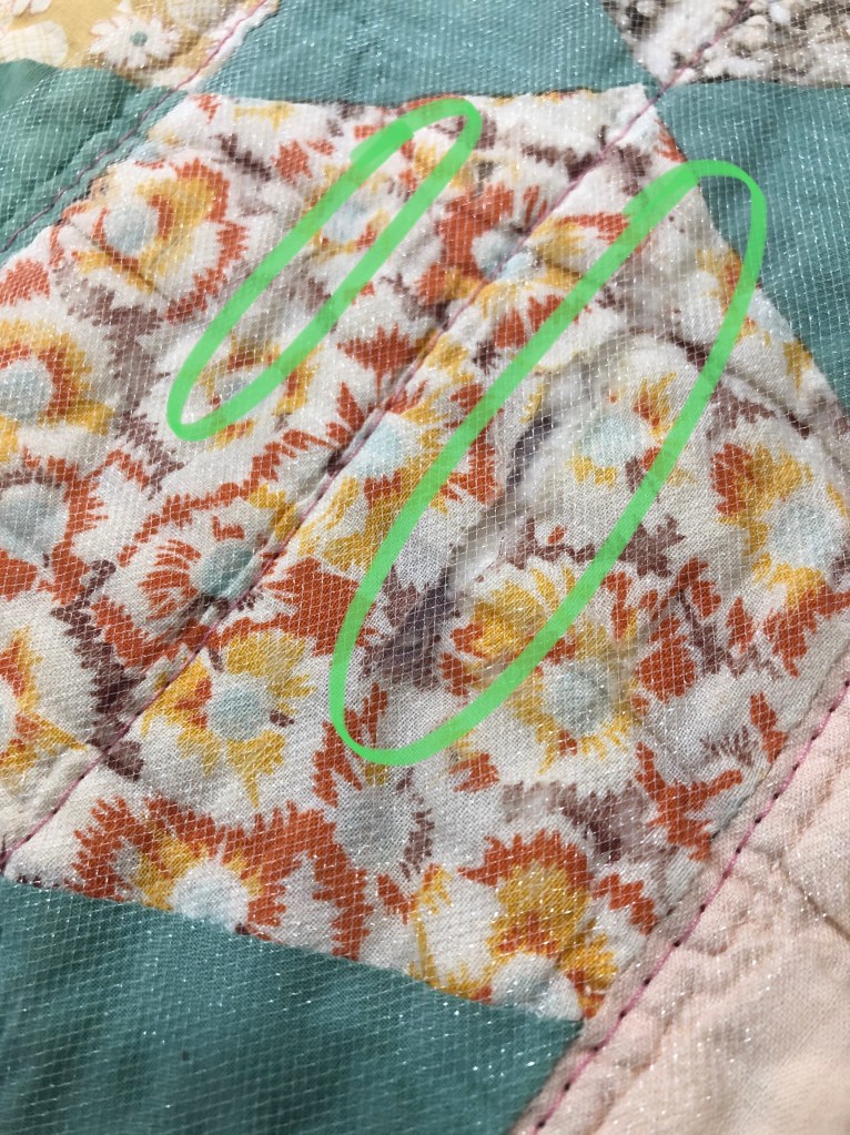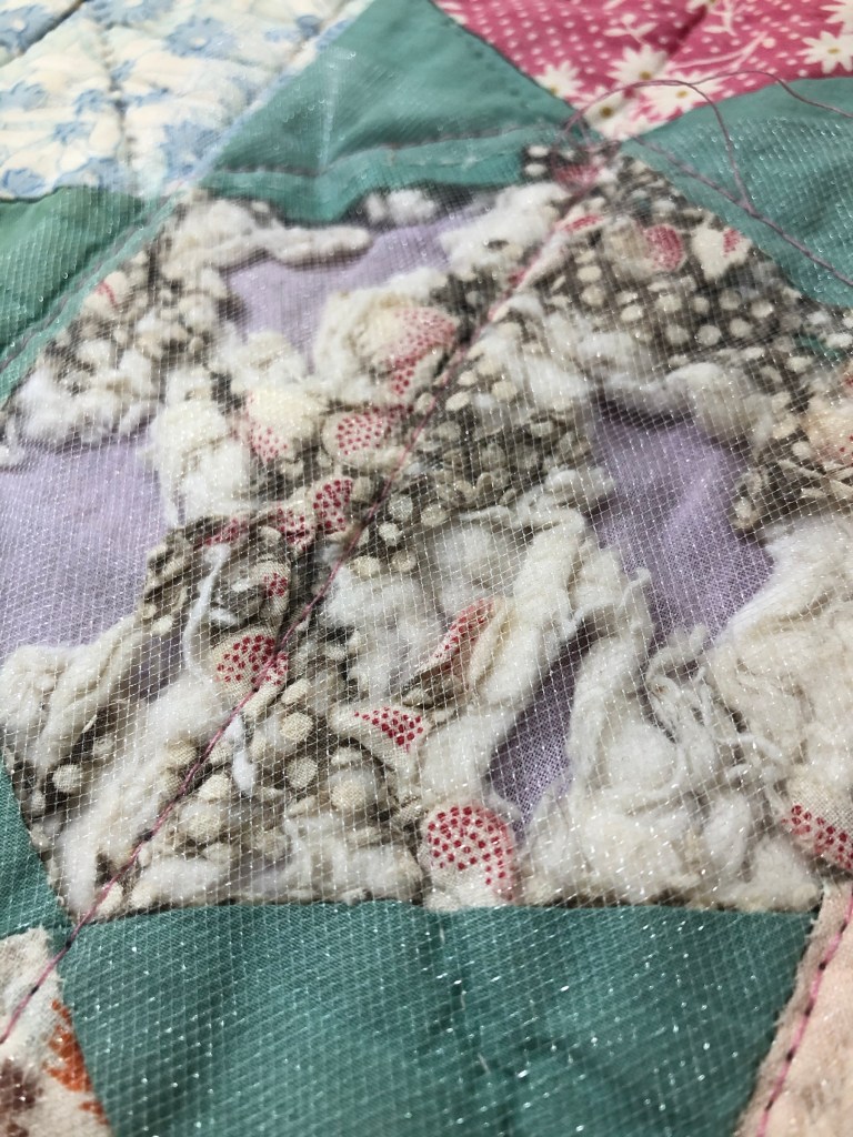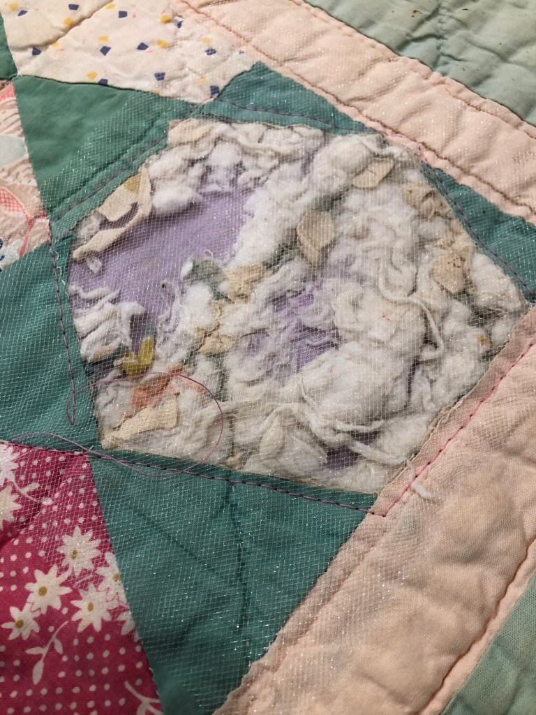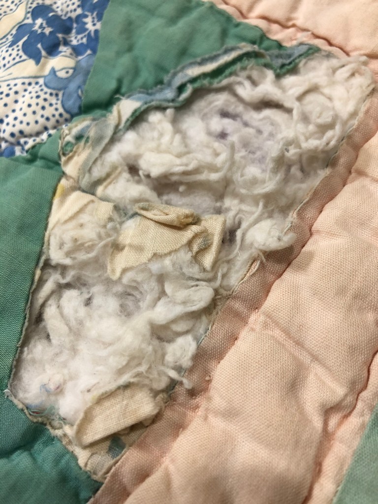 I can tell from the bits of fabric left that the same fabrics consistently across the quilt top could not stand up to the wear of this utility quilt.