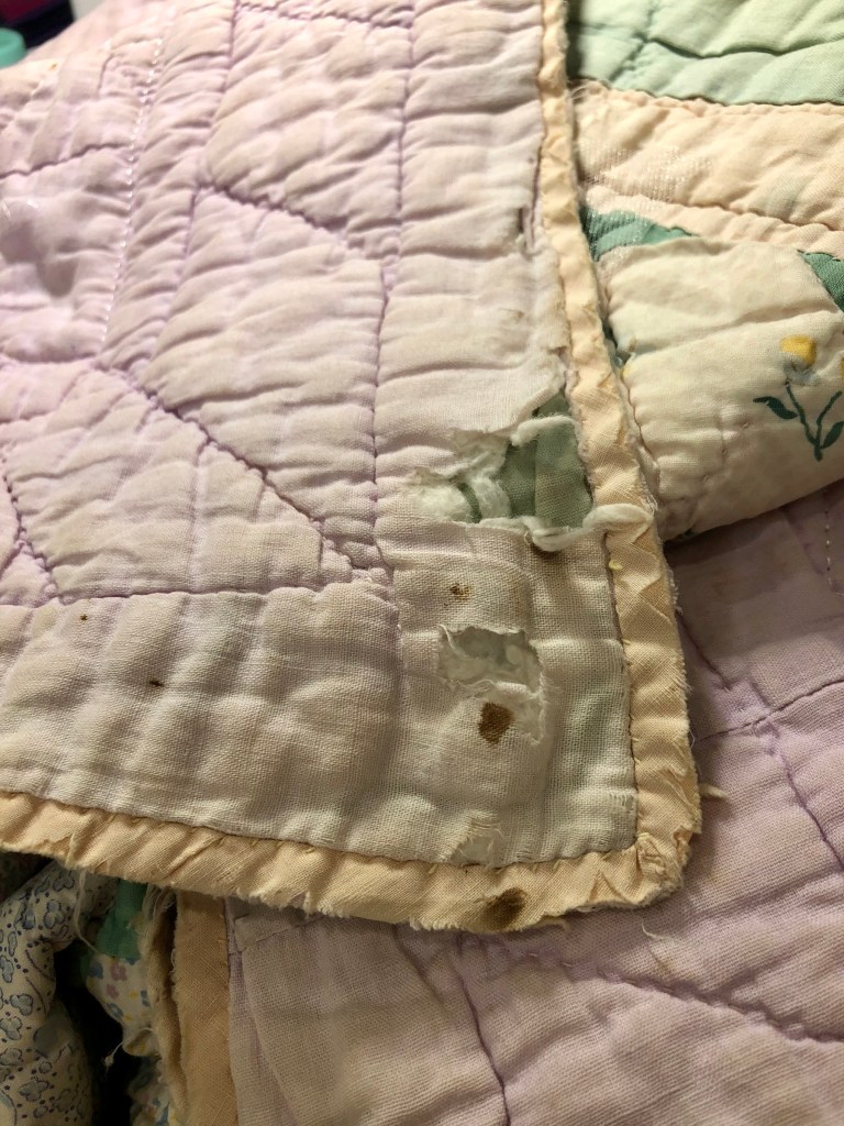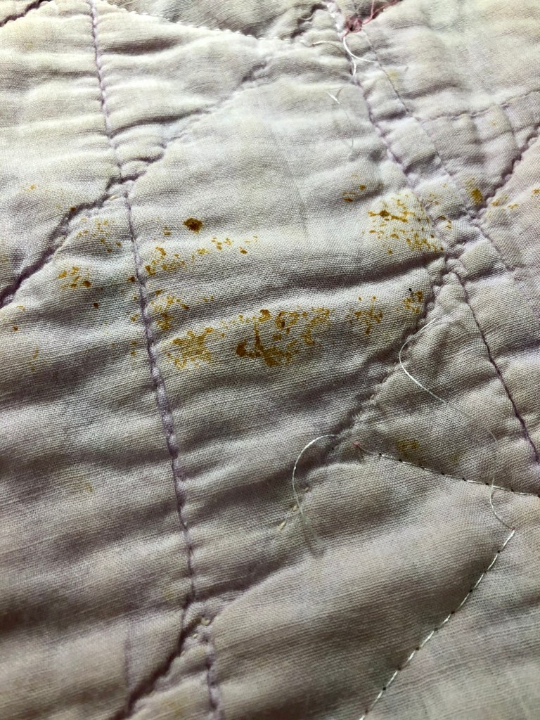 The back of the quilt also has some serious issues but nothing that can’t be fixed. I do think there are some stains that are permanent though. I will know after the piece has finished soaking.