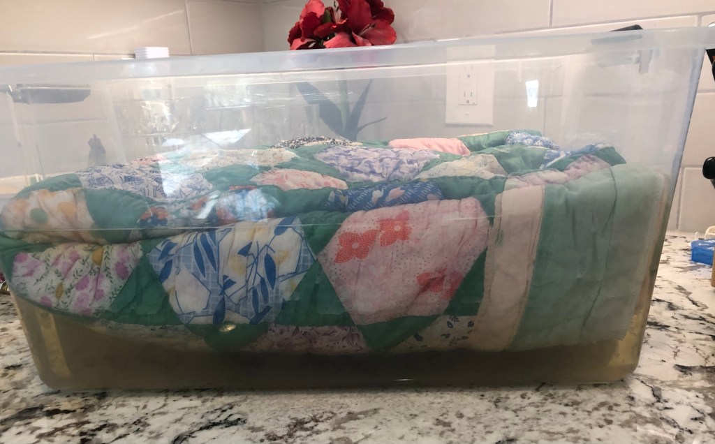 Look at the ugly brownish-yellow water at the bottom of my soaking tub. Oh my! I soak all my vintage quilts in Sodium Perborate, the same thing as Retro Clean. It does such a wonderful job of removing the dinge associated with old quilts. I use very hot tap water and always soak my old quilts for at least 48 hours. After soaking, I will drain am much water as possible and then it’s on to the front load washing machine and the dryer. It’s after the quilt is dry that I will begin removing the tulle and the repair process will begin.