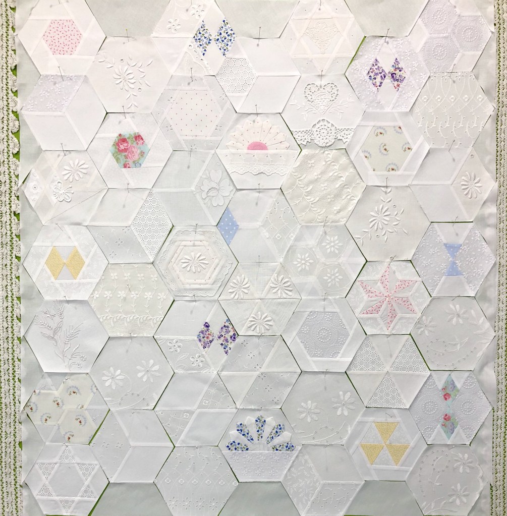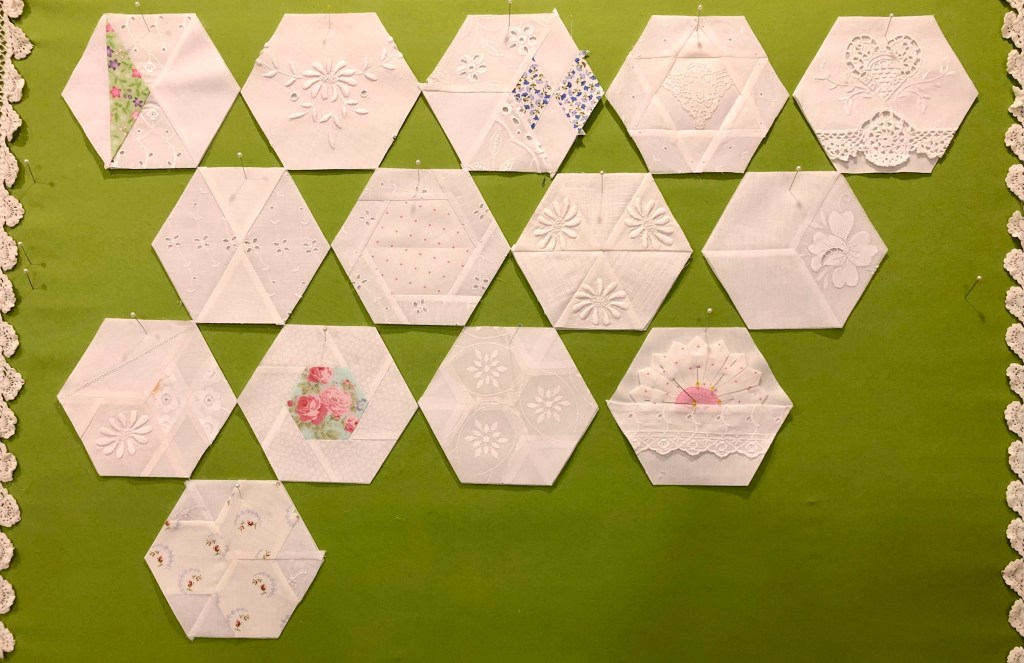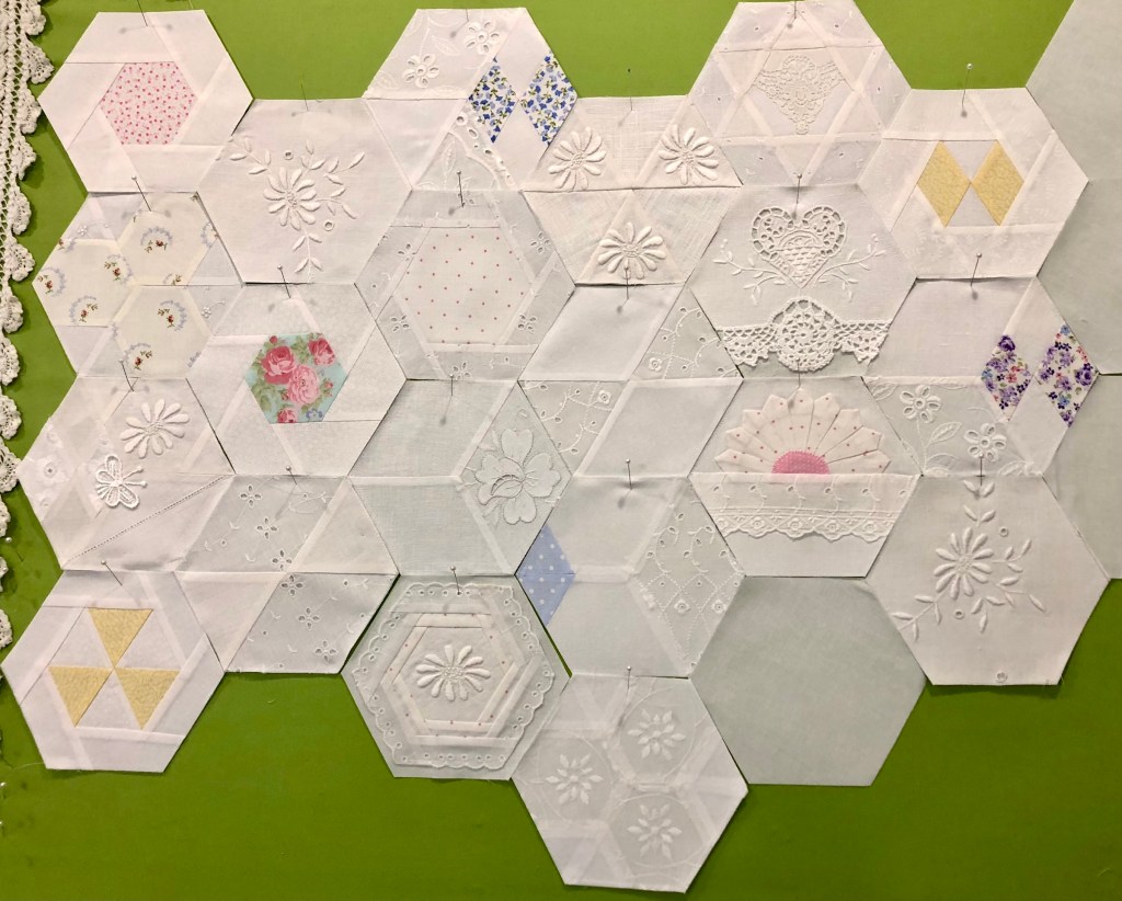 All of the full, half and quarter hexagons have been sewn together, I’m happy with the arrangement so my next step is to decide on a border.