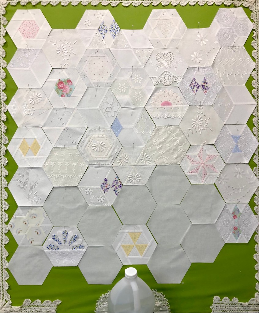 I think one of the hardest things was to not put a pop of quilting fabric in each of the hexagons. I’m using a small design board, it is propped up in a chair, the jug is holding the board in place. But see the hexagon right above the jug? The one that looks like an upside down radioactive symbol? That one made me chuckle every time I looked at it…