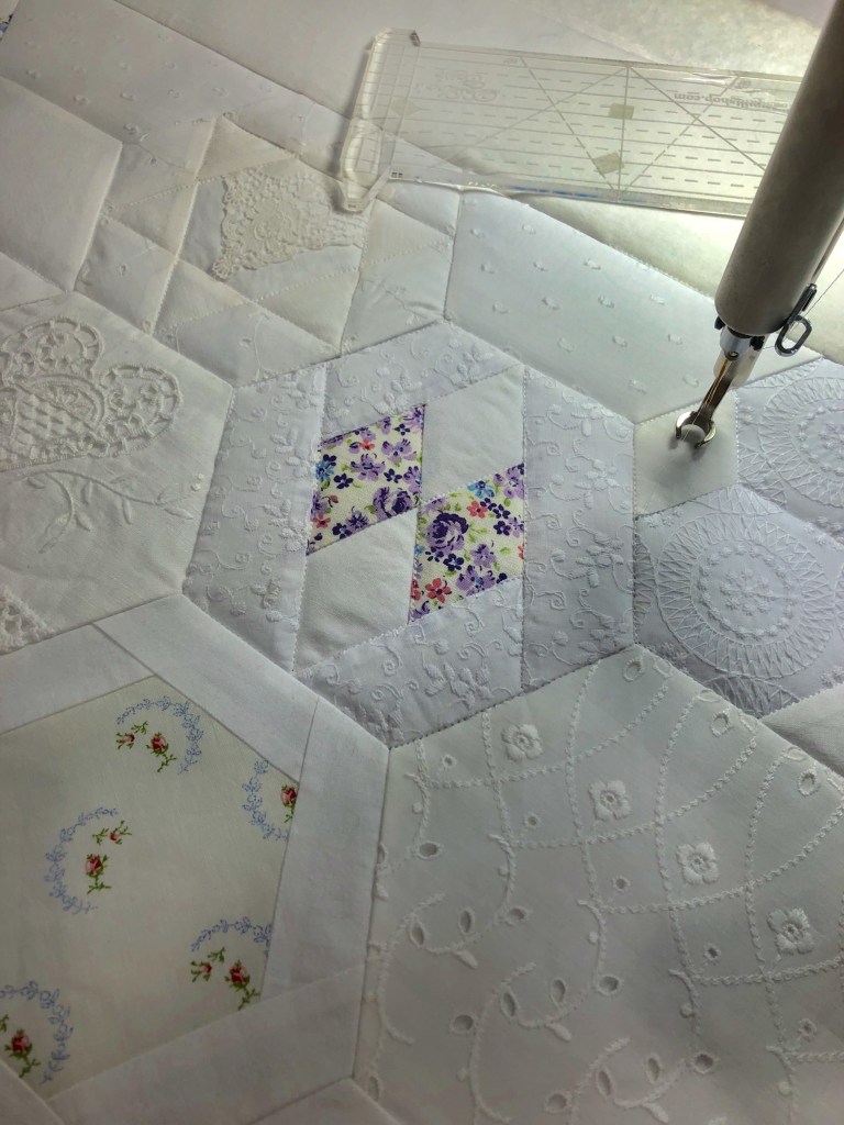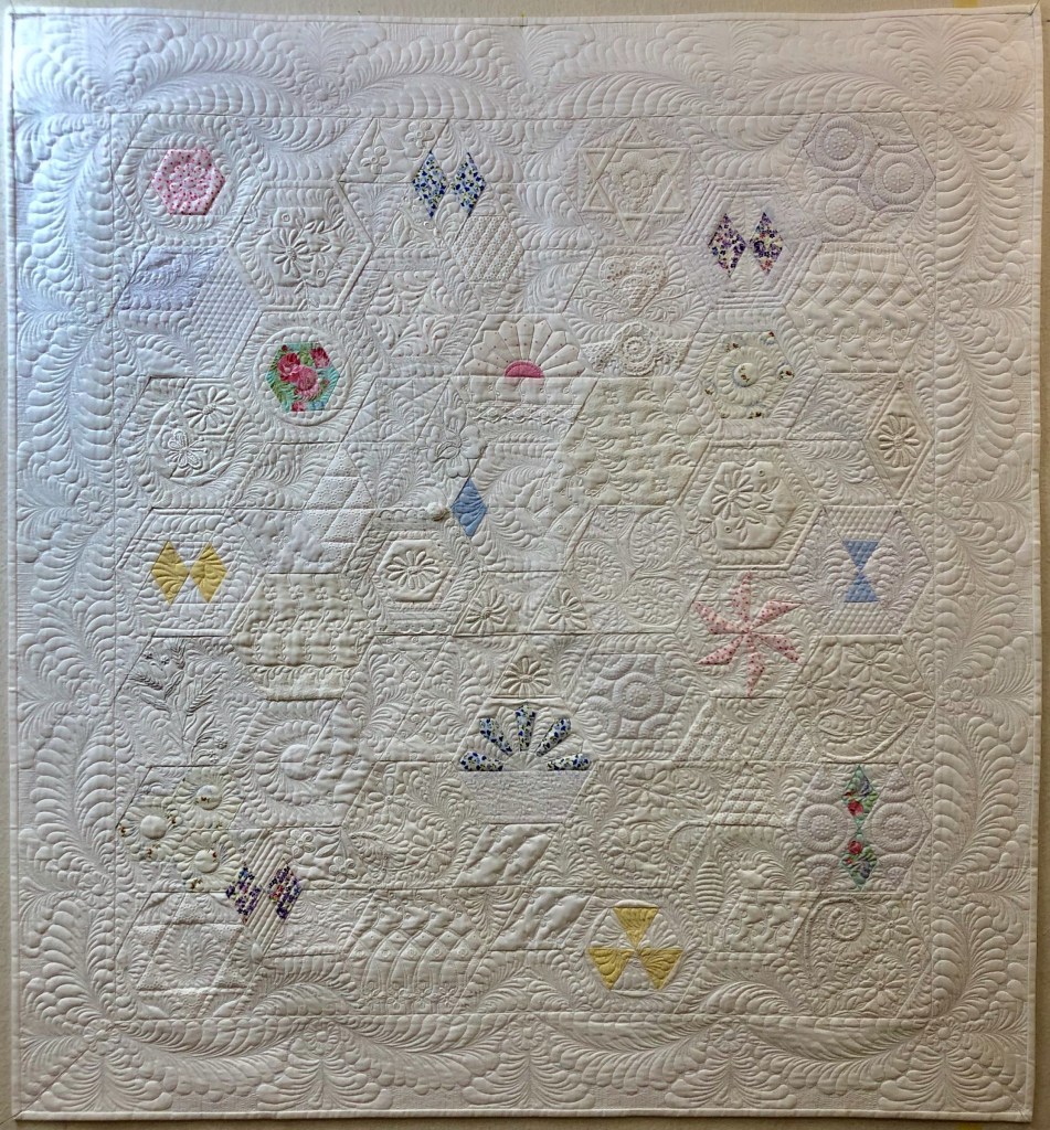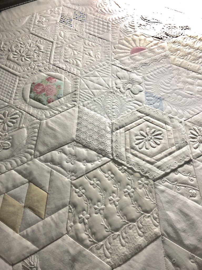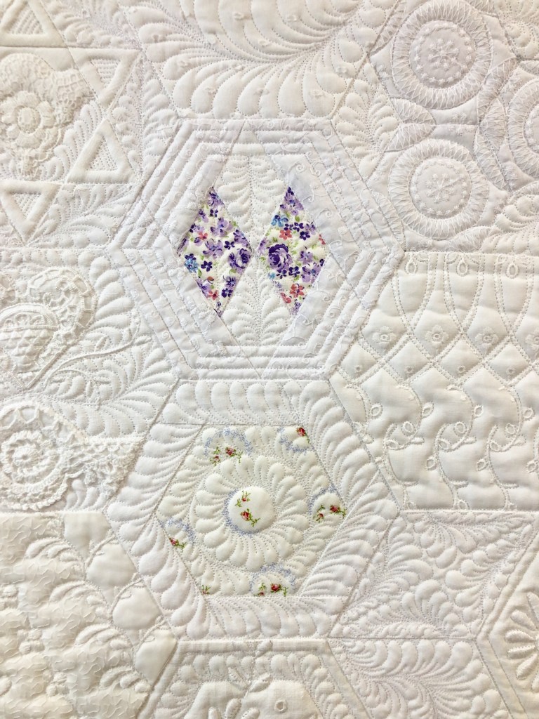 Remember the plain white border? Remember how I said I was going to leave my swag phase behind? I changed my mind for a couple of reasons. When I quilt I like to have in mind the idea of mixing straight lines with curved lines. I think of it as Hard and Soft quilting The hexagons and all their pieces are certainly straight lines; the Hard, and swags are the Soft.