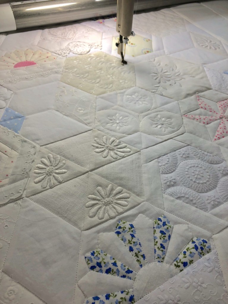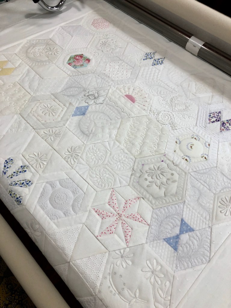 Scroll up 2 images and note how many seams there are in this relatively small (42×45”) quilt top. You can see that to stitch in the ditch (SID) I had quite the task ahead of me. Why do I SID? It serves several functions, it keeps all the blocks (hexagons) true to their shape, it secures the overall quilt sandwich for later intense custom quilting and it allows me to “work” with each block on the longarm prior to deciding how each will be quilted. SID is a very important step, take the time do do it right, you’ll never be sorry.
