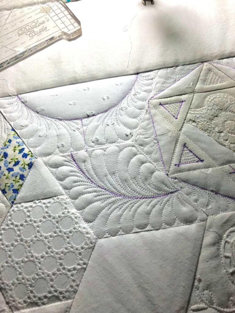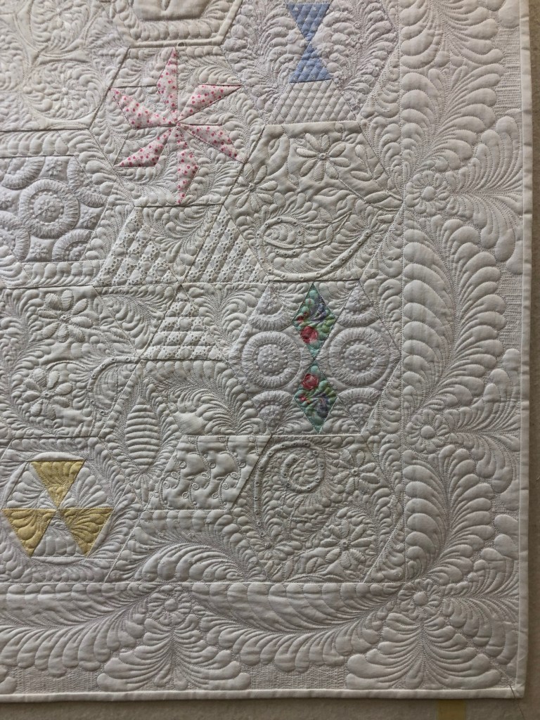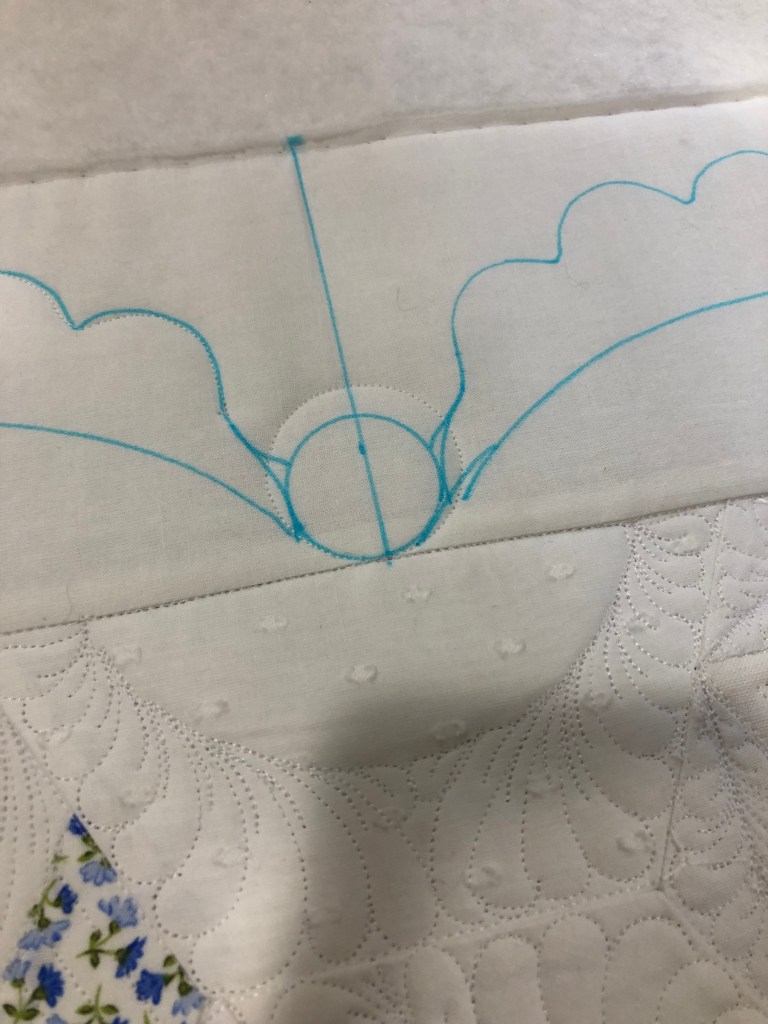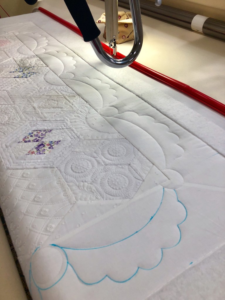 Way back when I was making this quilt (July 2018) I was in my “put scallop swags in every quilt border”phase. For a change I decided to leave this border empty and quilt a “to be determined later” design.