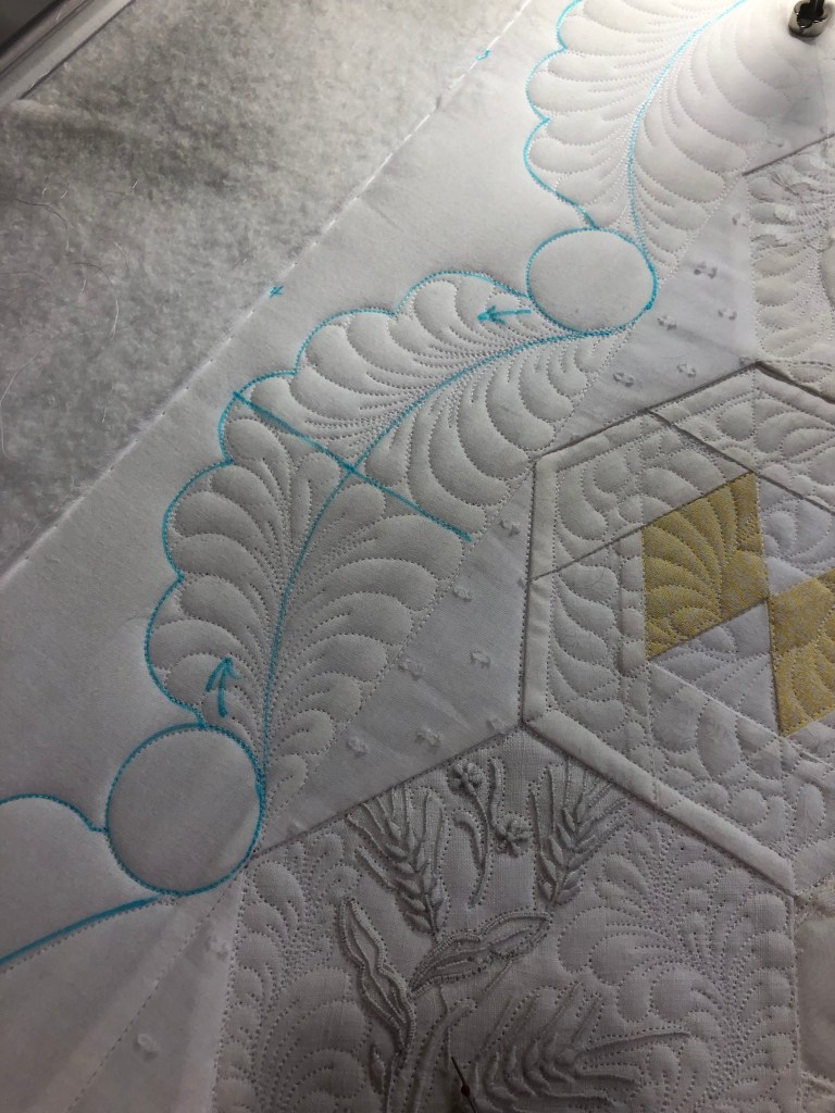 When I’m doing the quilting I have developed a symbol system. The two curved arrows in this picture above tell me I want a single curved stem of feathers as well as the direction they will be quilted. I’m using a very nice air/water erasable marking pen by Leonis.
