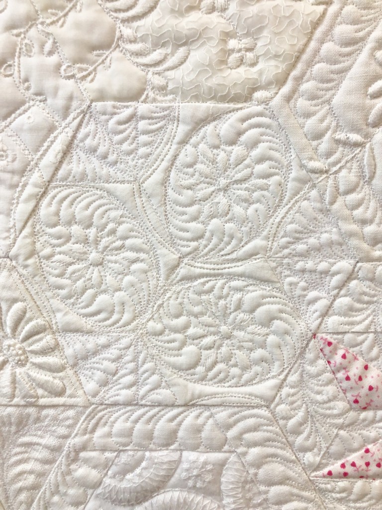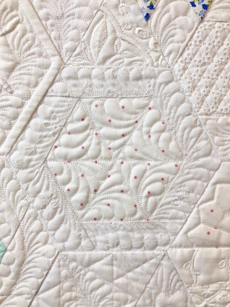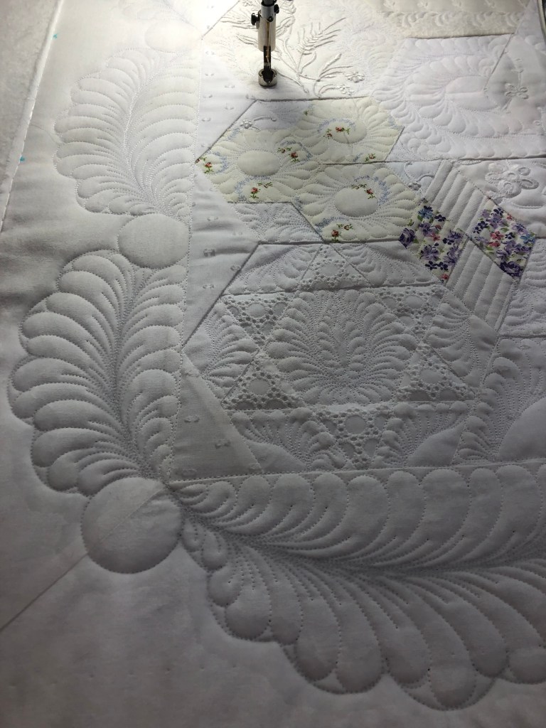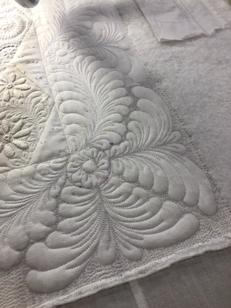 I was especially pleased at how the quilted swags fit so nicely at the corners. And notice how much more depth the little feathers have after I quilted in a vein in each one.