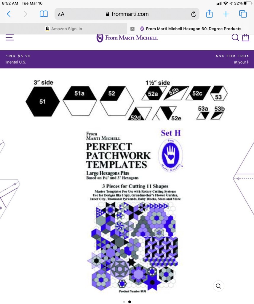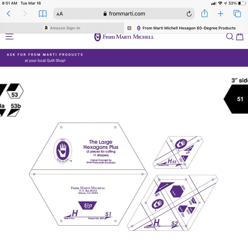 The entire quilt top is machine pieces. One of the things I LOVE about the Marti Michell templates is they allow you to easily and accurately mark the quarter inch seam allowance points! I can’t imagine piecing this quilt without these markings! Click on this link to take you to her web site: https://frommarti.com/collections/template-sets/products/template-set-h-large-hexagons