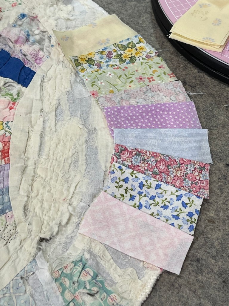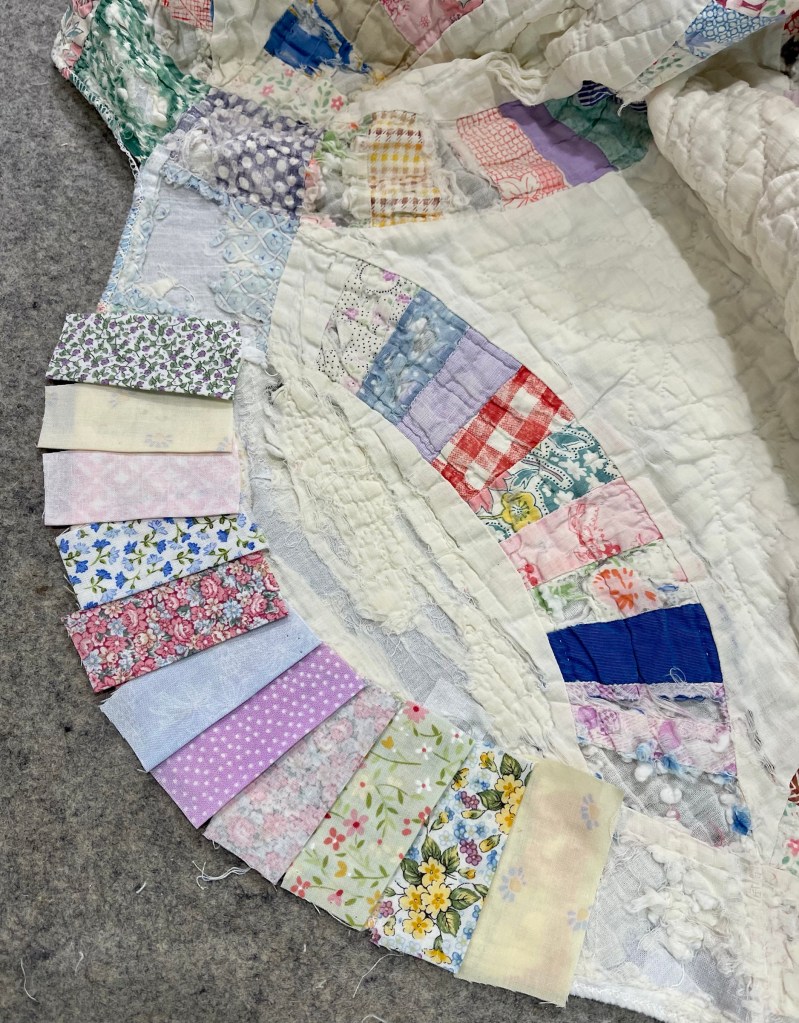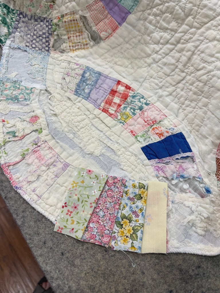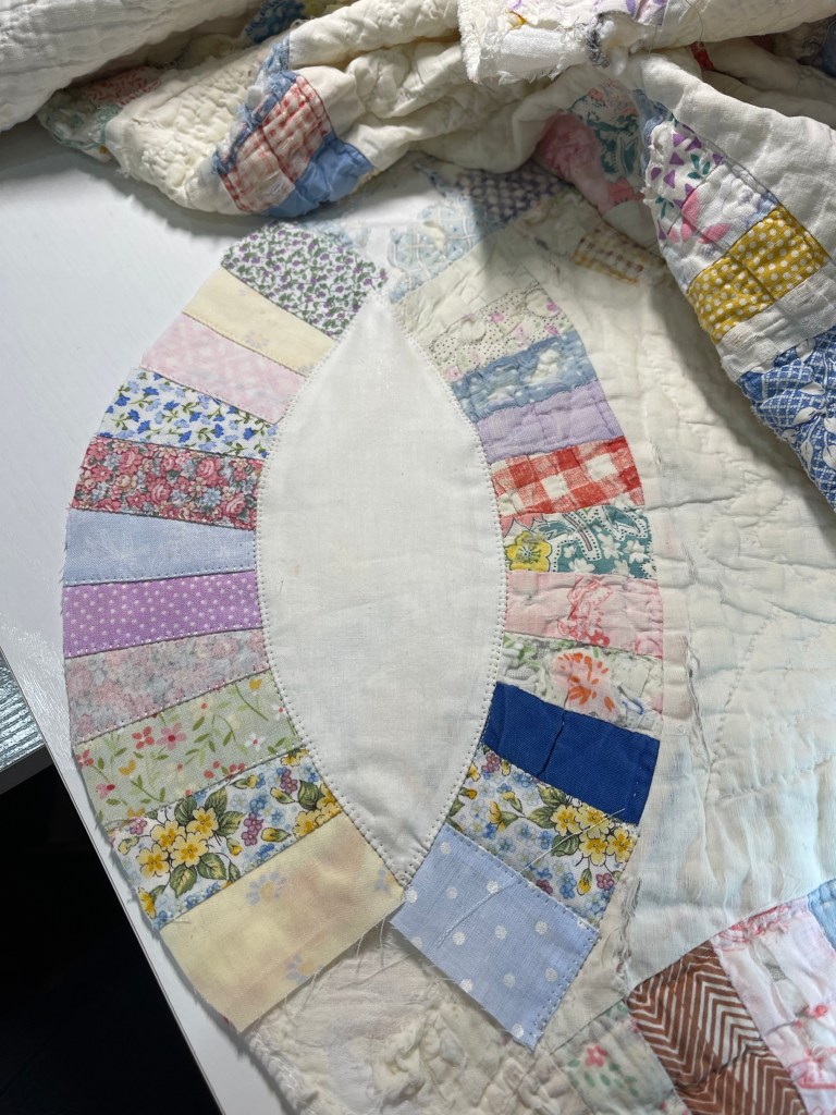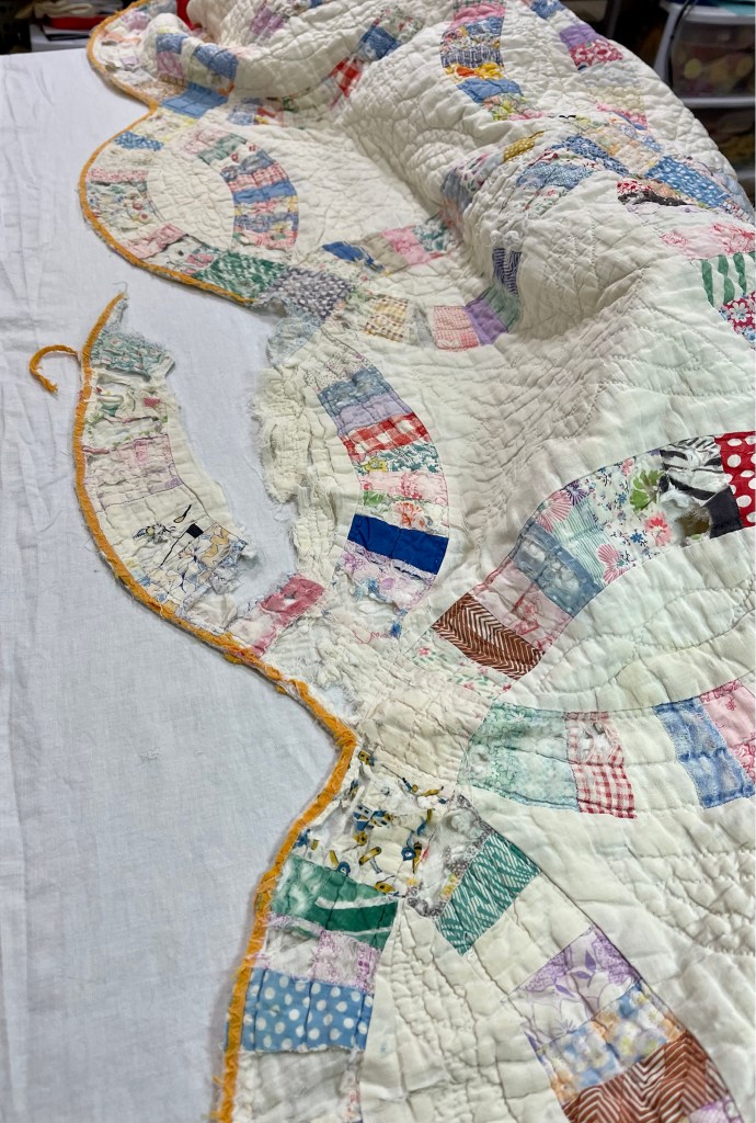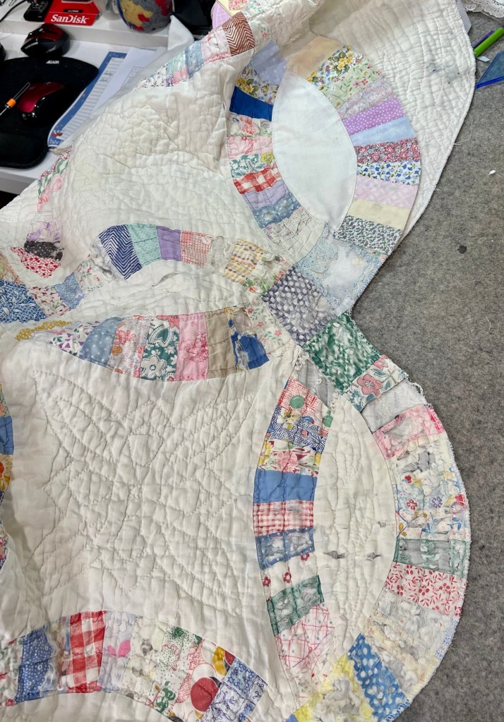 Have you read the previous 2 posts about the “saving” process going on with this vintage well used and well loved Double Wedding Ring quilt? In this post I am going to take you through the steps of applying the false back at the top and bottom edges as well as making repairs to fabrics that have become ragged, torn, frayed or simply are missing.
