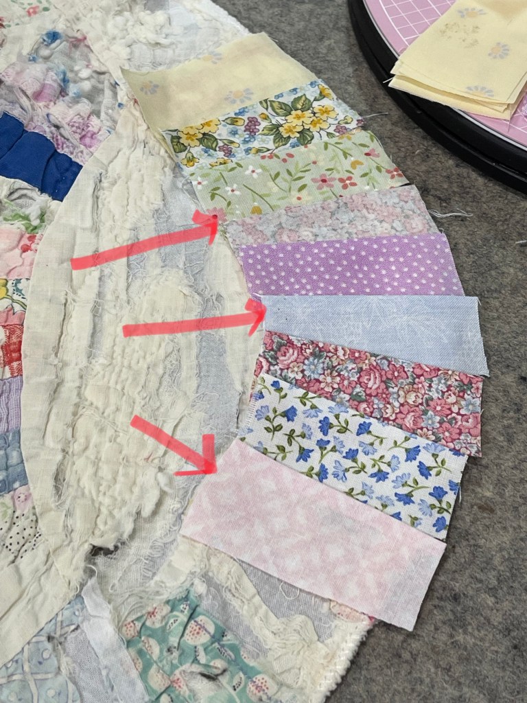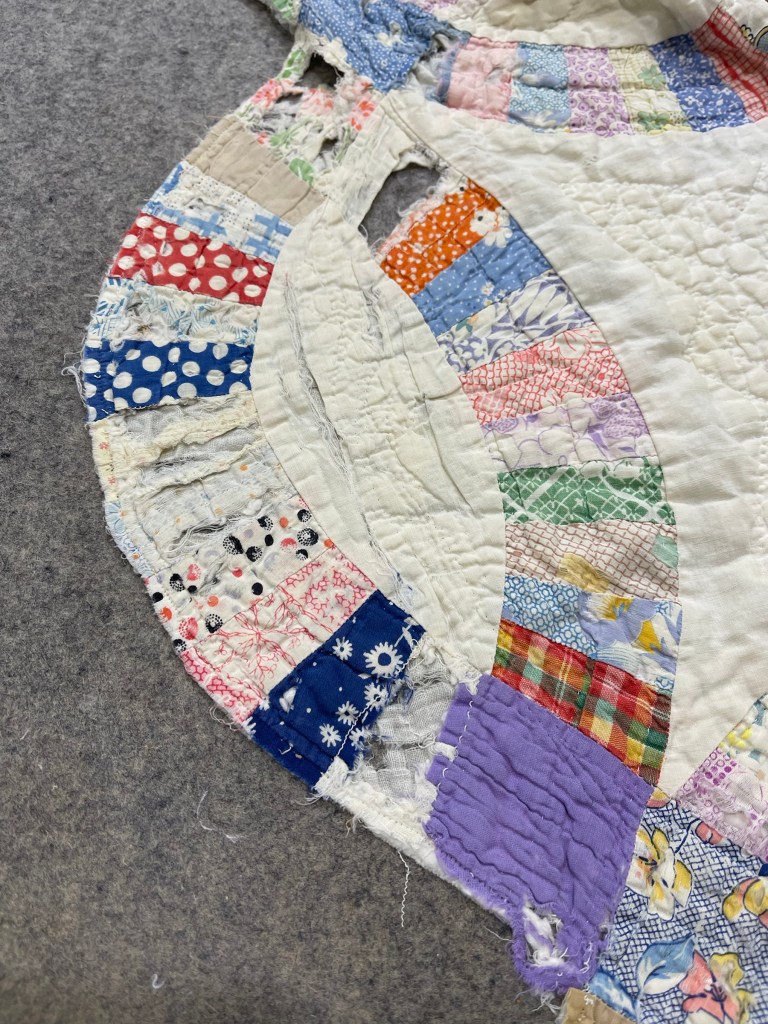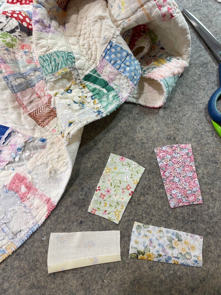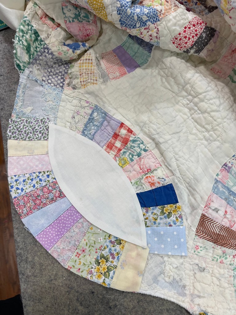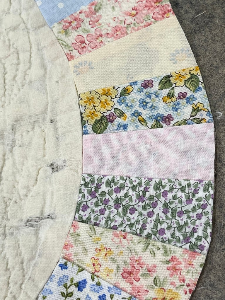 Have you read the previous 2 posts about the “saving” process going on with this vintage well used and well loved Double Wedding Ring quilt? In this post I am going to take you through the steps of applying the false back at the top and bottom edges as well as making repairs to fabrics that have become ragged, torn, frayed or simply are missing.