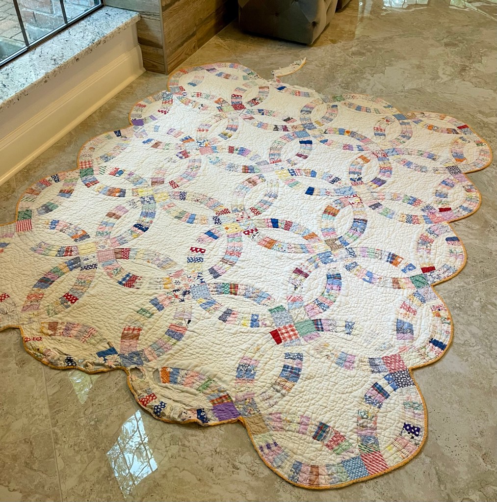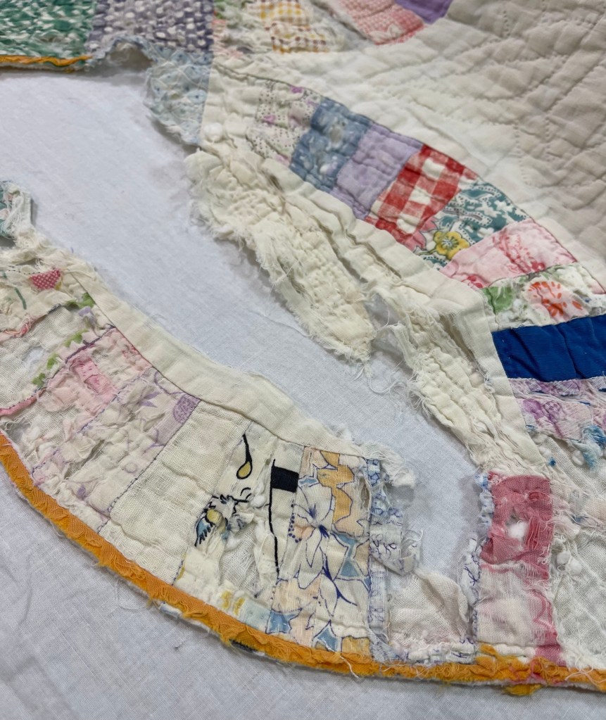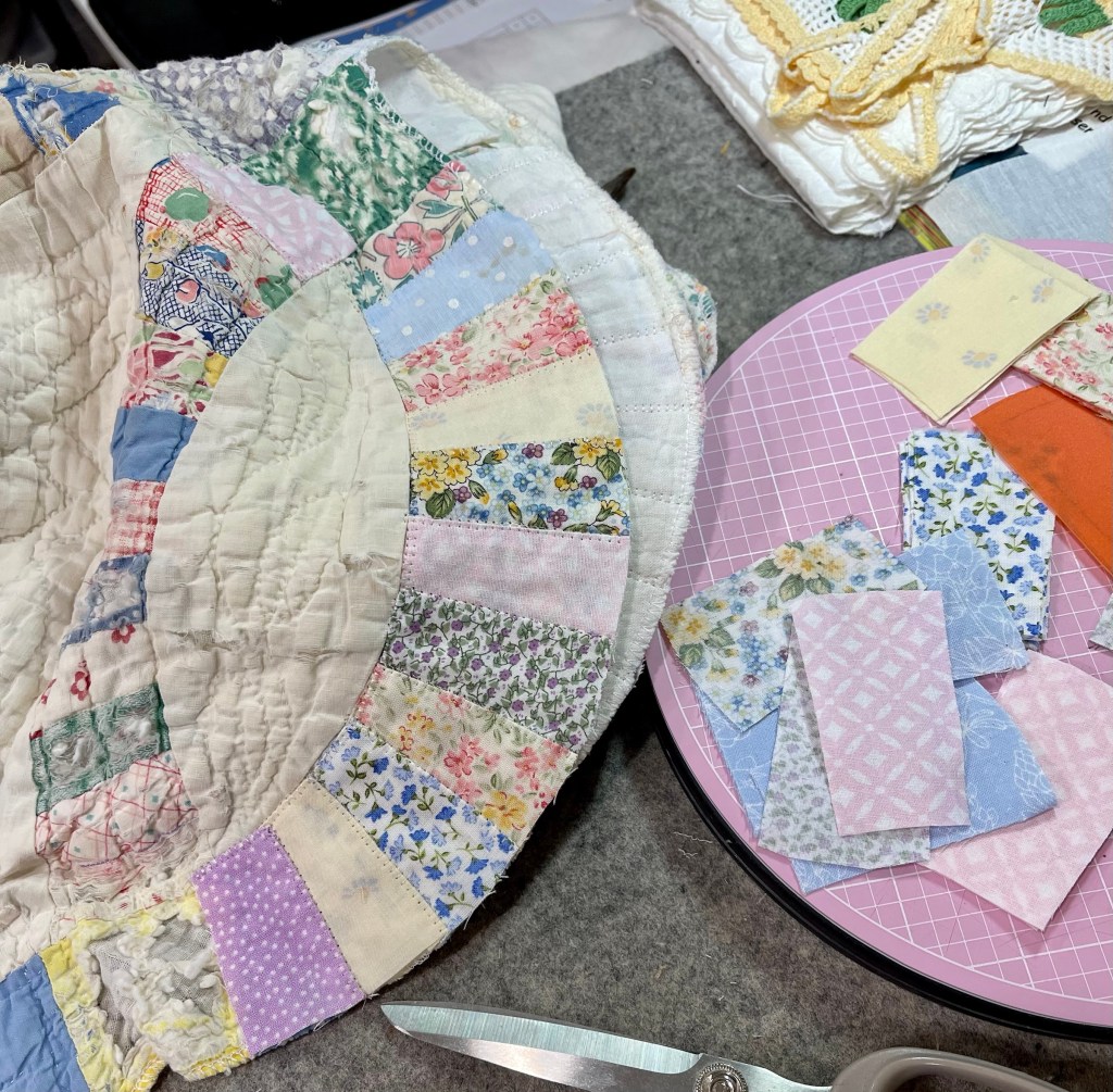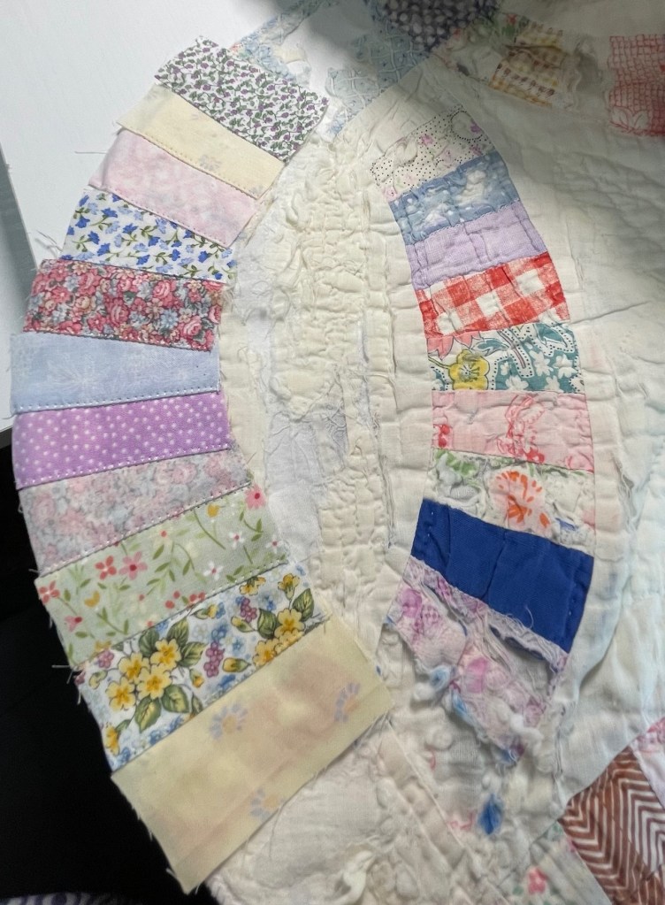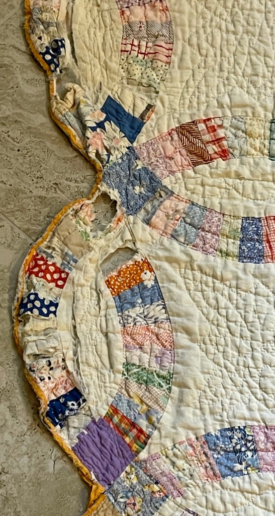 Have you read the previous 2 posts about the “saving” process going on with this vintage well used and well loved Double Wedding Ring quilt? In this post I am going to take you through the steps of applying the false back at the top and bottom edges as well as making repairs to fabrics that have become ragged, torn, frayed or simply are missing.