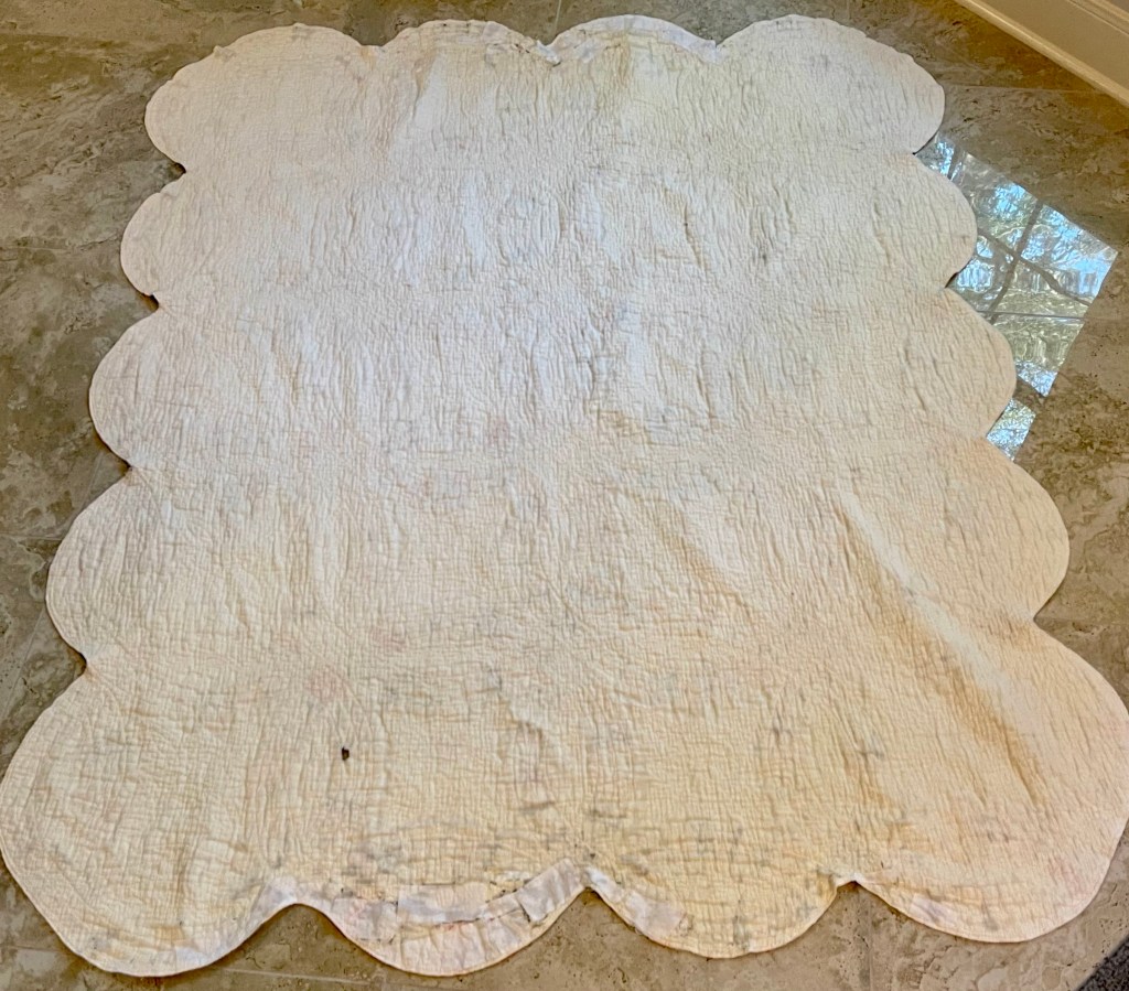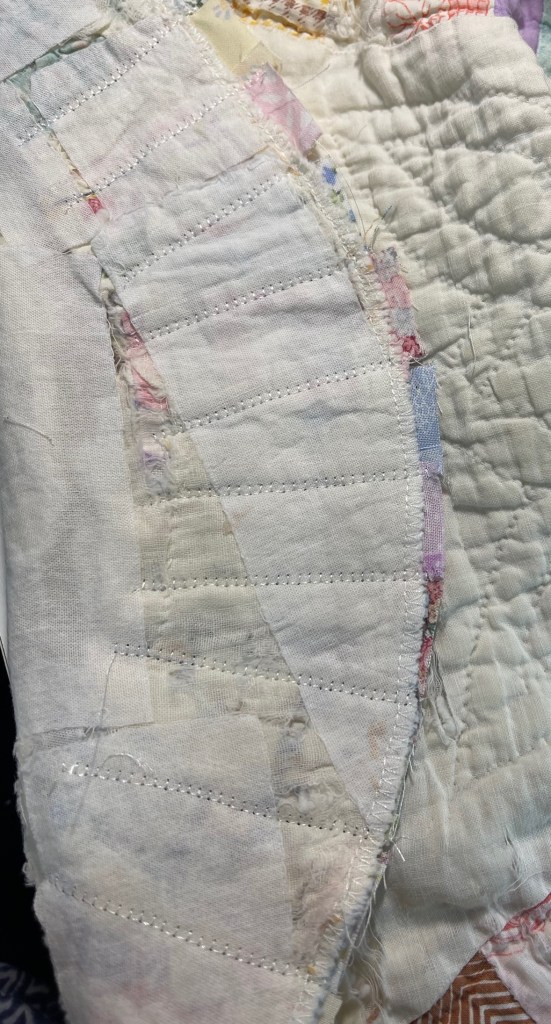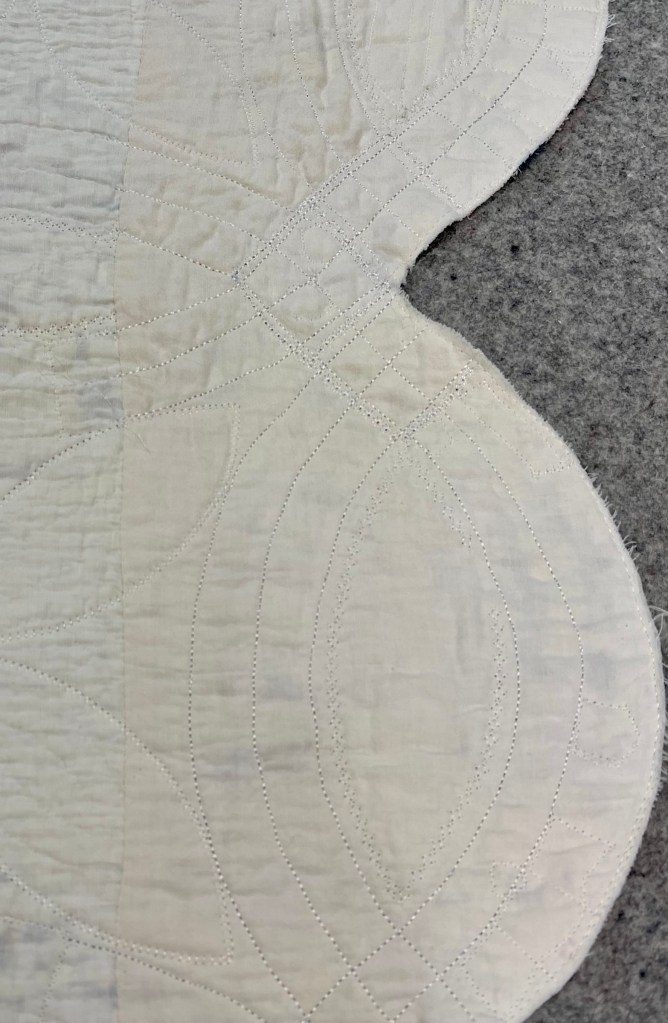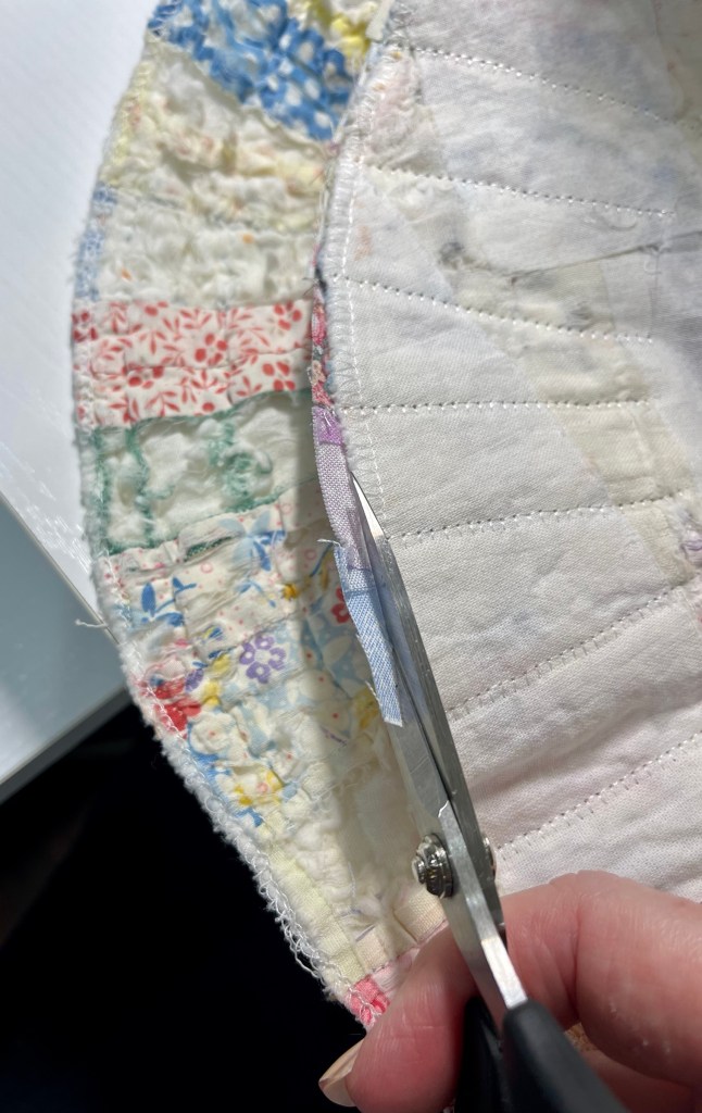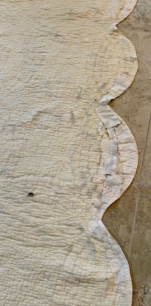 I needed to secure the strip of muslin to the quilt so I carefully stitched it down by hand at the folded edge. How did I handle the scalloped edge? I carefully pinned the outside quilt edges to the new false back muslin piece and then machine zig-zagged the outer scalloped edge. Once I had this machine stitching completed I carefully trimmed away the excess muslin.