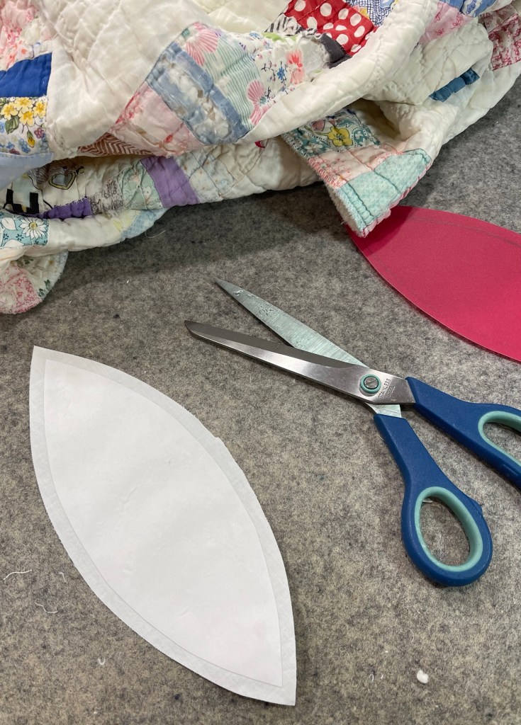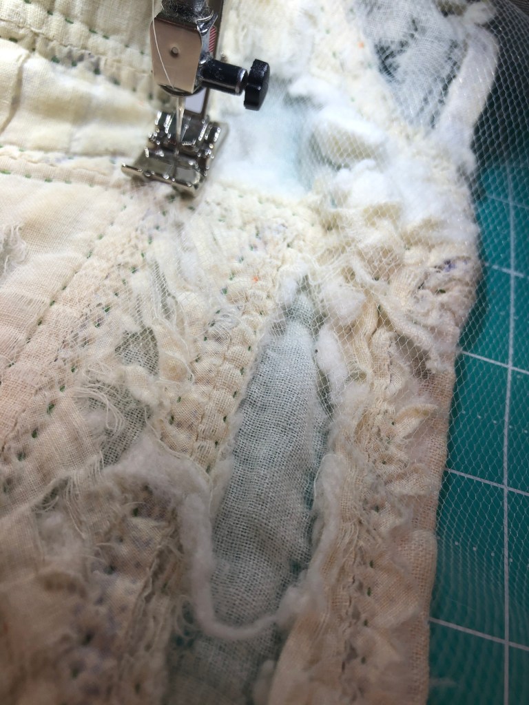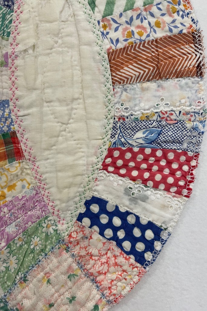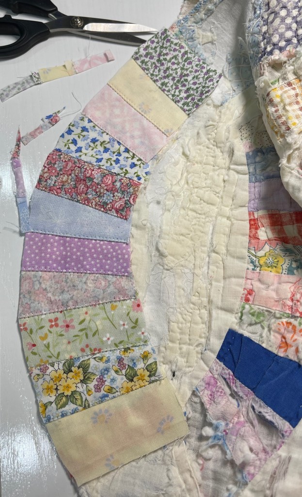 I needed to secure the strip of muslin to the quilt so I carefully stitched it down by hand at the folded edge. How did I handle the scalloped edge? I carefully pinned the outside quilt edges to the new false back muslin piece and then machine zig-zagged the outer scalloped edge. Once I had this machine stitching completed I carefully trimmed away the excess muslin.