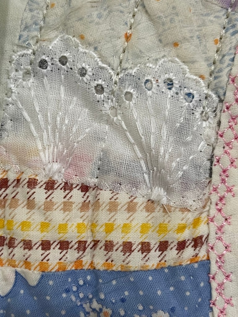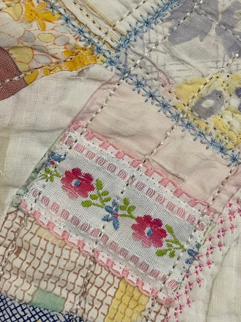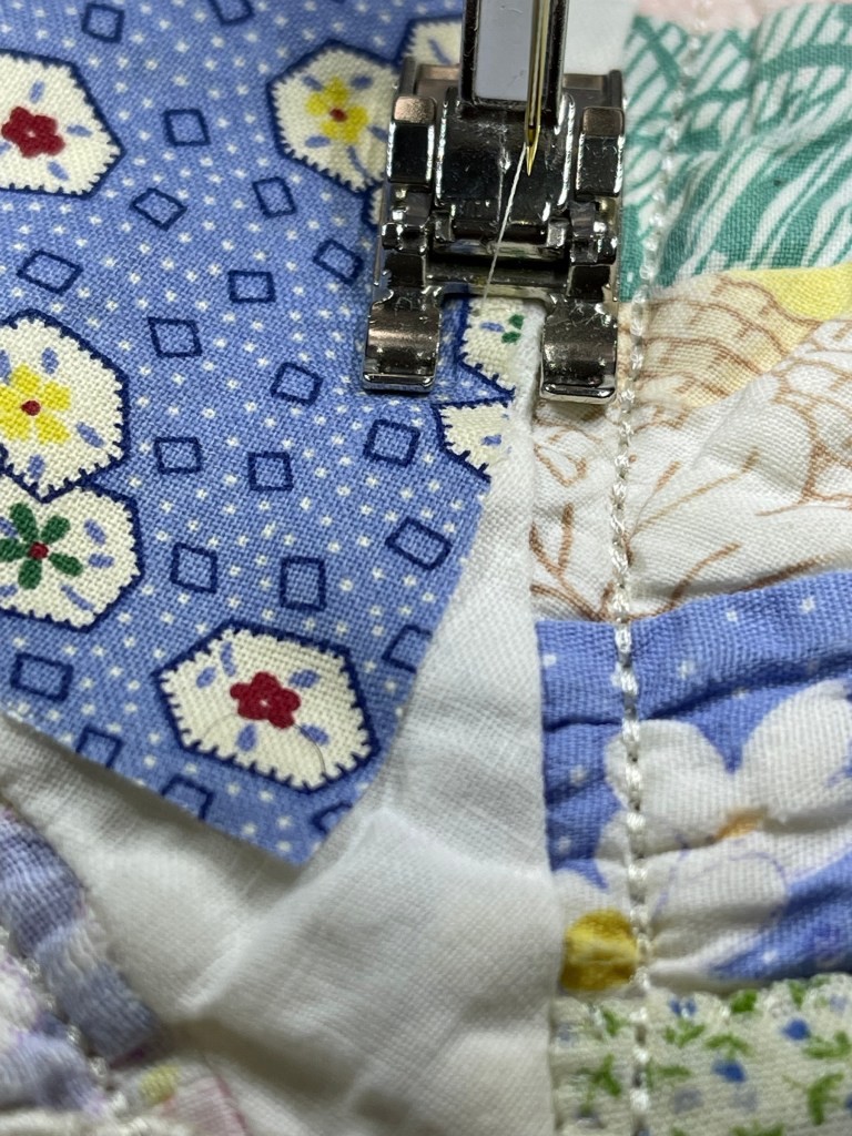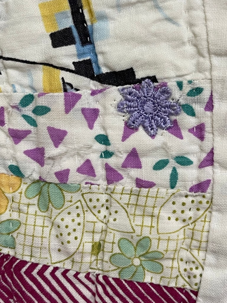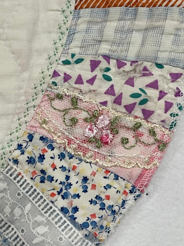 I welcomed the opportunity to experiment with the built in decorative stitches of my sewing machine. This quilt project was perfect for “decorative stitches reinforcement”. Let me give you a heads up: if you plan to stitch on a vintage quilt such as I did, it is imperative to clean out the area underneath your needle/throat plate and around your bobbin OFTEN! It is amazing the amount of lint that the needle and thread carry through two your bobbin area of your sewing machine.