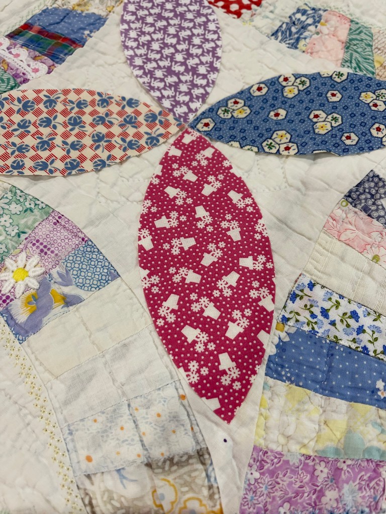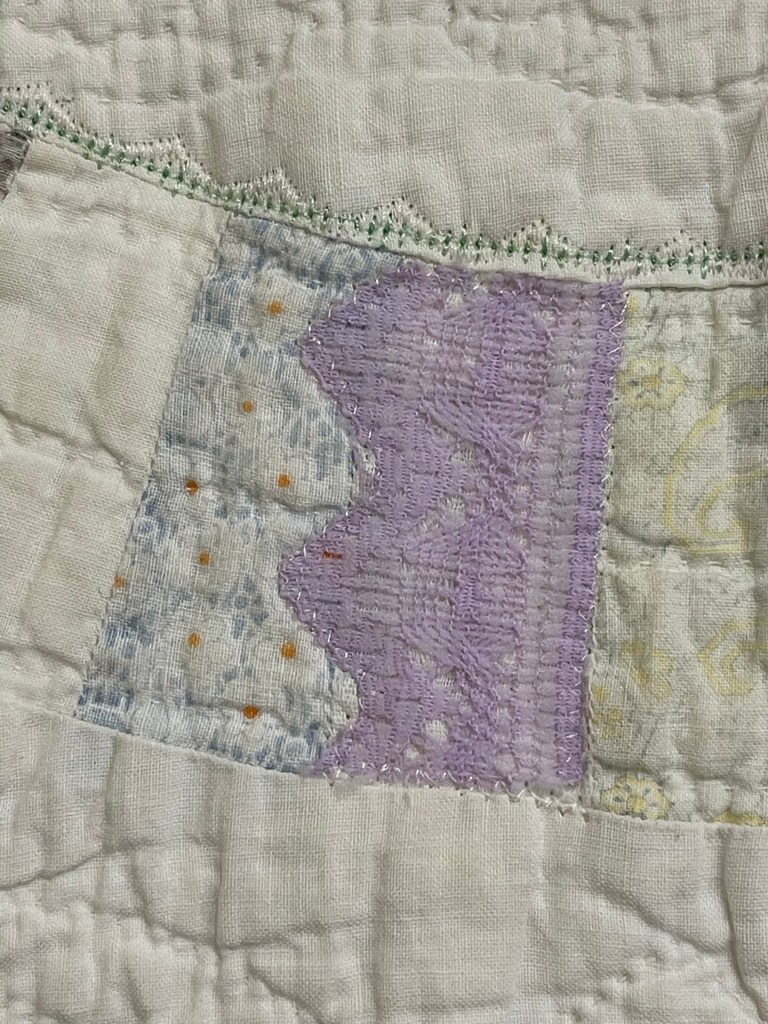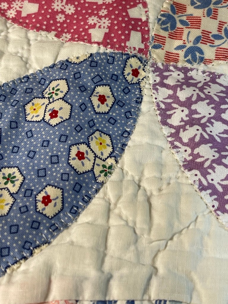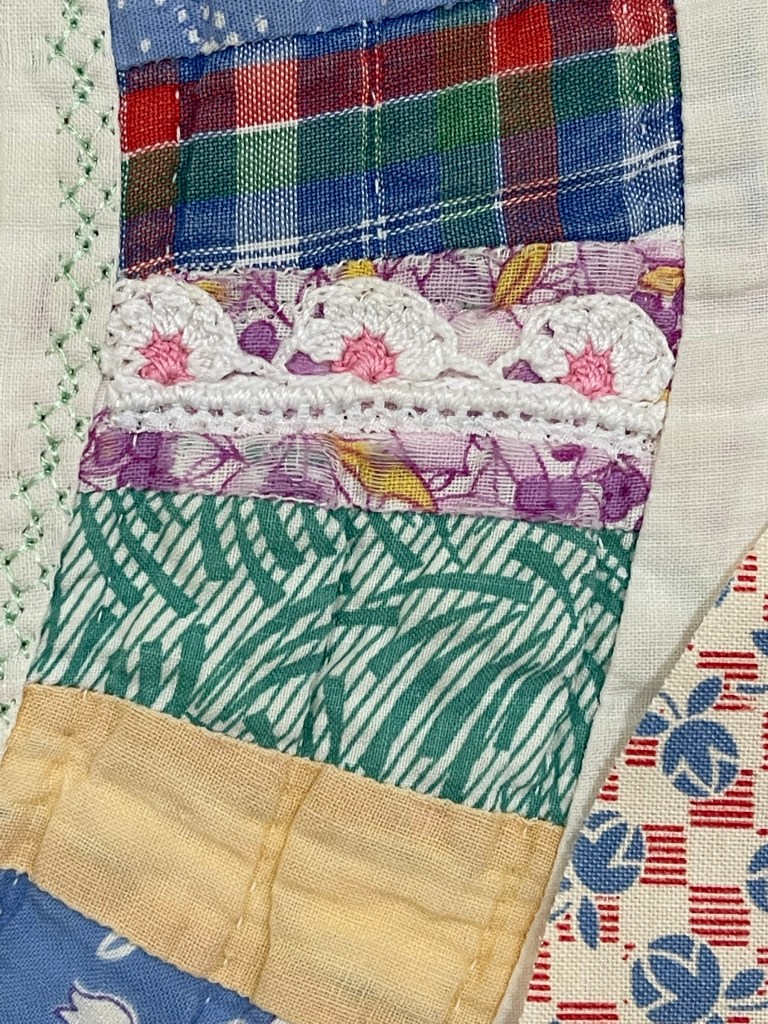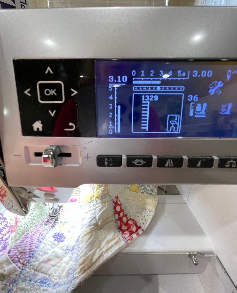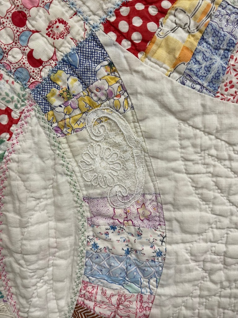 I welcomed the opportunity to experiment with the built in decorative stitches of my sewing machine. This quilt project was perfect for “decorative stitches reinforcement”. Let me give you a heads up: if you plan to stitch on a vintage quilt such as I did, it is imperative to clean out the area underneath your needle/throat plate and around your bobbin OFTEN! It is amazing the amount of lint that the needle and thread carry through two your bobbin area of your sewing machine.