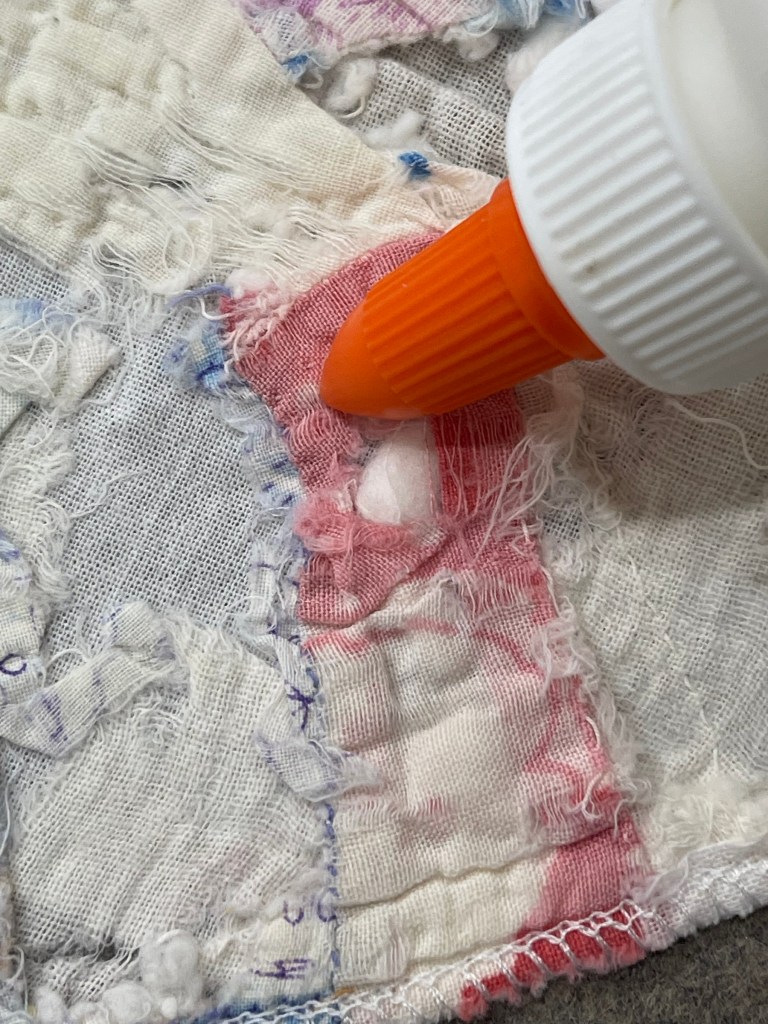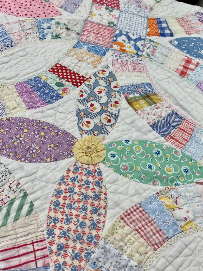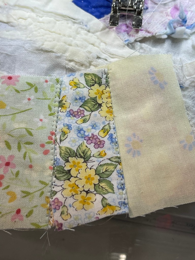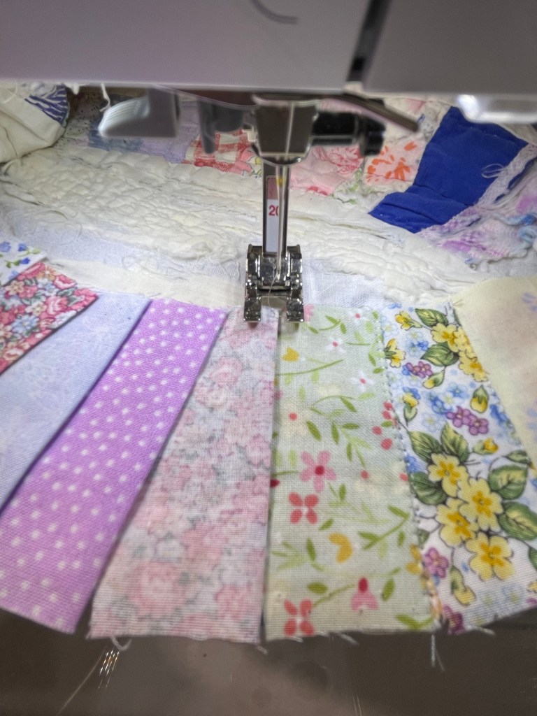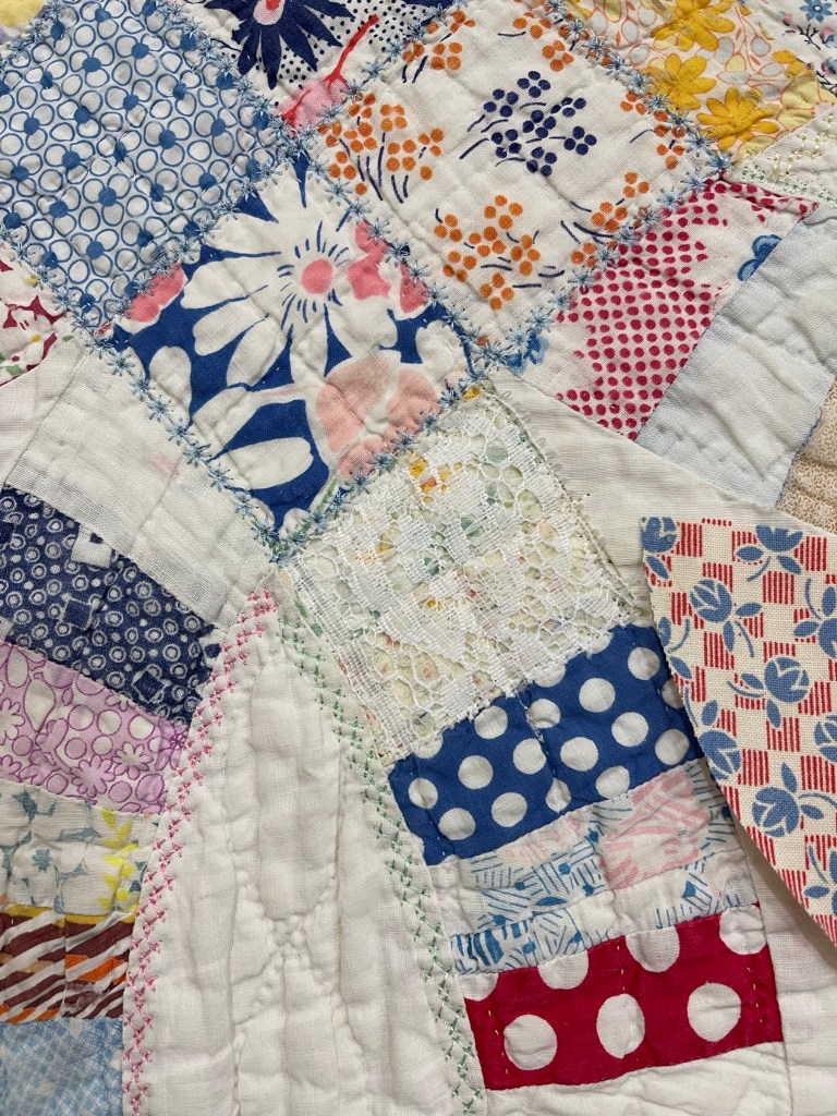 I welcomed the opportunity to experiment with the built in decorative stitches of my sewing machine. This quilt project was perfect for “decorative stitches reinforcement”. Let me give you a heads up: if you plan to stitch on a vintage quilt such as I did, it is imperative to clean out the area underneath your needle/throat plate and around your bobbin OFTEN! It is amazing the amount of lint that the needle and thread carry through two your bobbin area of your sewing machine.