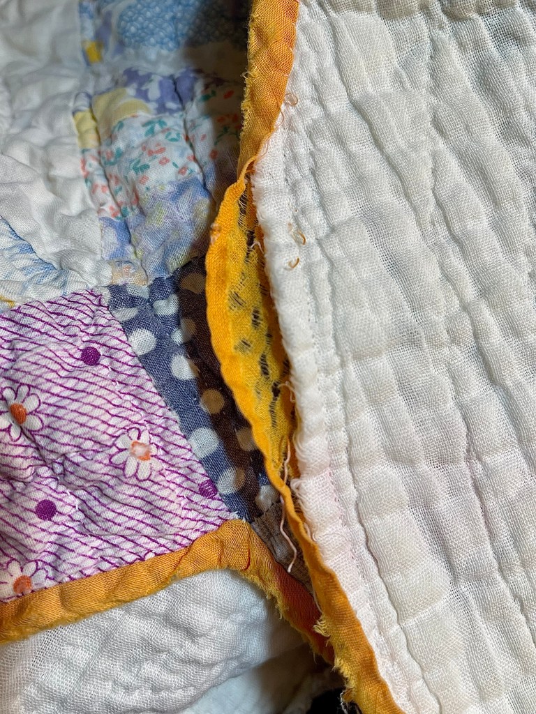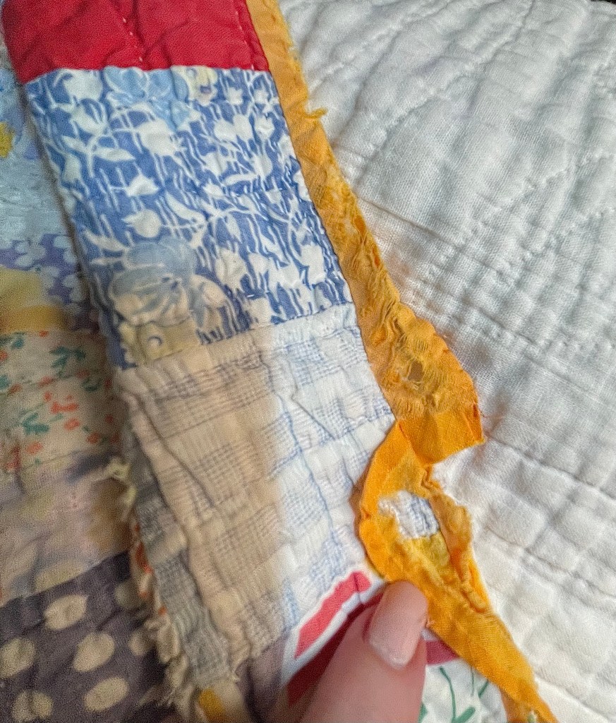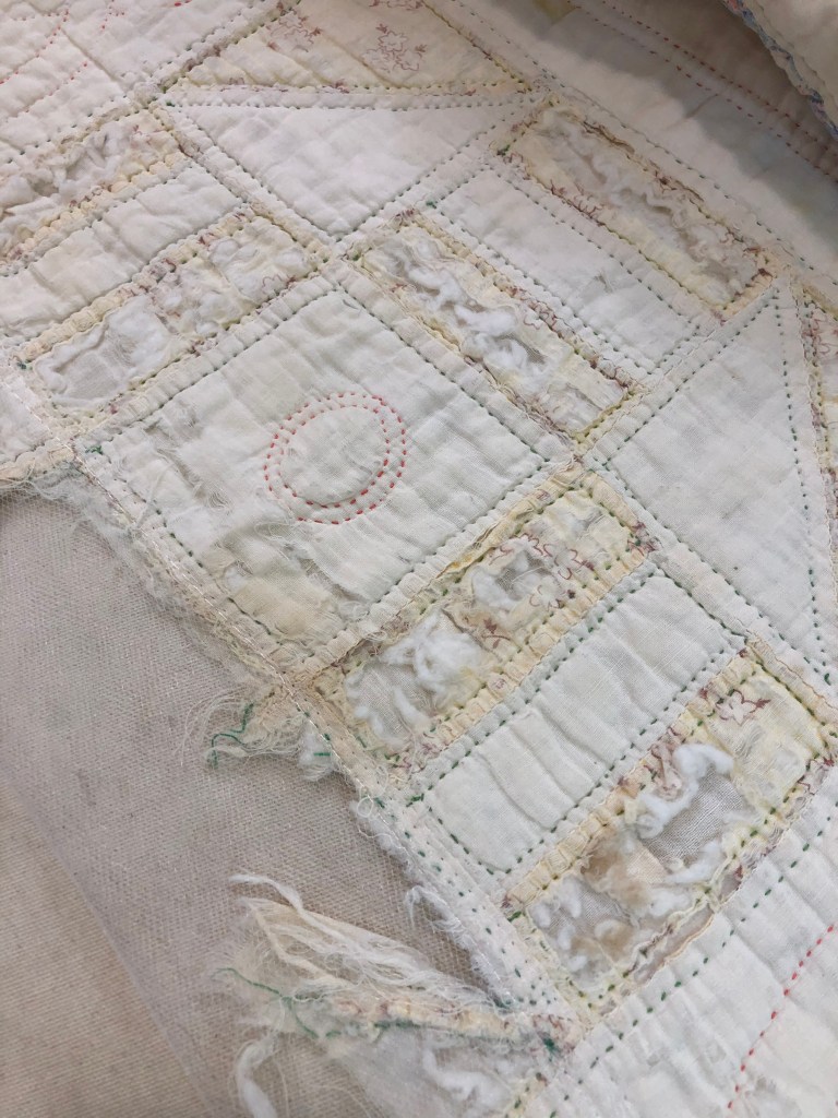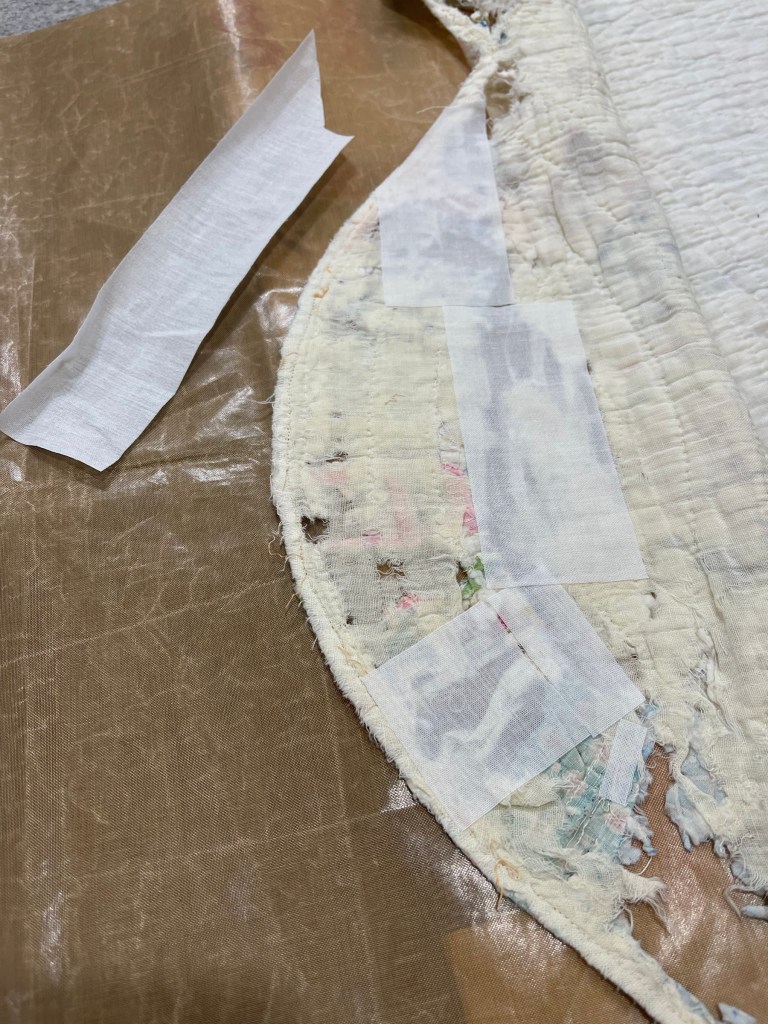 Let’s start with the false back. If you remember, both the front and back of the quilt top and bottom were in very bad shape. With the front edges repaired, I needed to address the back.