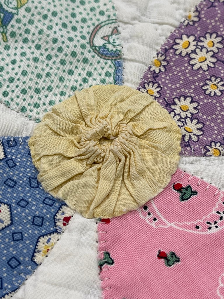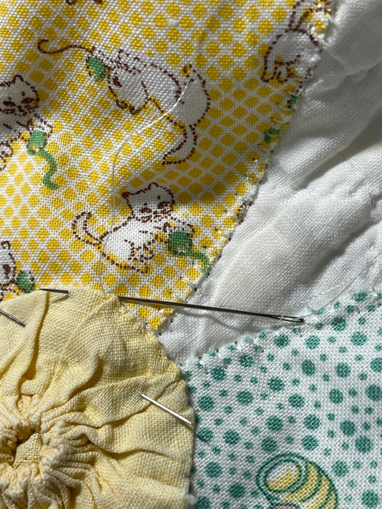 Once all the melons were stitched I knew I needed something in the center were the four points meet. Vintage yellow yo-yo’s to the rescue!