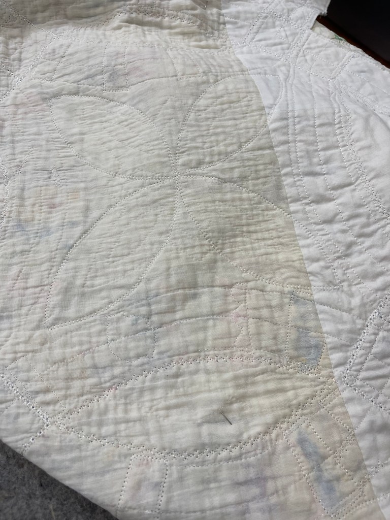 Just to the right of the green line above you can see a seam line? For this edge of the quilt I was fortunate enough to have a length of muslin that very closely resembles the original quilt backing. I folded over a quarter inch, pressed it in place, carefully placed the length of muslin across the entire quilt top edge and pinned it into place.