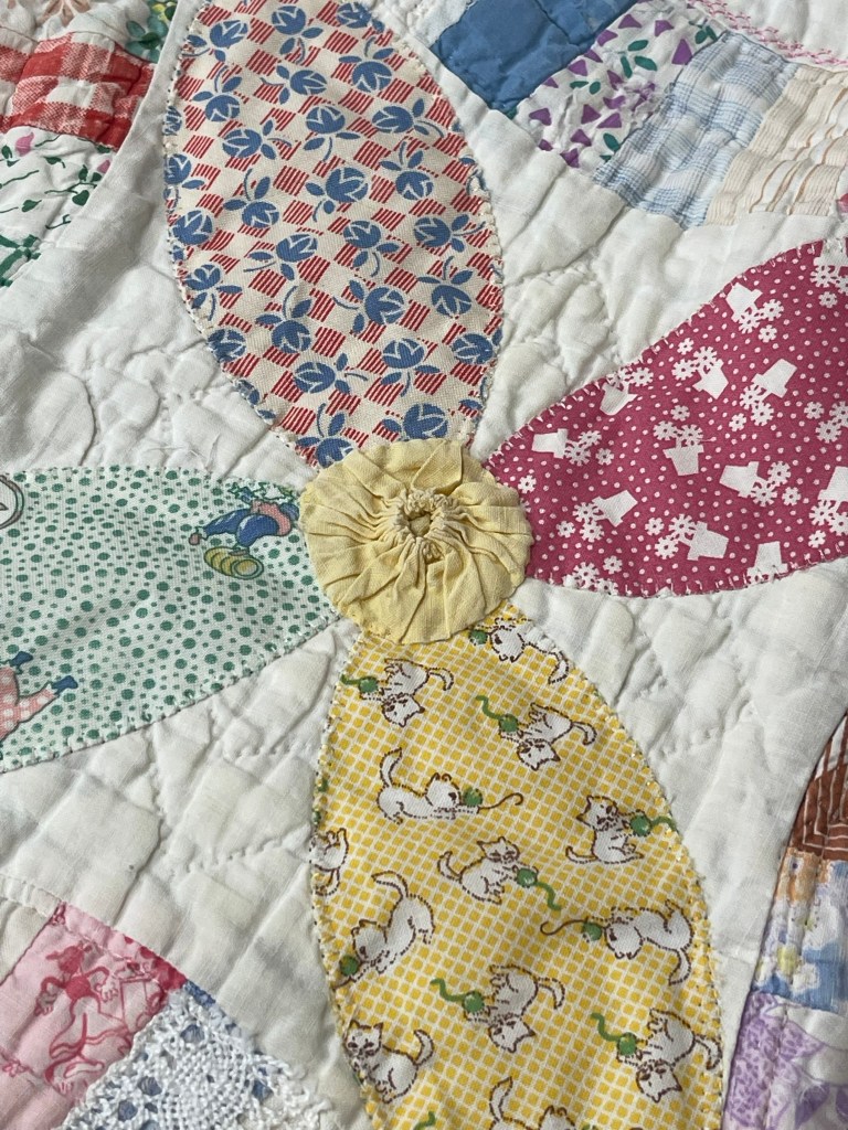 The yo-yo’s were sewn on by hand…so much easier than sewing tight circles of applique with my sewing machine.