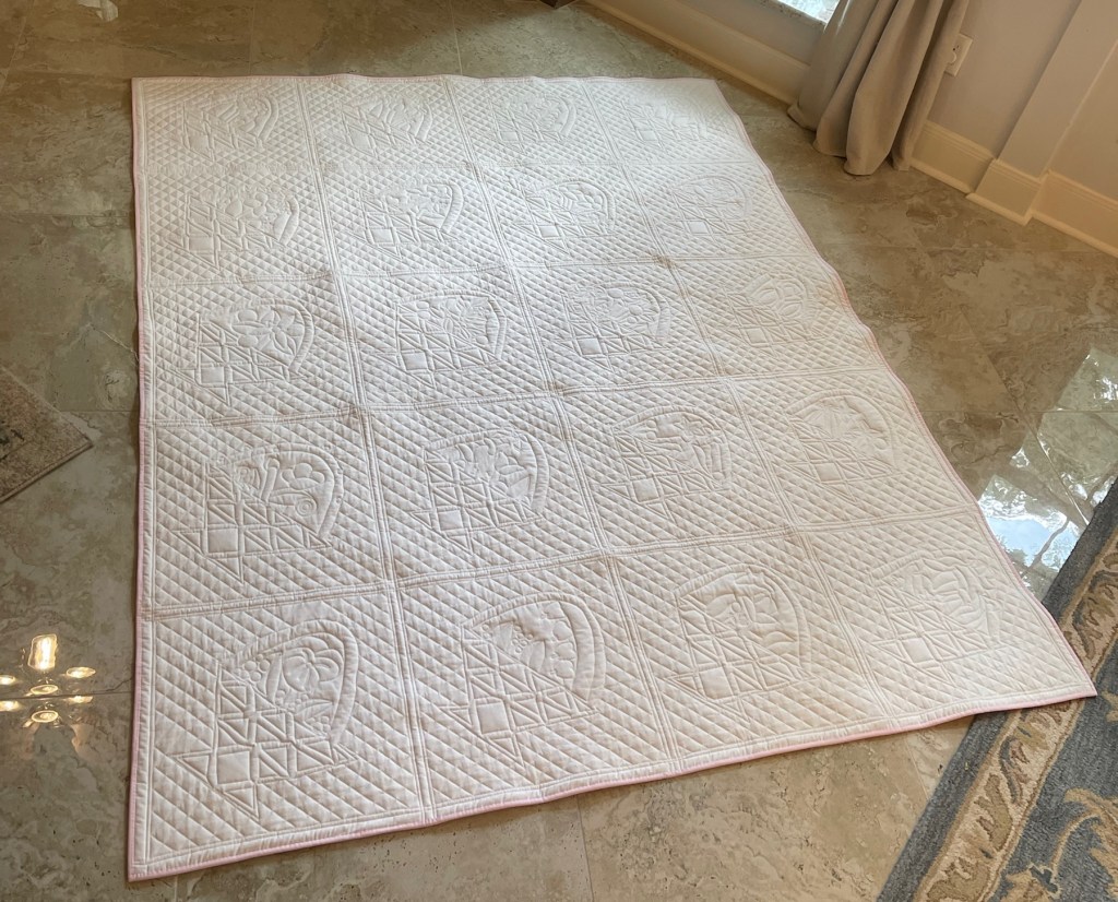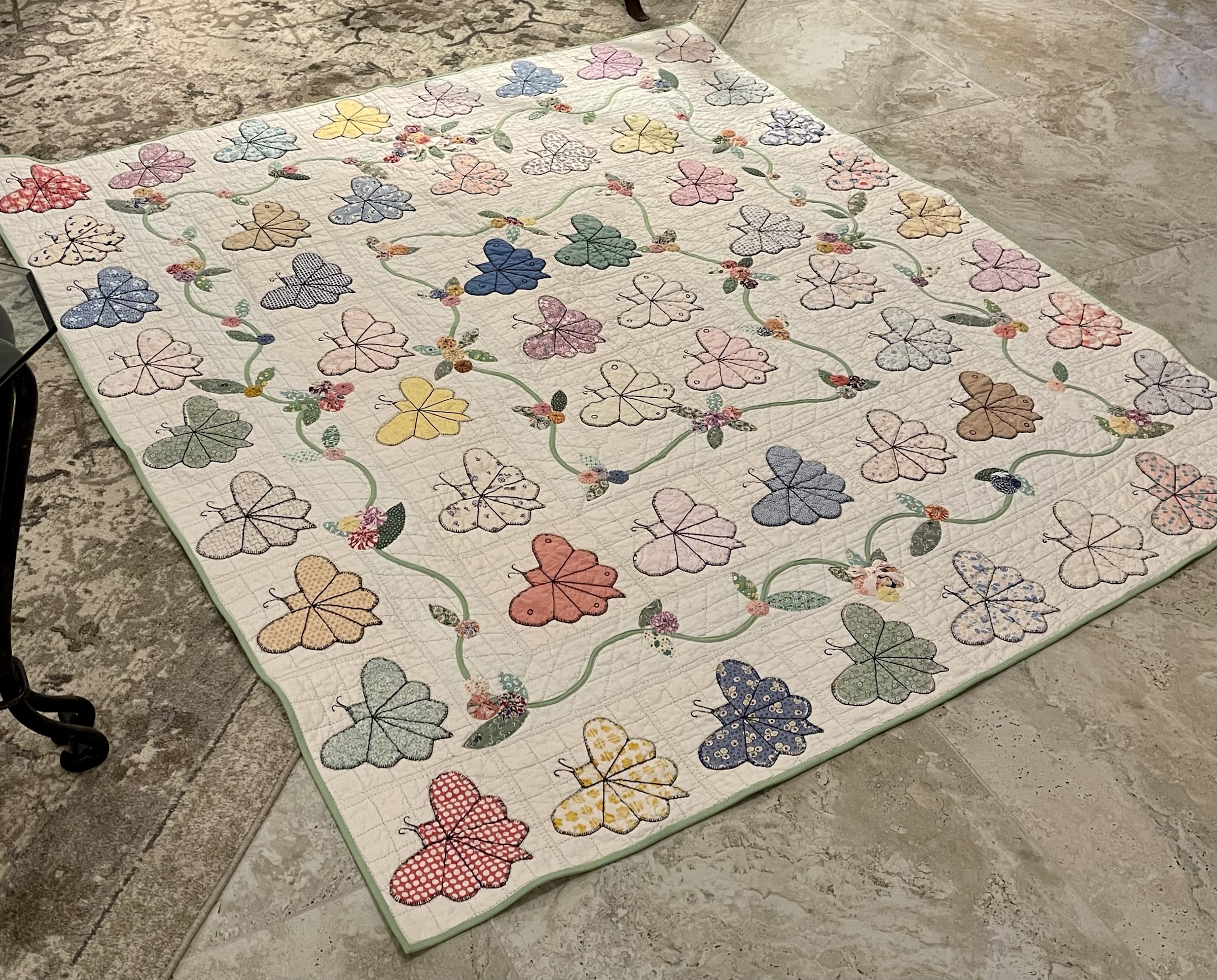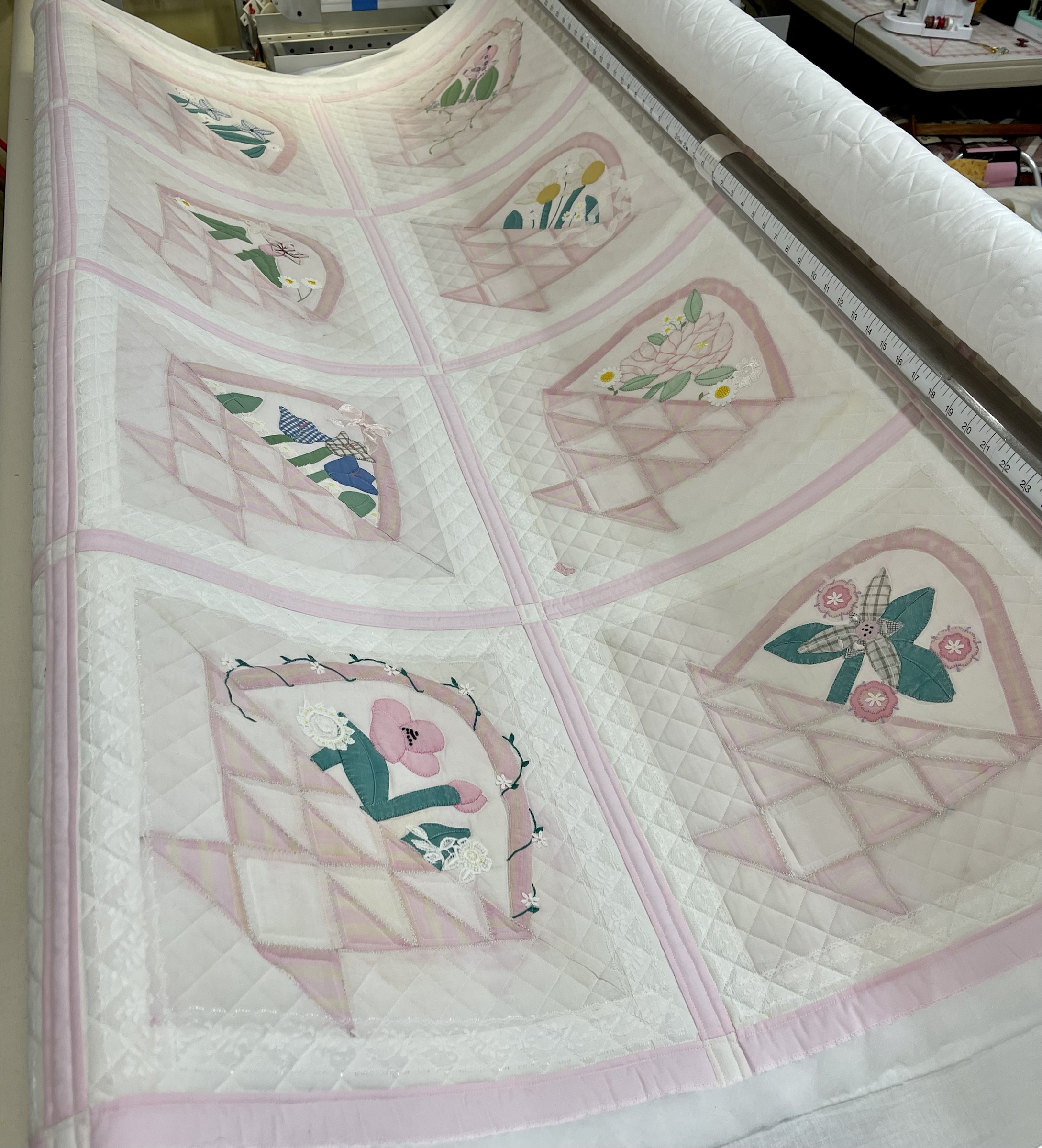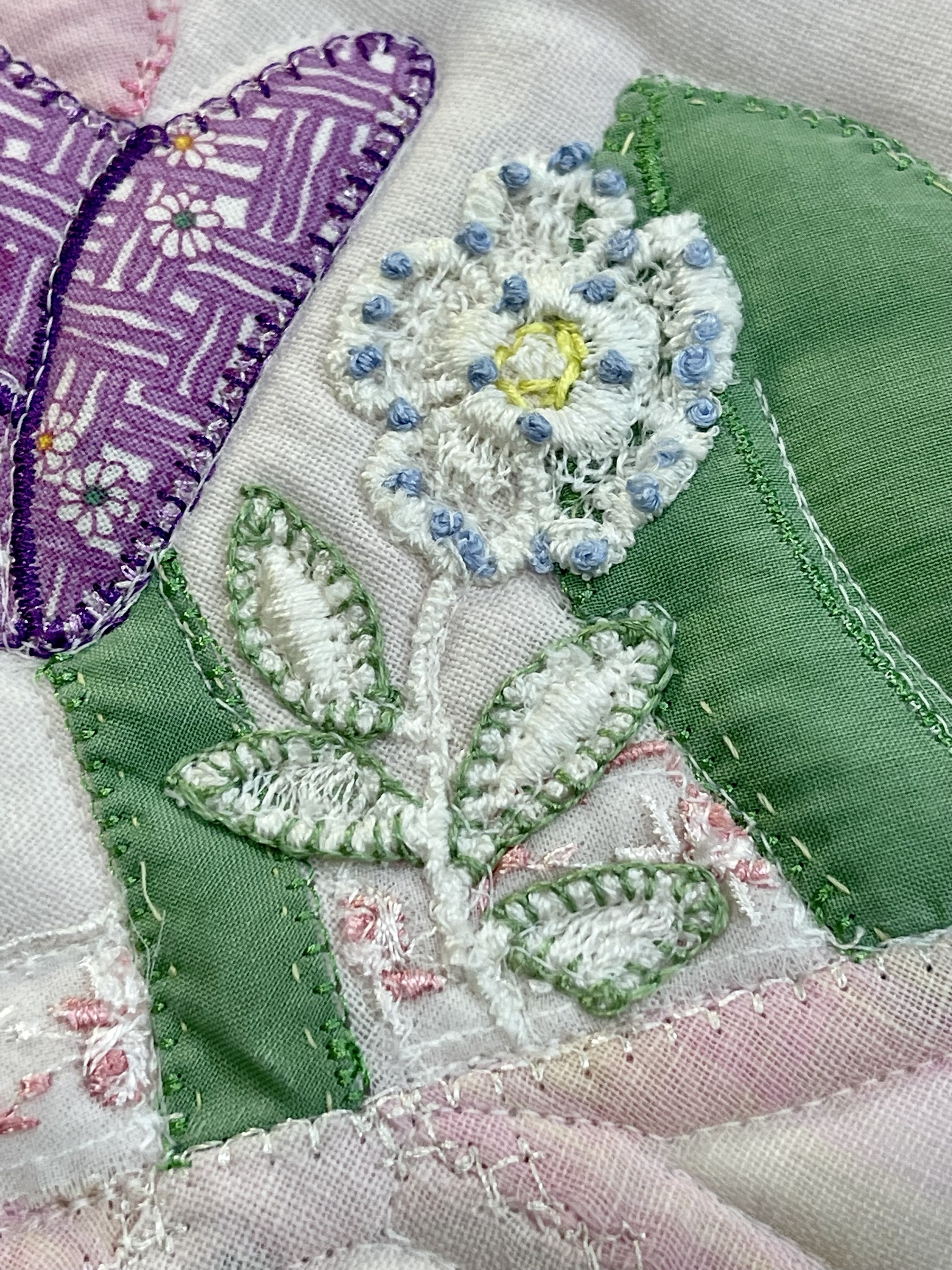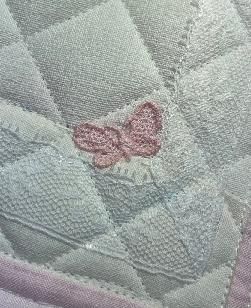 This tiny pink butterfly, measuring about 1/2”x3/4” comes in handy by covering a split in the seam. Remember back a few posts when I told you the quilt top is a combo of both hand and machine construction? Well, this barely 1/8” seam opened up due to the stresses of the quilting process. While on the longarm I positioned the little butterfly and stitched around the edges.