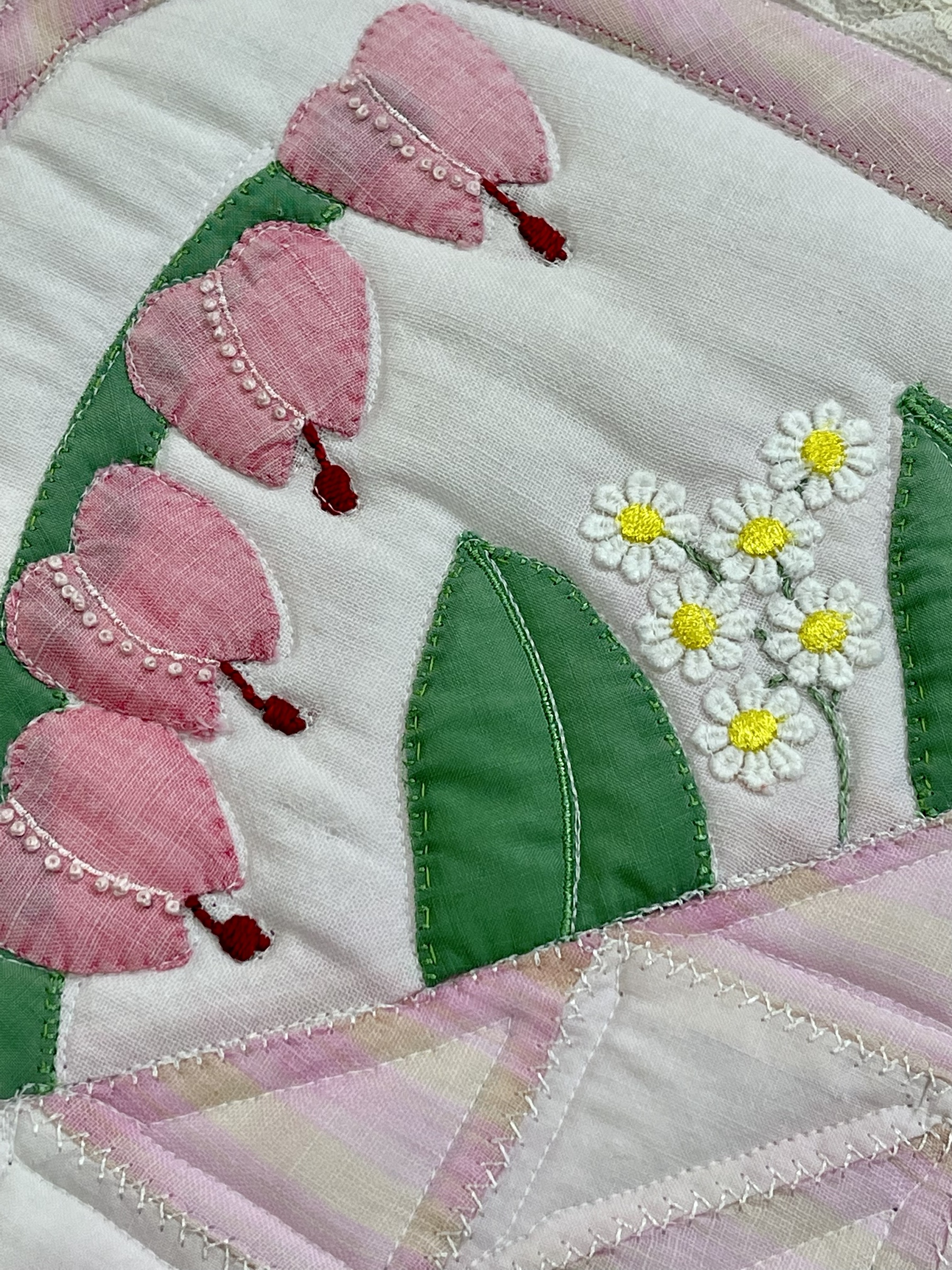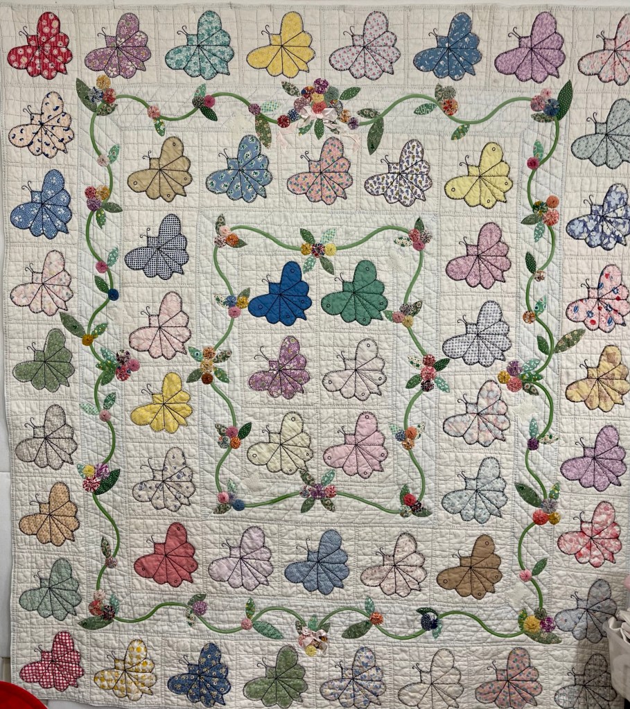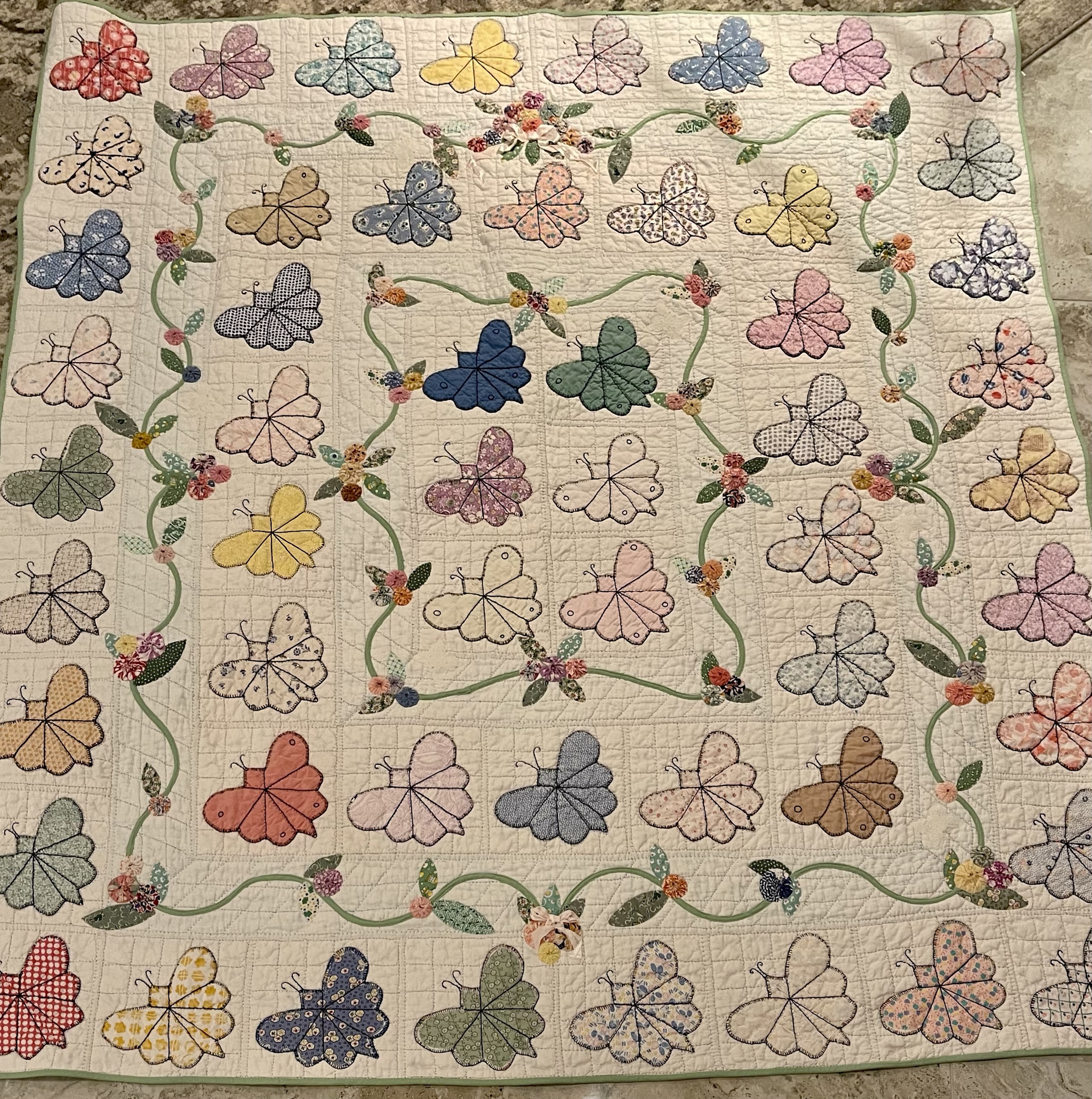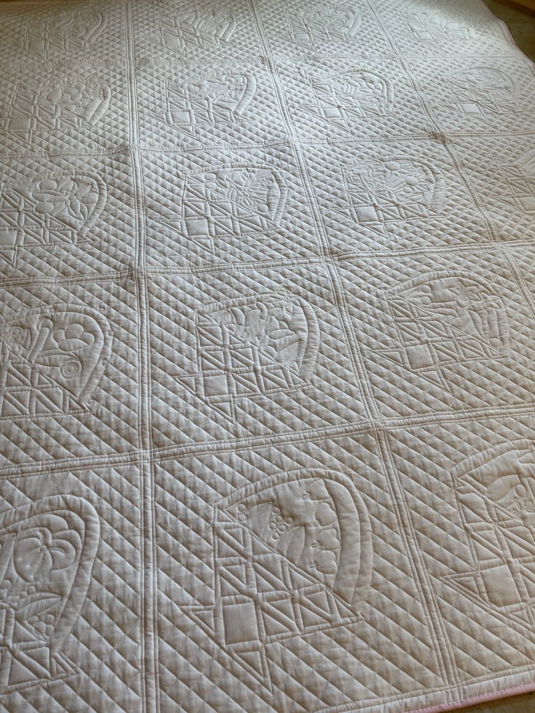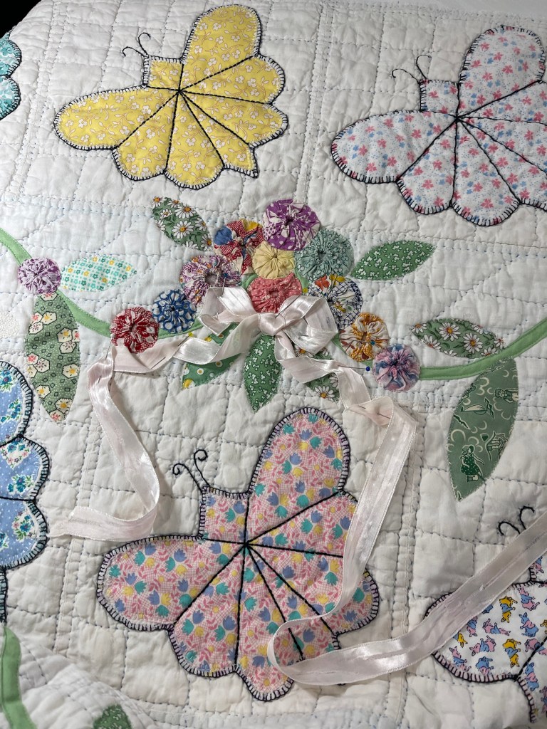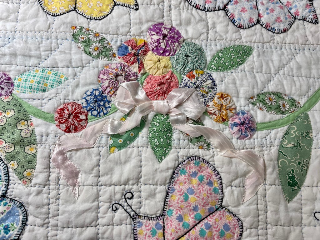 This tiny pink butterfly, measuring about 1/2”x3/4” comes in handy by covering a split in the seam. Remember back a few posts when I told you the quilt top is a combo of both hand and machine construction? Well, this barely 1/8” seam opened up due to the stresses of the quilting process. While on the longarm I positioned the little butterfly and stitched around the edges.