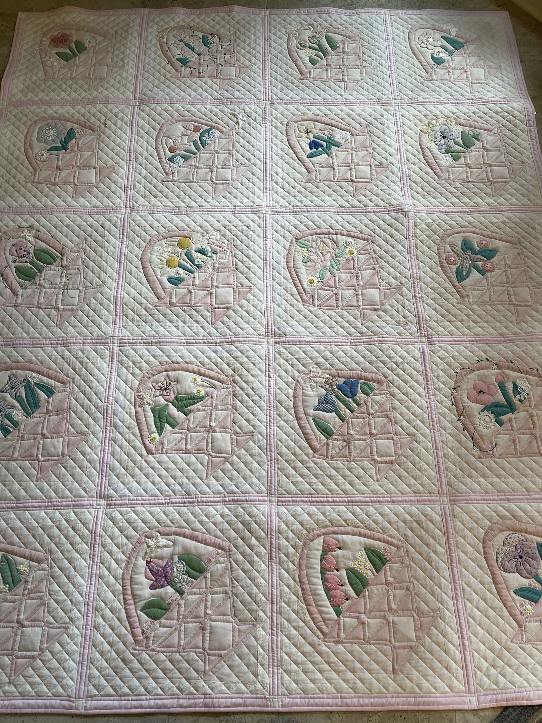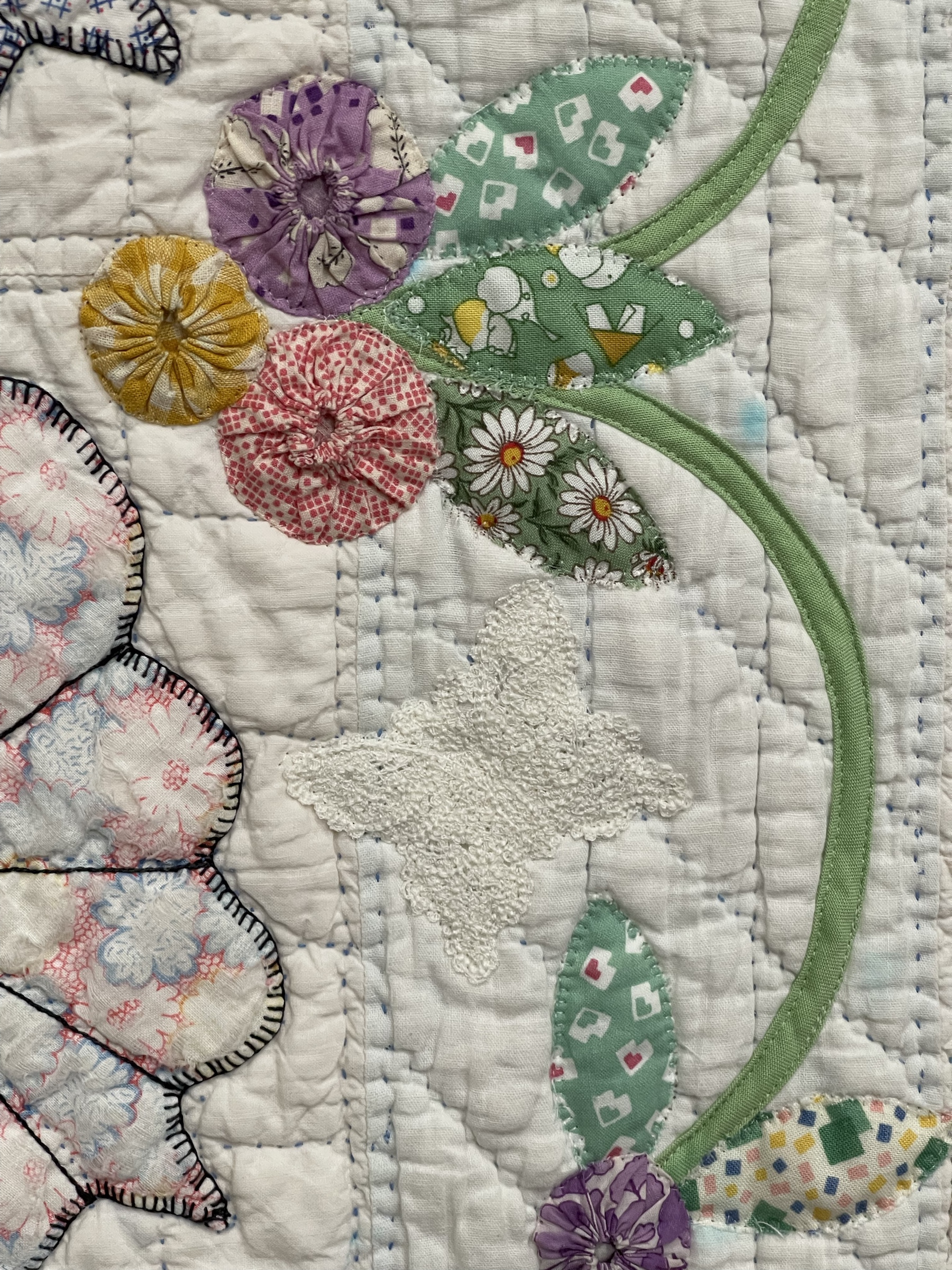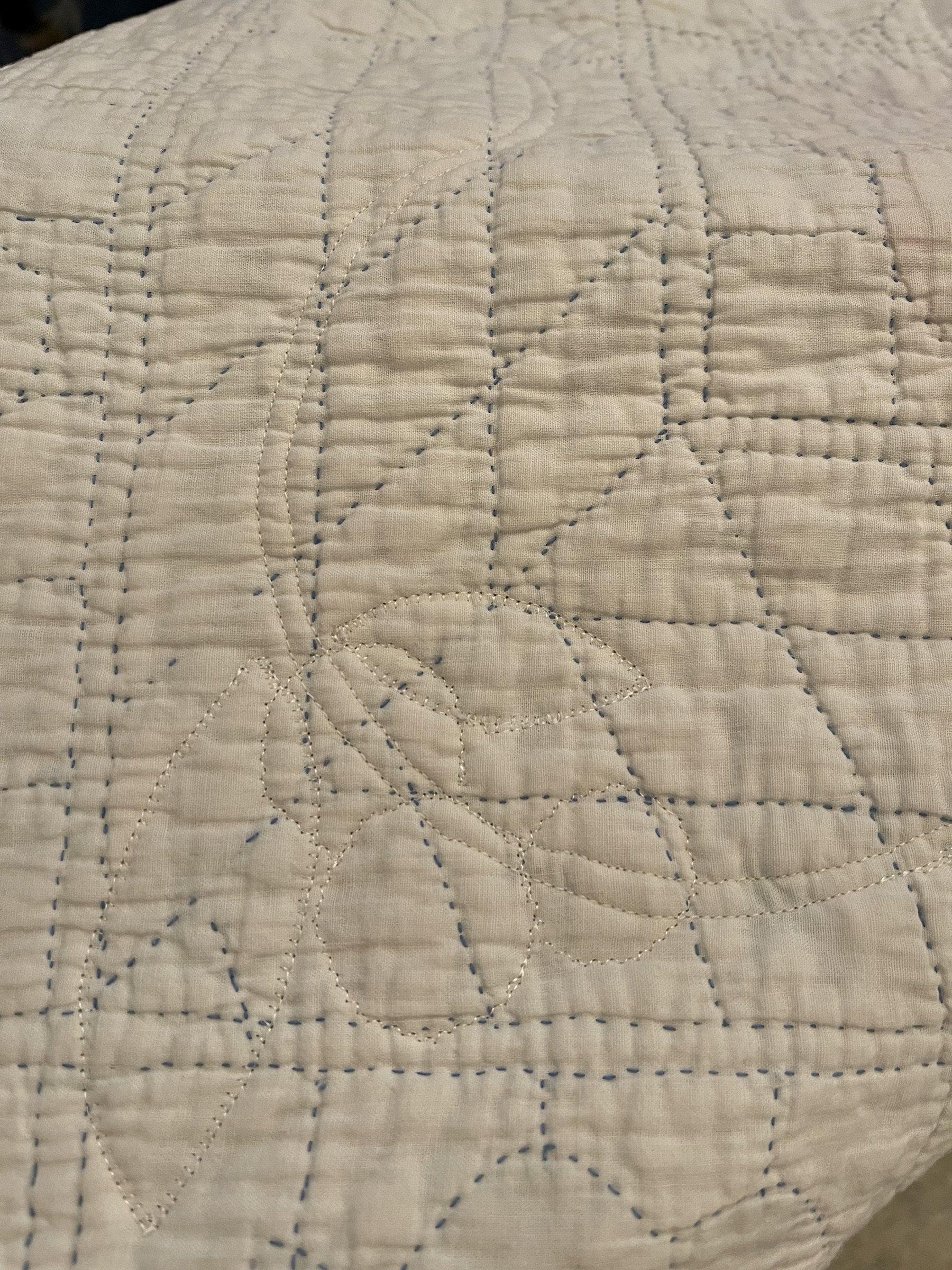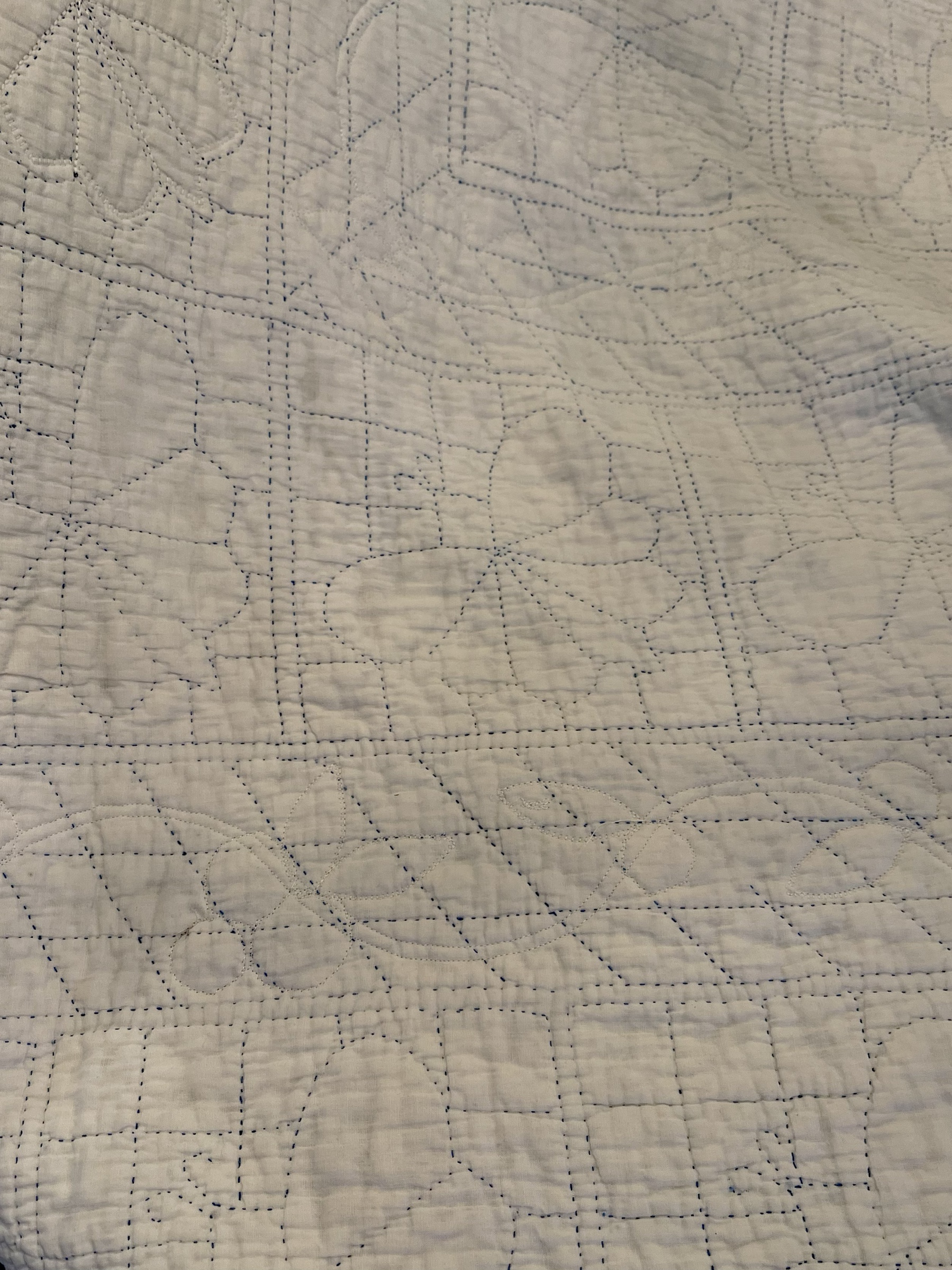 This tiny pink butterfly, measuring about 1/2”x3/4” comes in handy by covering a split in the seam. Remember back a few posts when I told you the quilt top is a combo of both hand and machine construction? Well, this barely 1/8” seam opened up due to the stresses of the quilting process. While on the longarm I positioned the little butterfly and stitched around the edges.