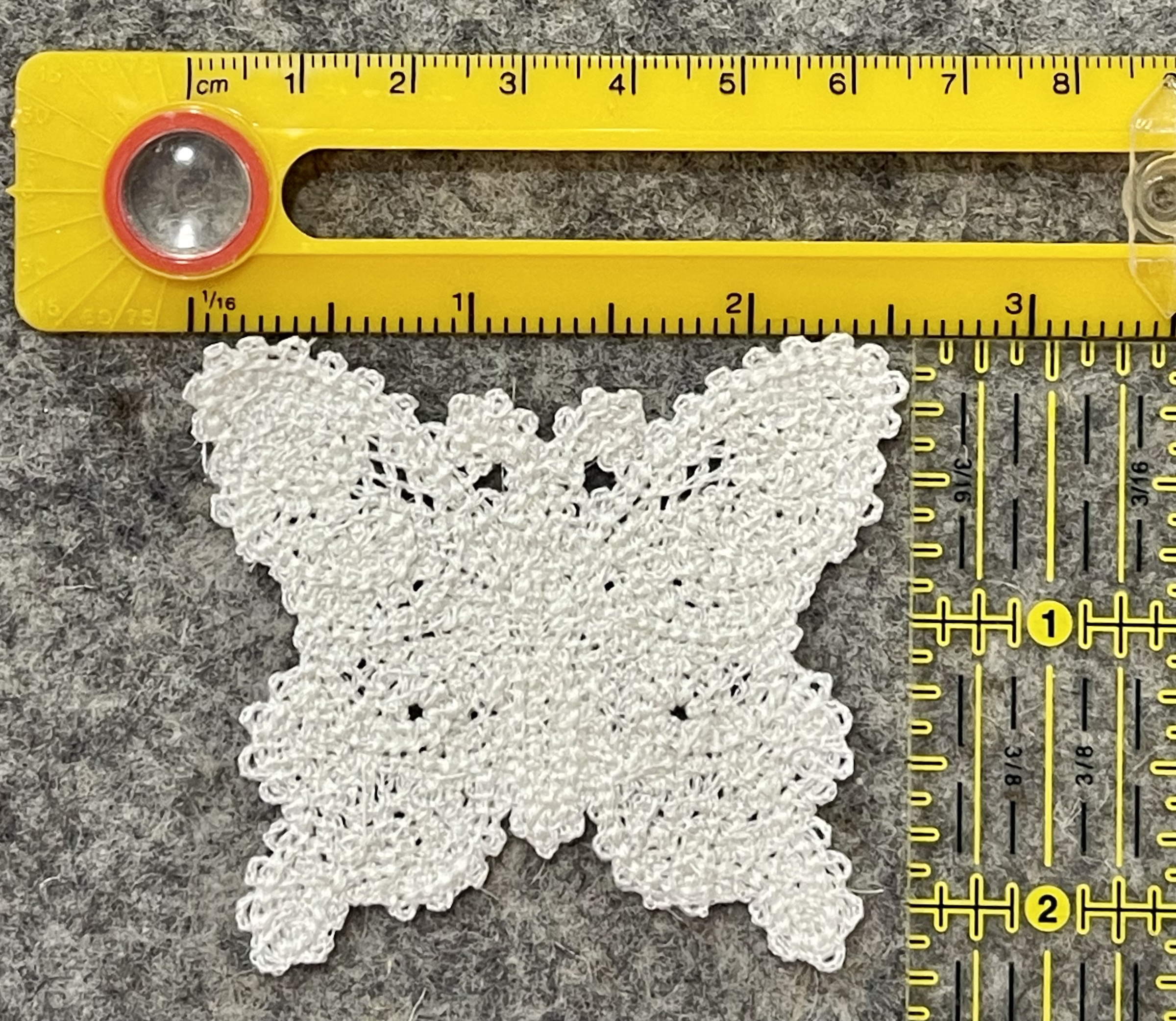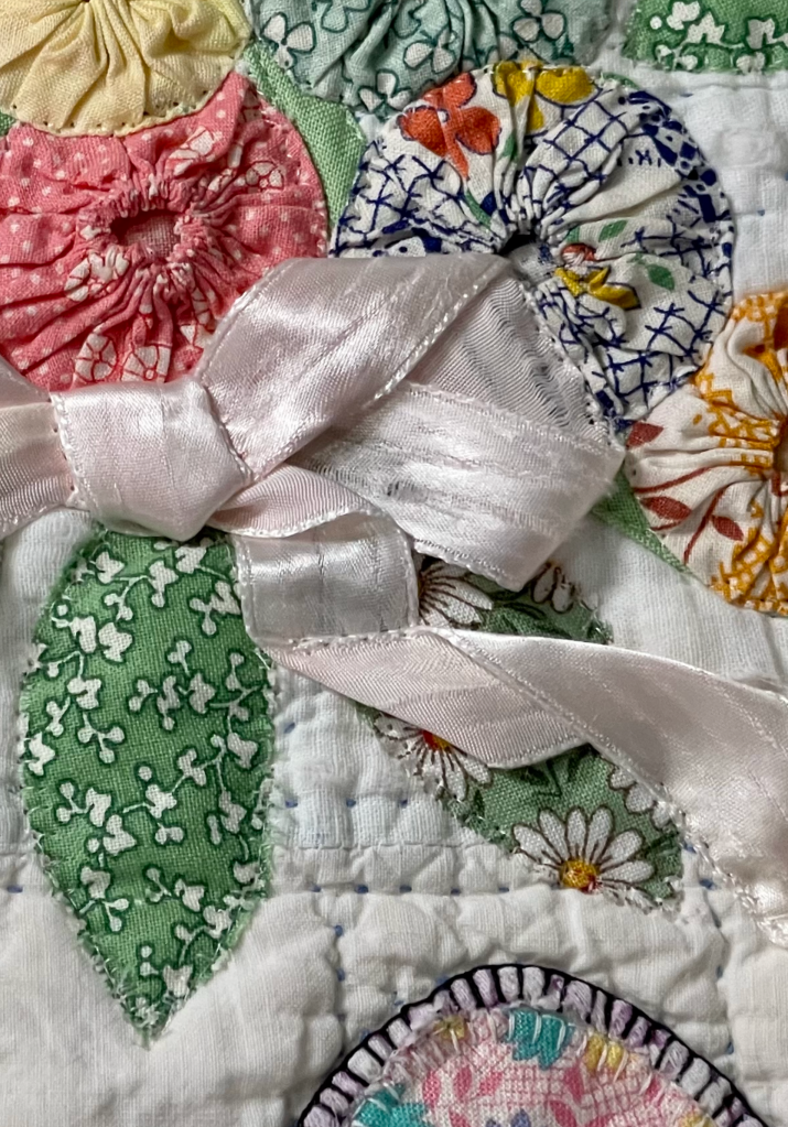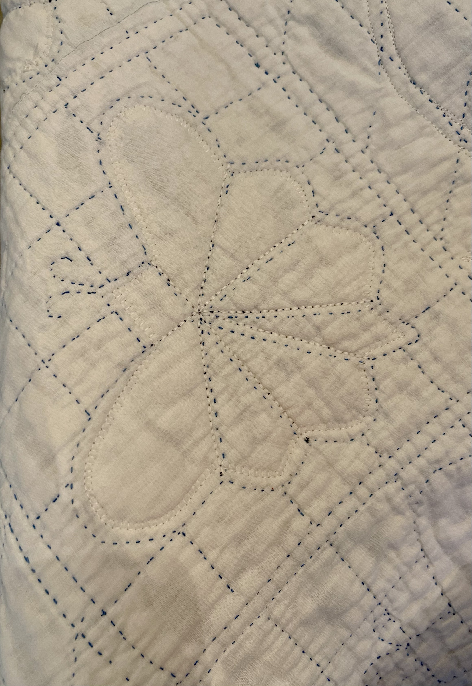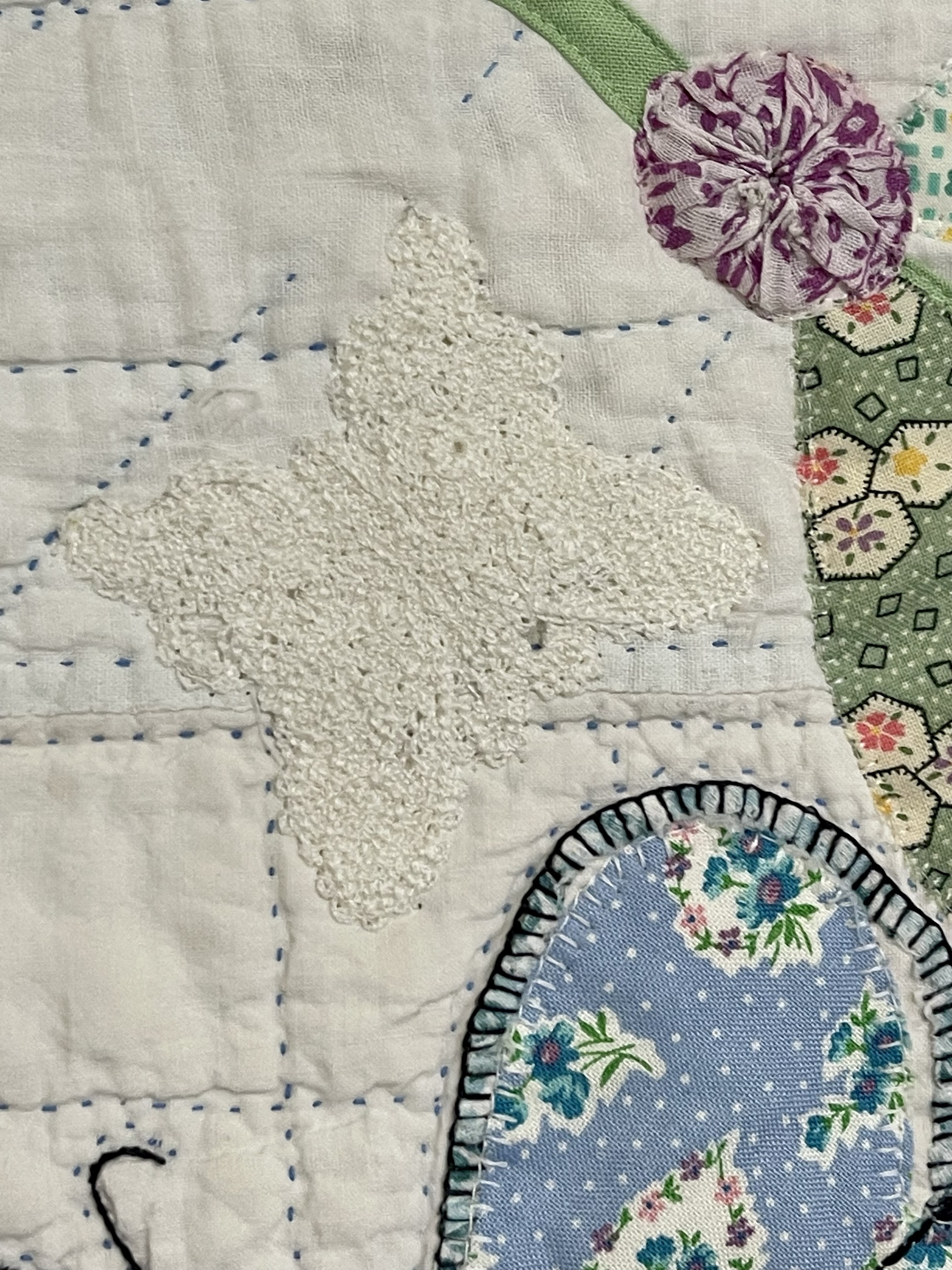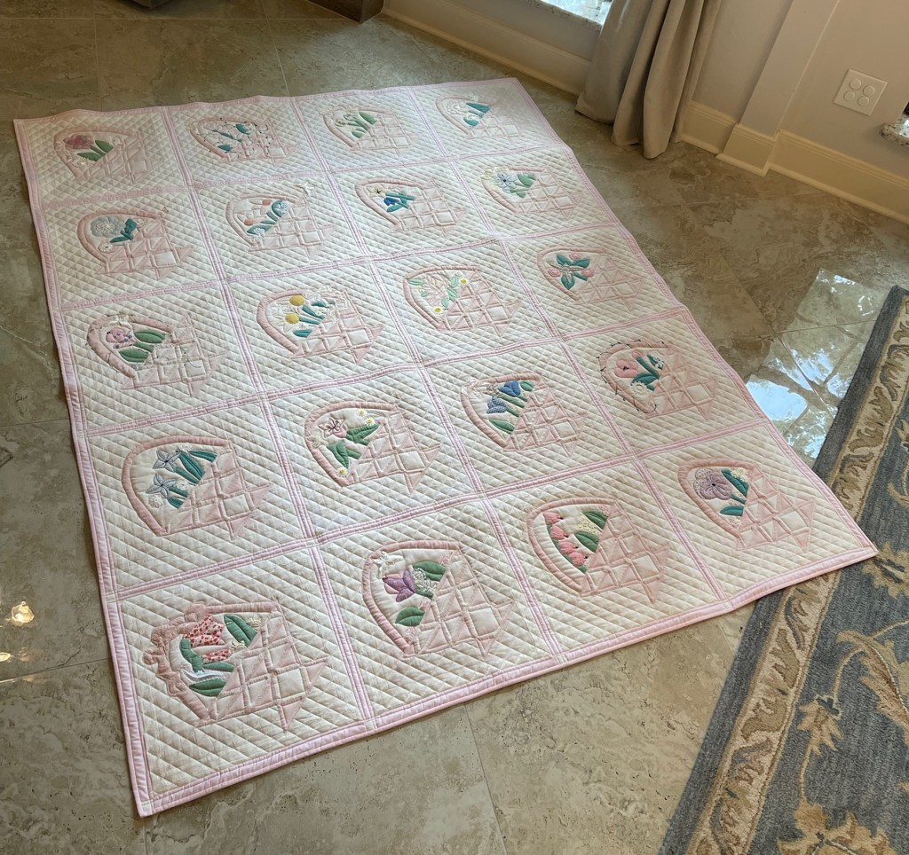 This tiny pink butterfly, measuring about 1/2”x3/4” comes in handy by covering a split in the seam. Remember back a few posts when I told you the quilt top is a combo of both hand and machine construction? Well, this barely 1/8” seam opened up due to the stresses of the quilting process. While on the longarm I positioned the little butterfly and stitched around the edges.