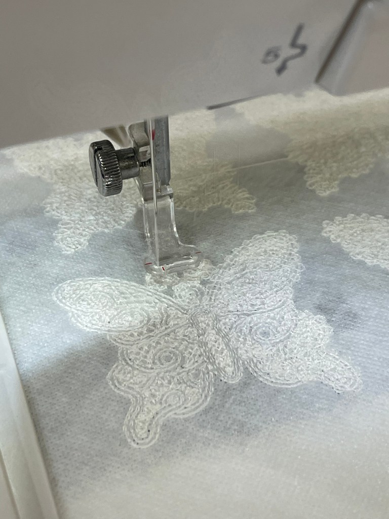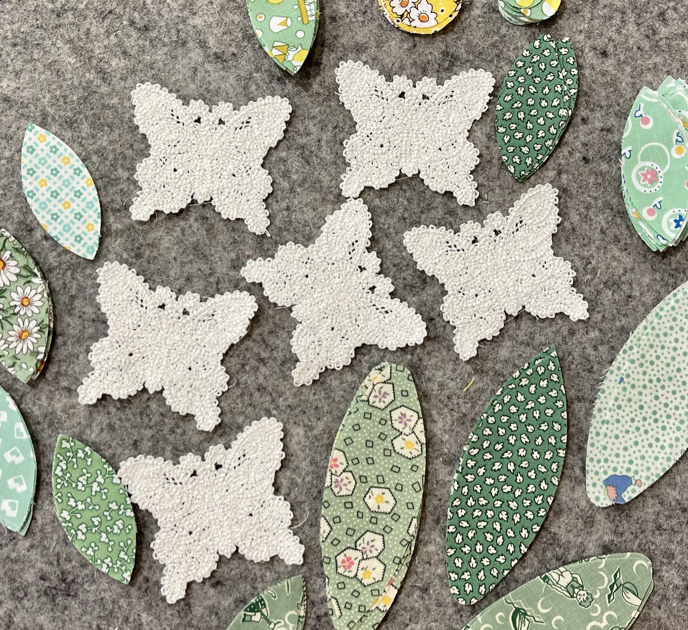 Larger daisy flowers and hand embroidered lazy-daisy flowers. I have yet to heat remove the lazy-daisy petal stitching lines.