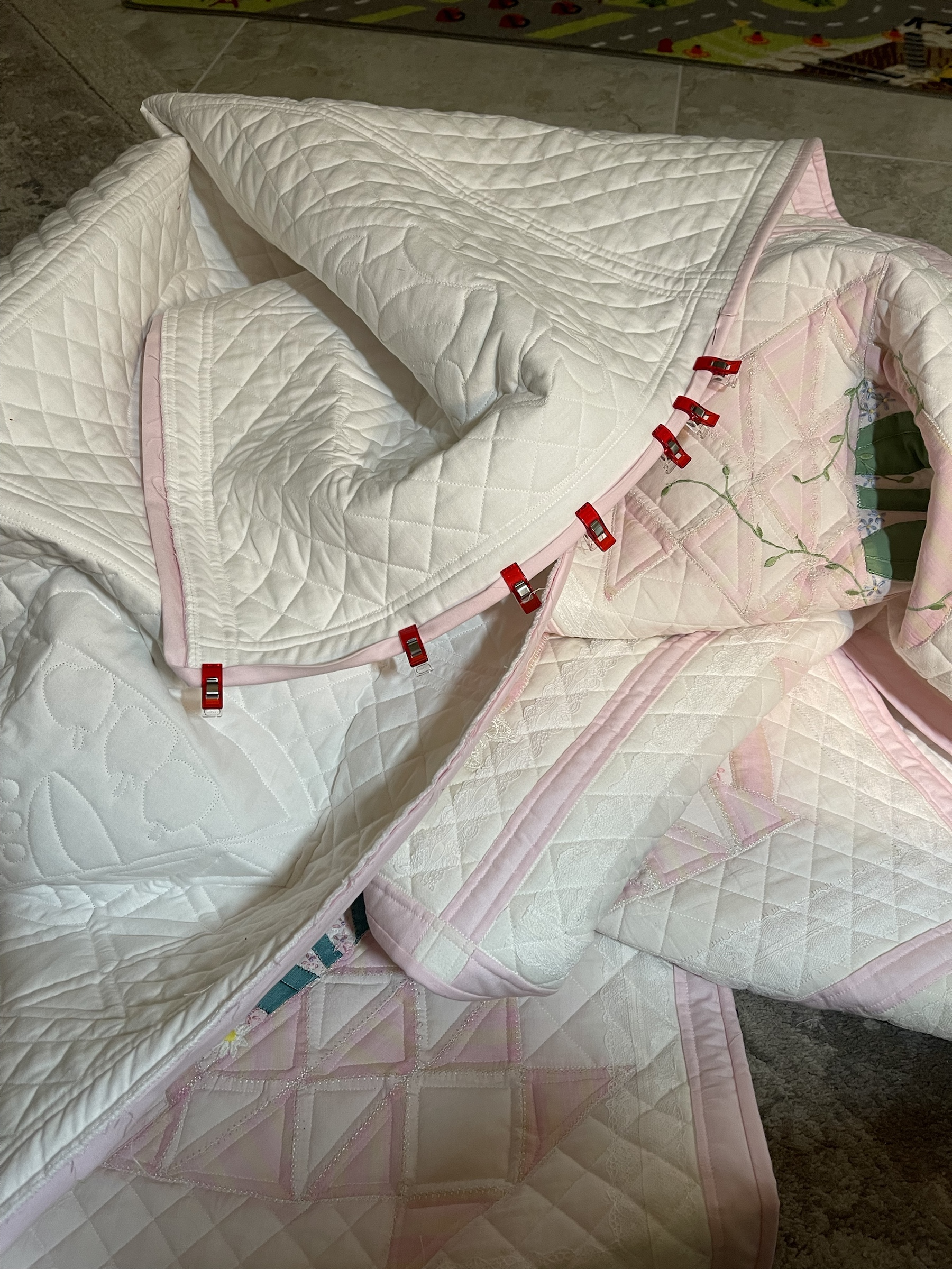 Binding…one of my least fav tasks…a very old dominated hand thumb injury (think ski slope tumble) makes hand stitching very slow.