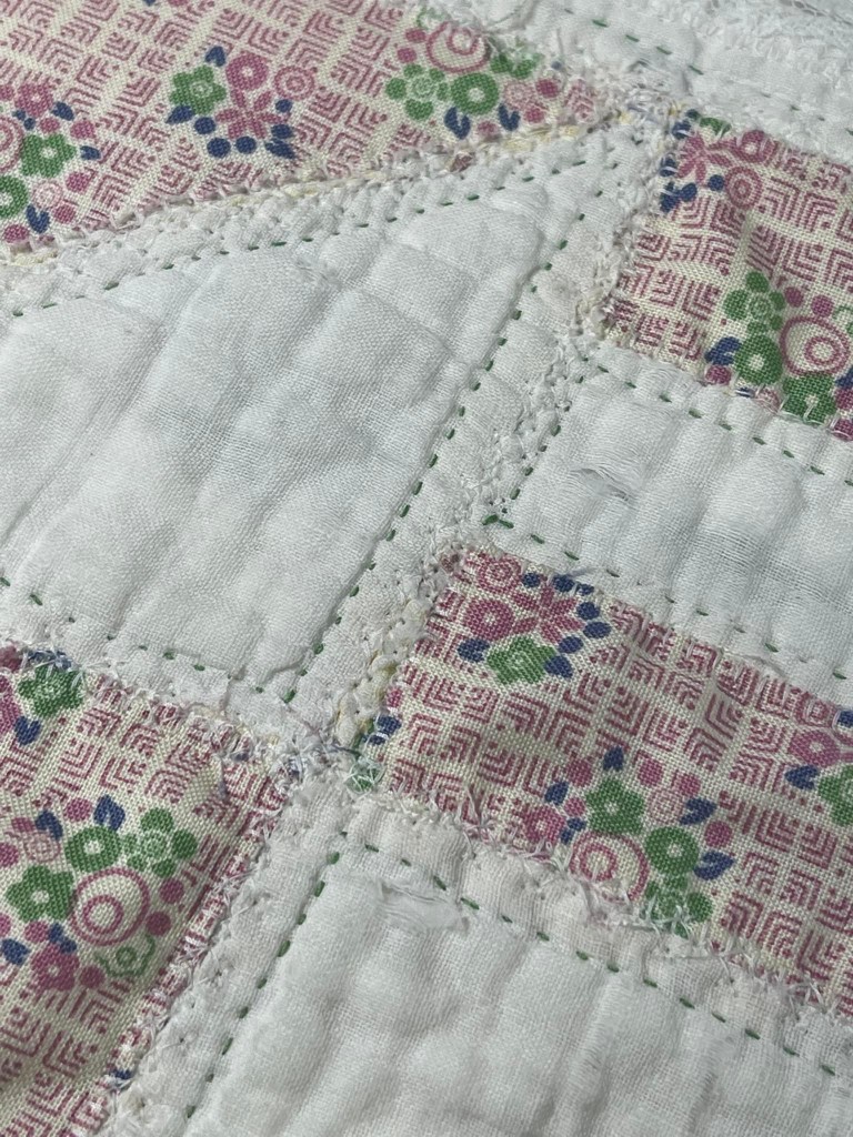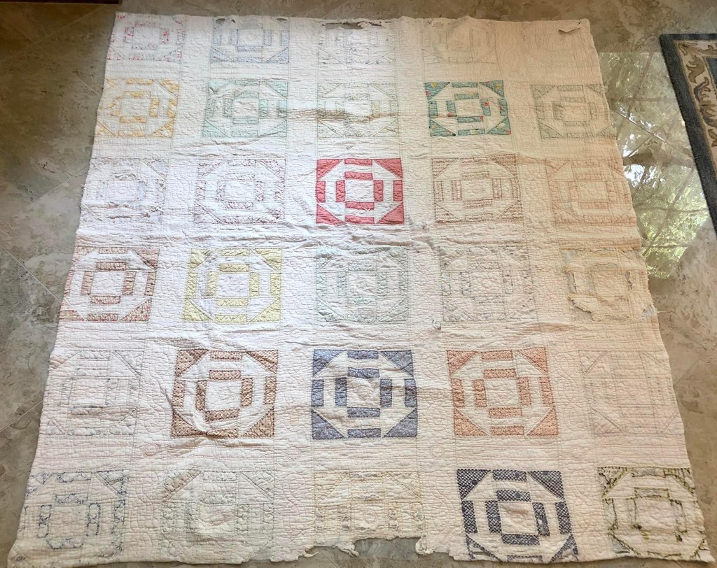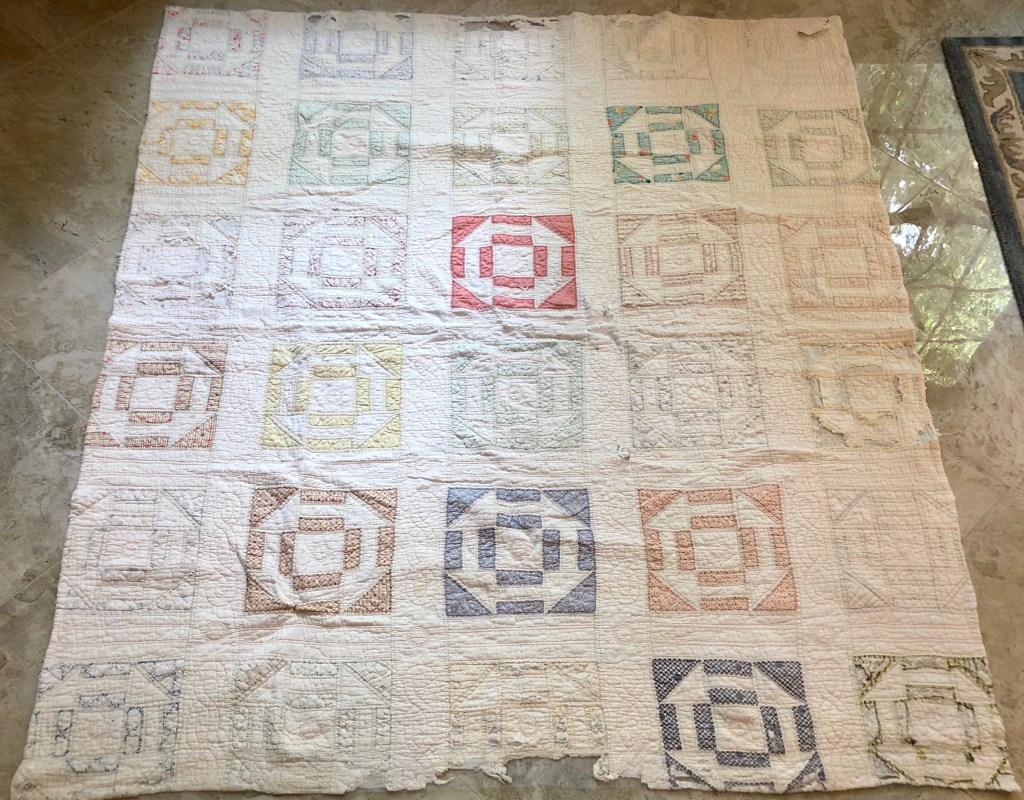 I’ve had this vintage quilt for about 2 years, offered it twice to my retreat groups for purchase but with no takers I decided to take on the “save” challenge myself. Checking Barbara Brackman’s Encyclopedia of Pieced Quilt Patterns I believe this pattern is called either Crow’s Nest or Attic Windows.