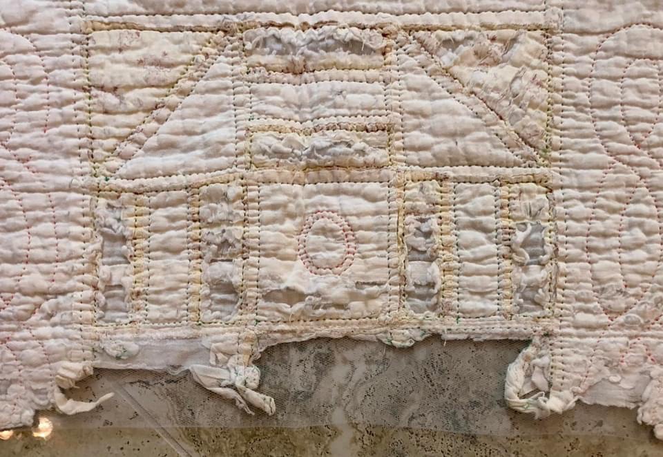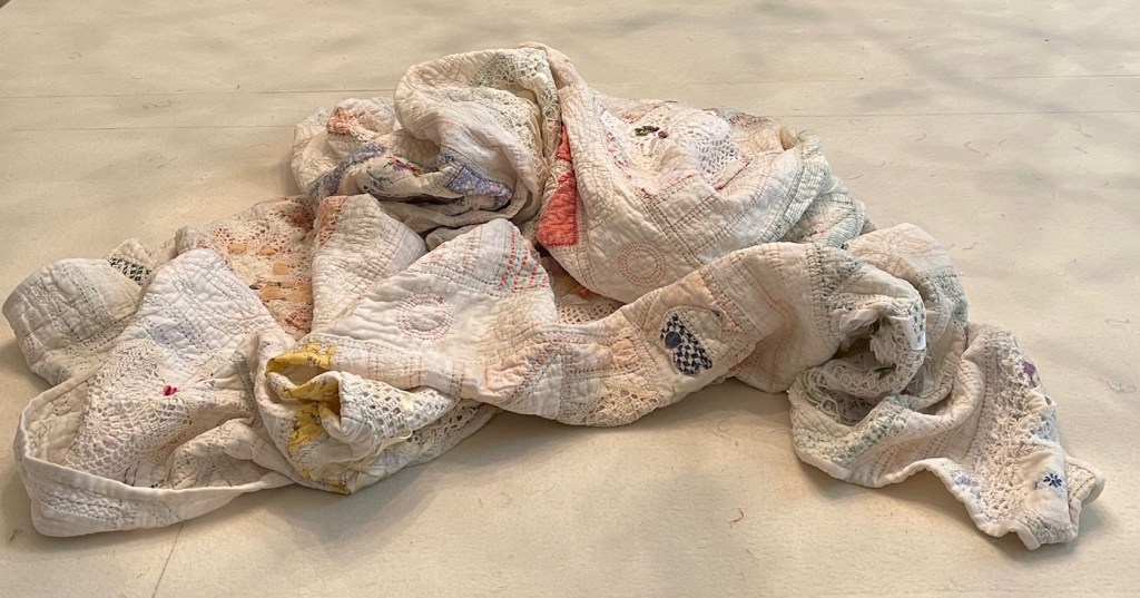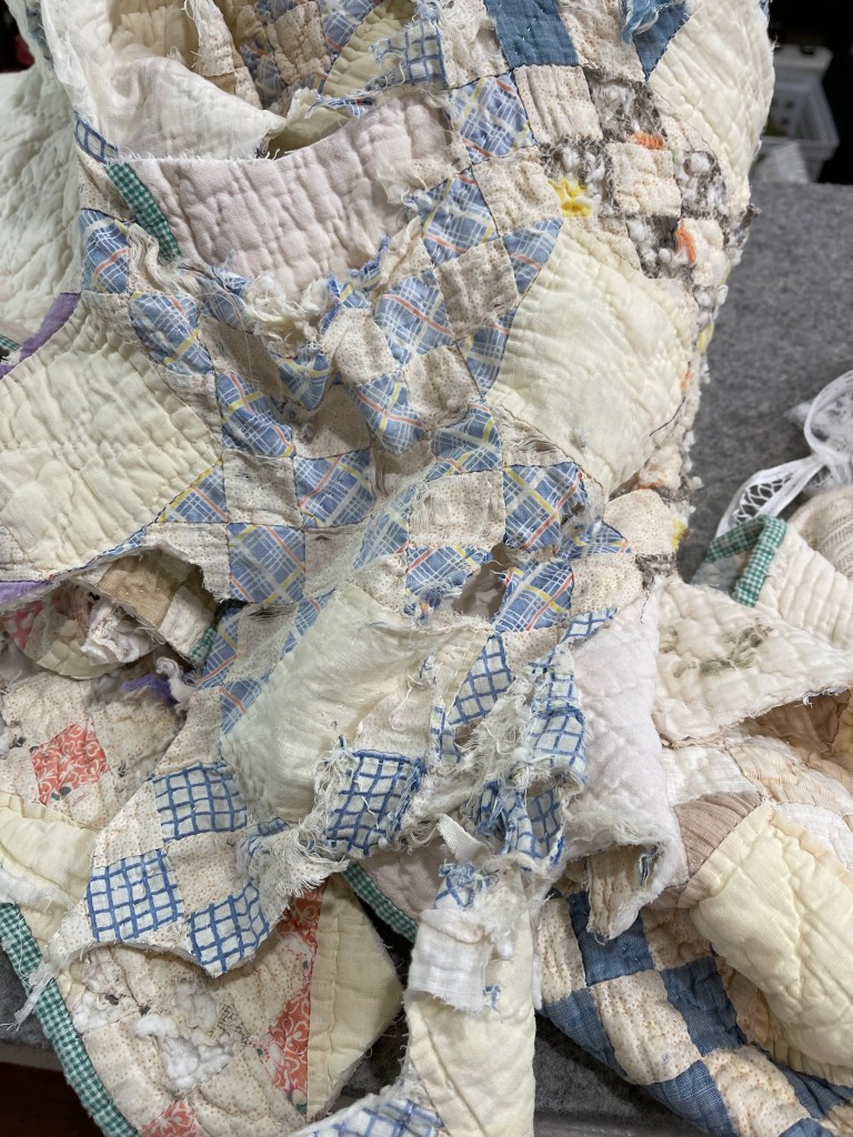 Yes, this is a very rough quilt…but it has potential! I encased the bad areas in tulle before sending this piece to a 2 day soak and the front load washer and dryer. I first contemplated repairing both the top and bottom edges but in the end I trimmed them away.