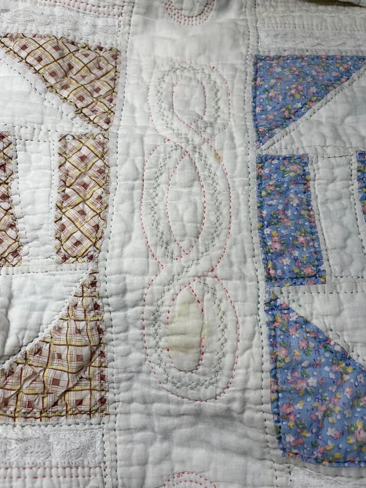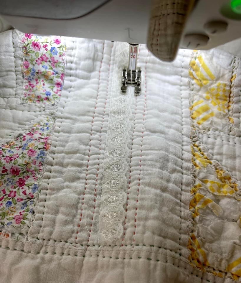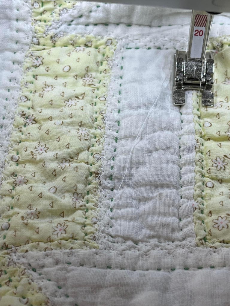 My quest to “save this vintage quilt” continues. I’ve secured EVERY single seam by stitching directly over the seam line with machine decorative stitches. Yes it took forever but well worth the effort. I like the soft feathery look this stitching created.
