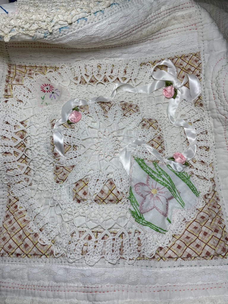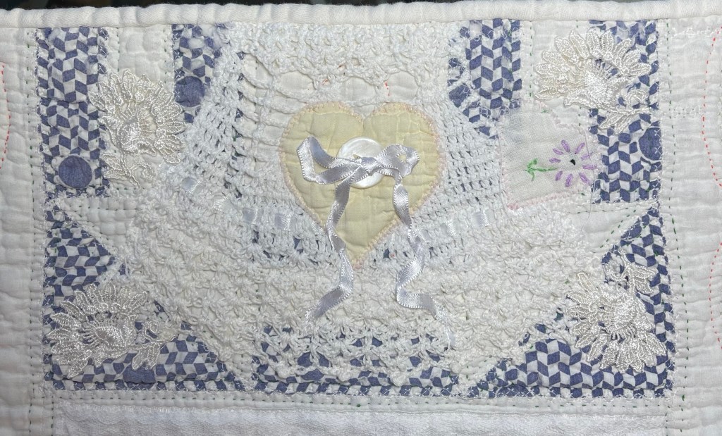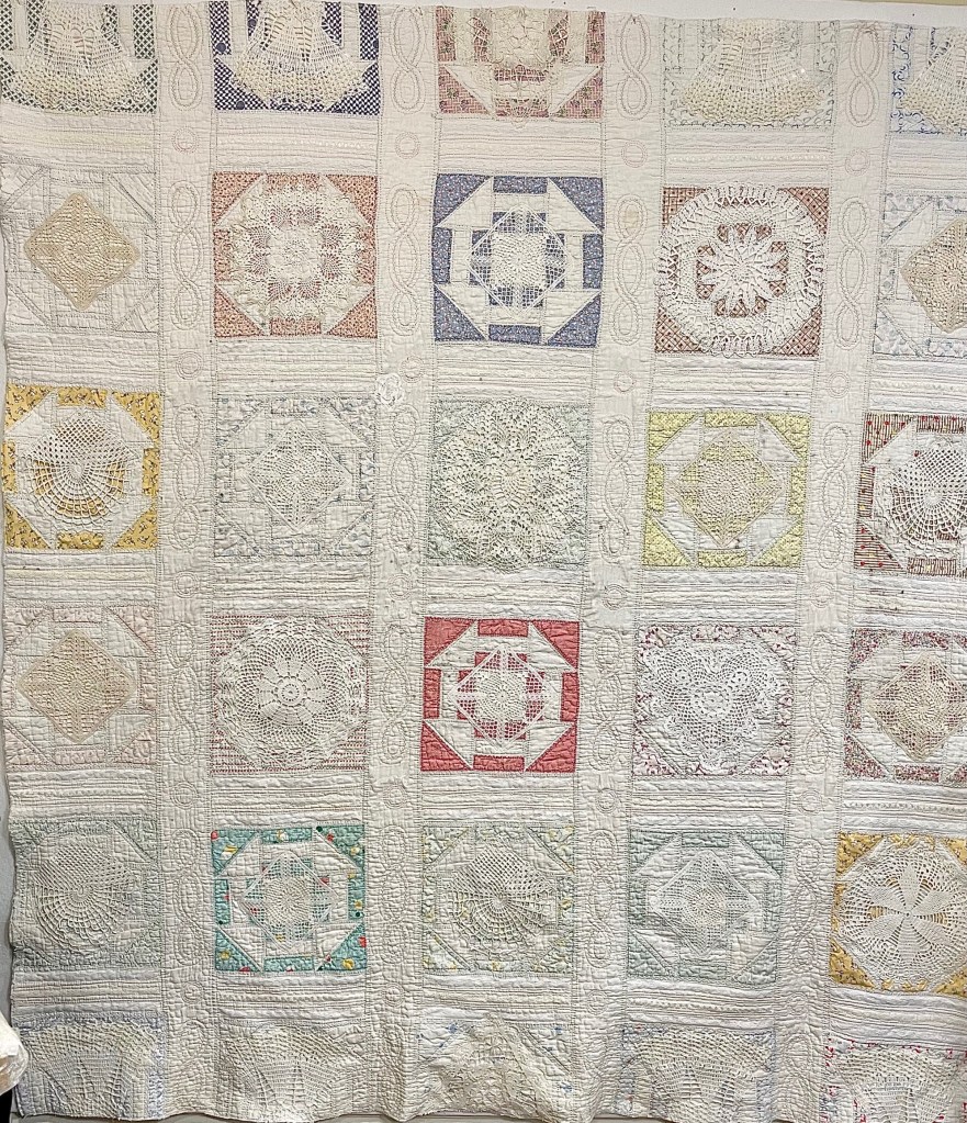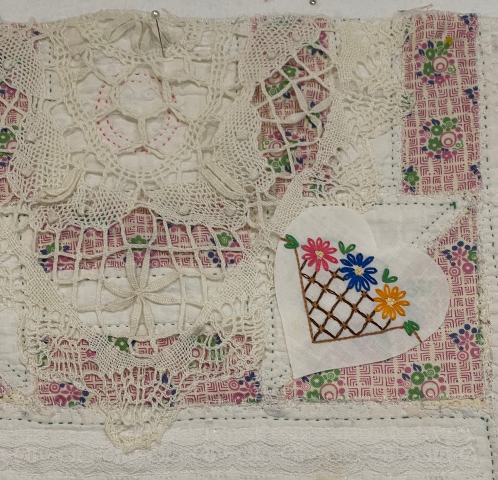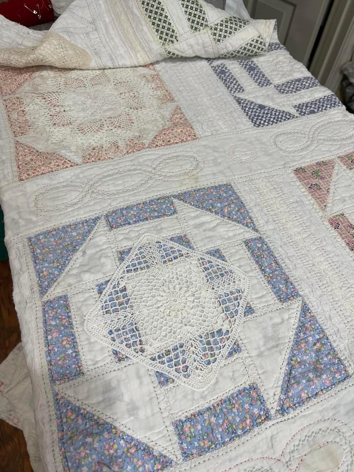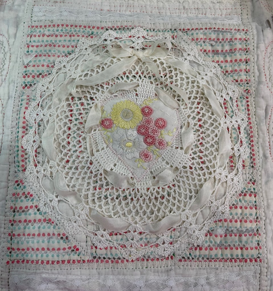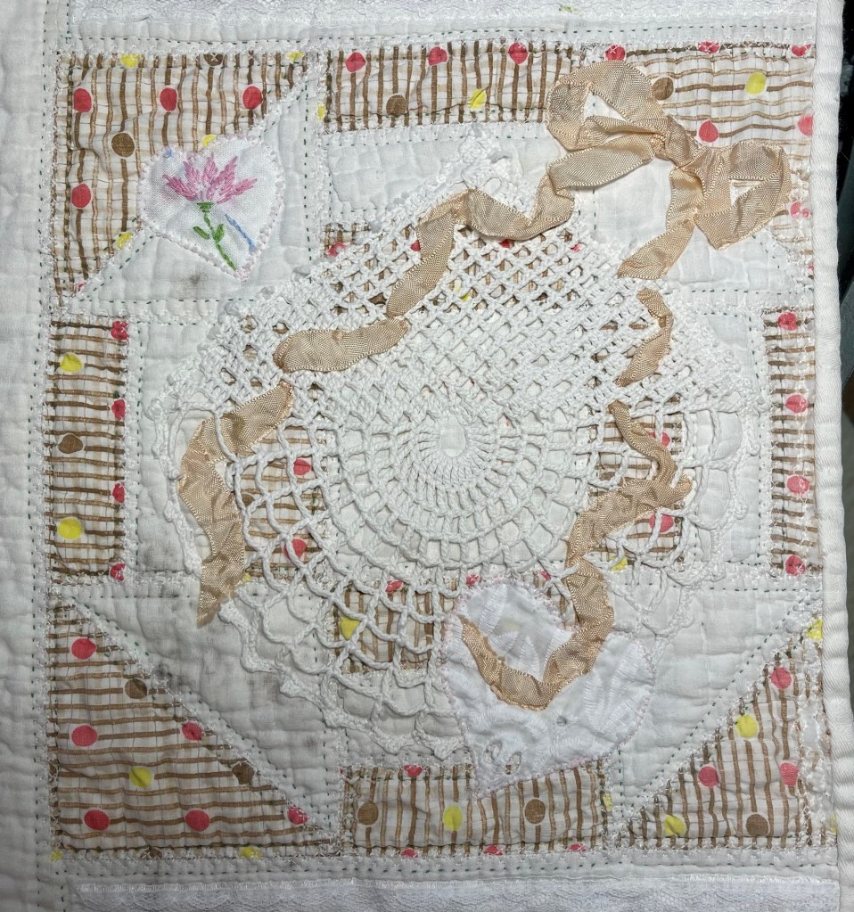This project is moving along quickly with the machine stitching and the added doilies giving it a wonderful soft look. Stay tuned for more info as I continue working with this lovely very old quilt.