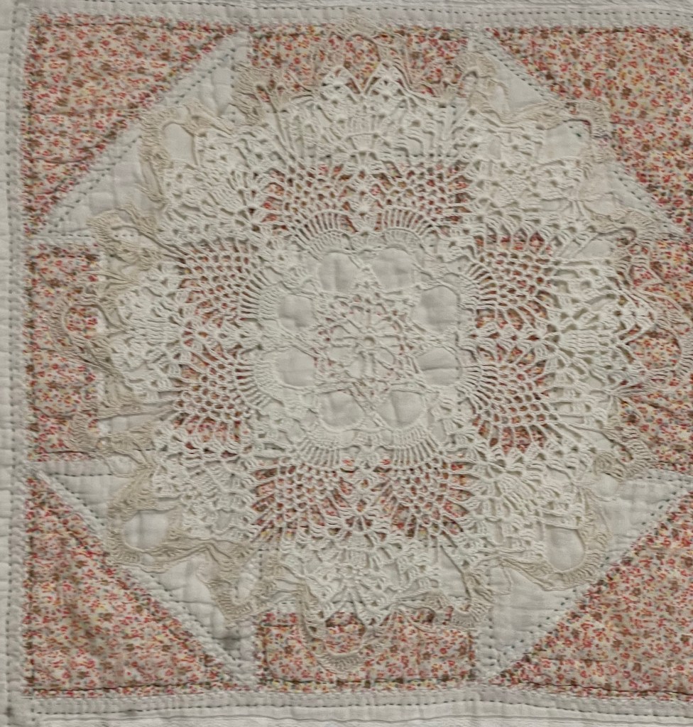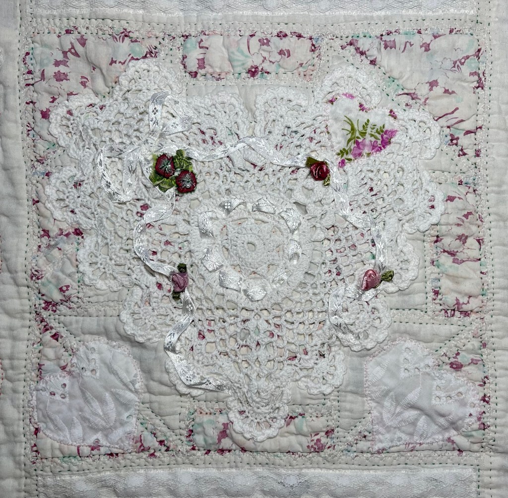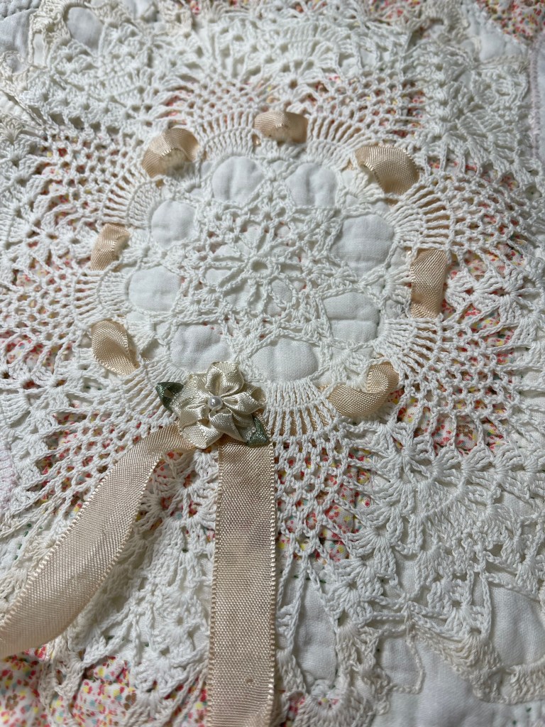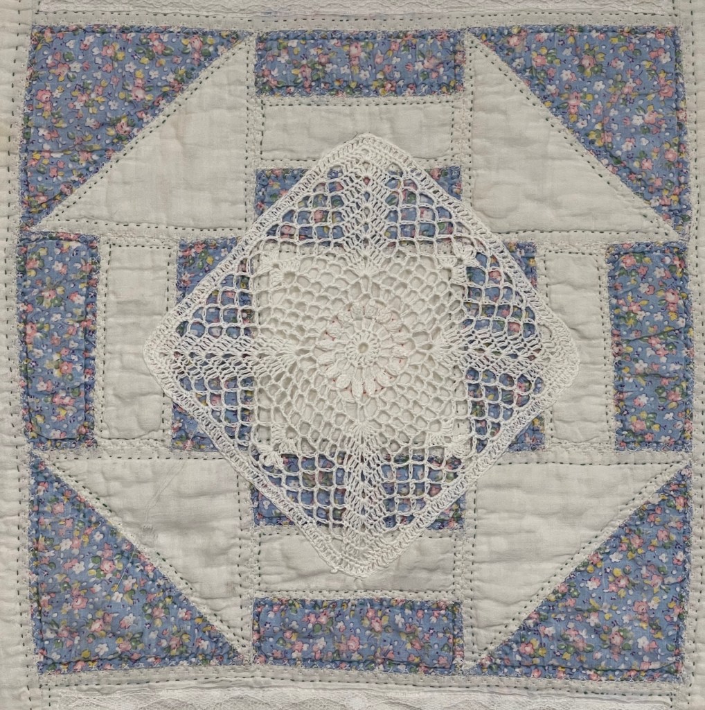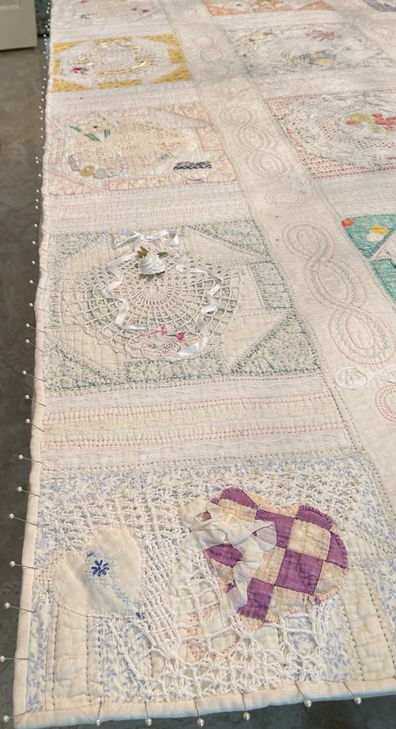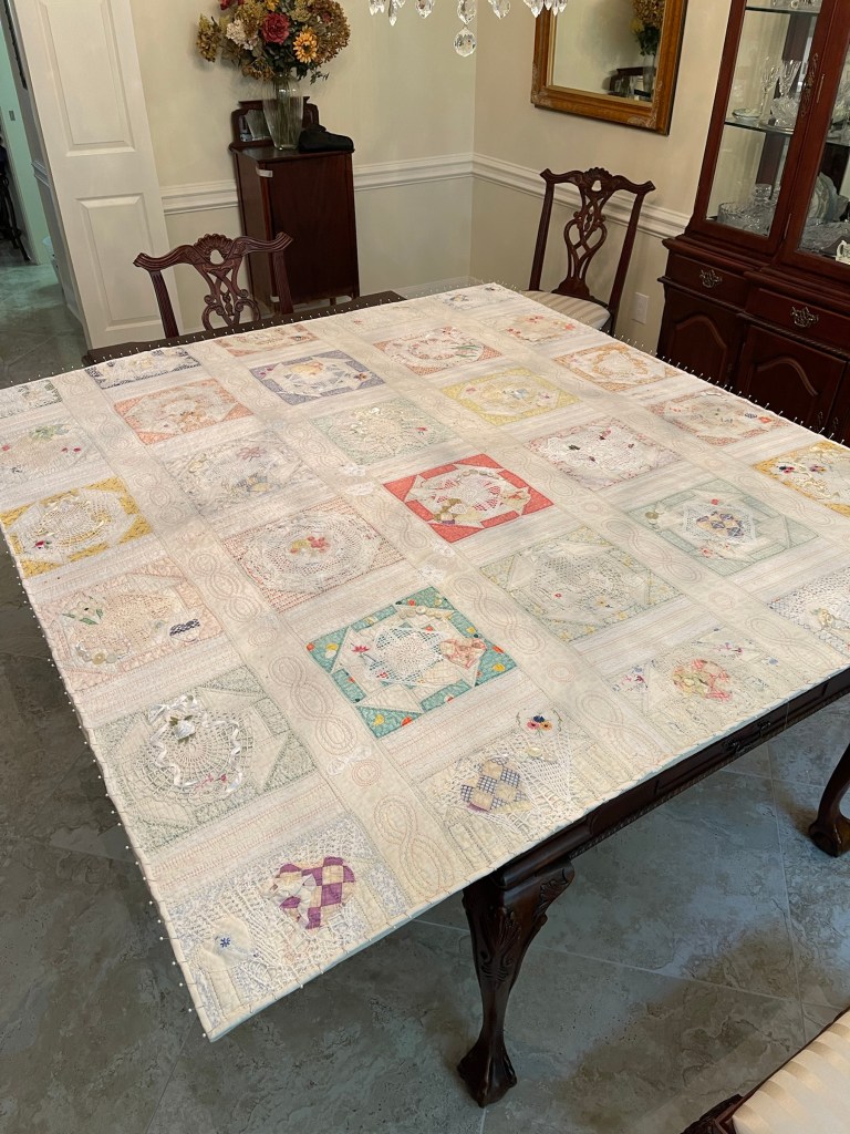 This project is moving along quickly with the machine stitching and the added doilies giving it a wonderful soft look. Stay tuned for more info as I continue working with this lovely very old quilt.