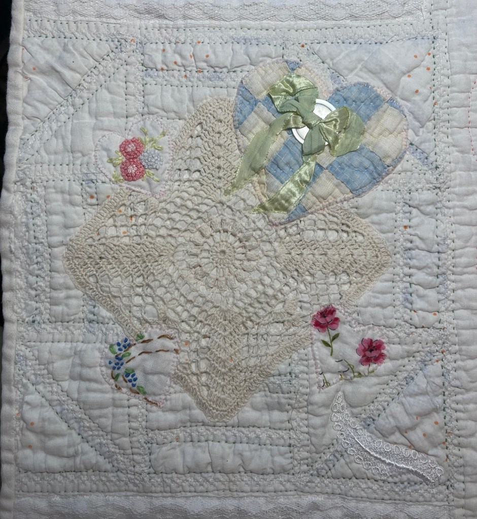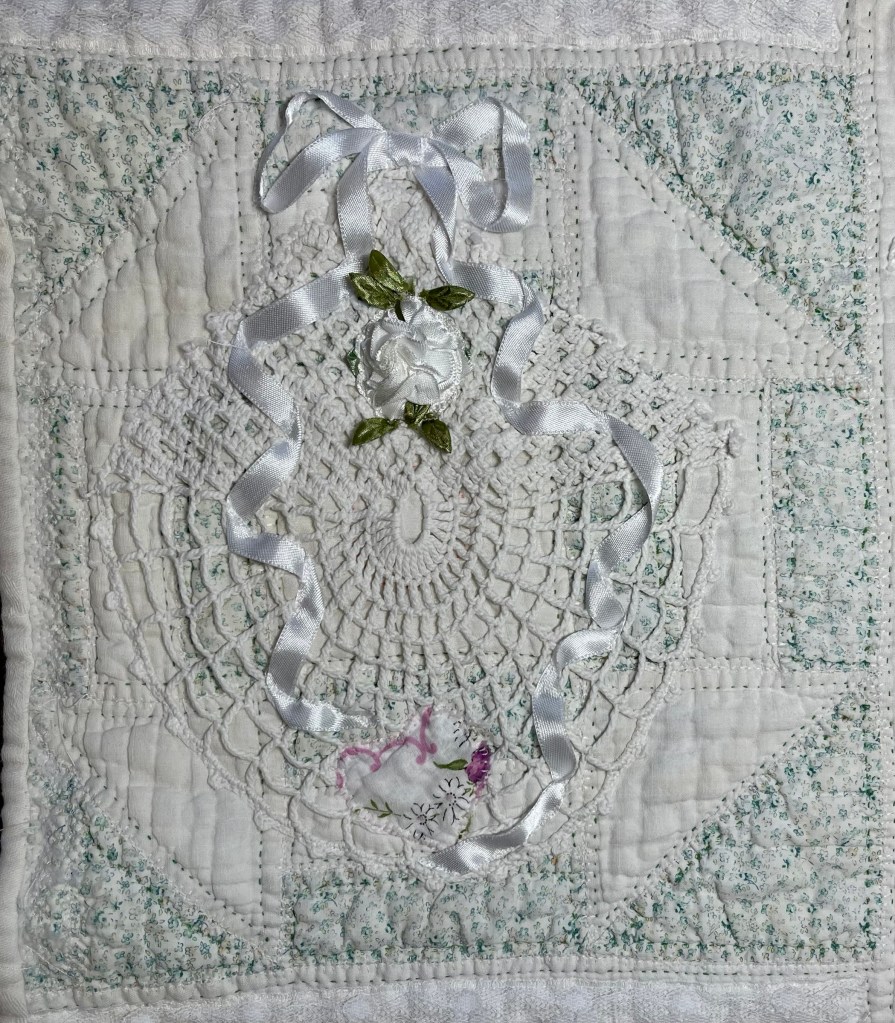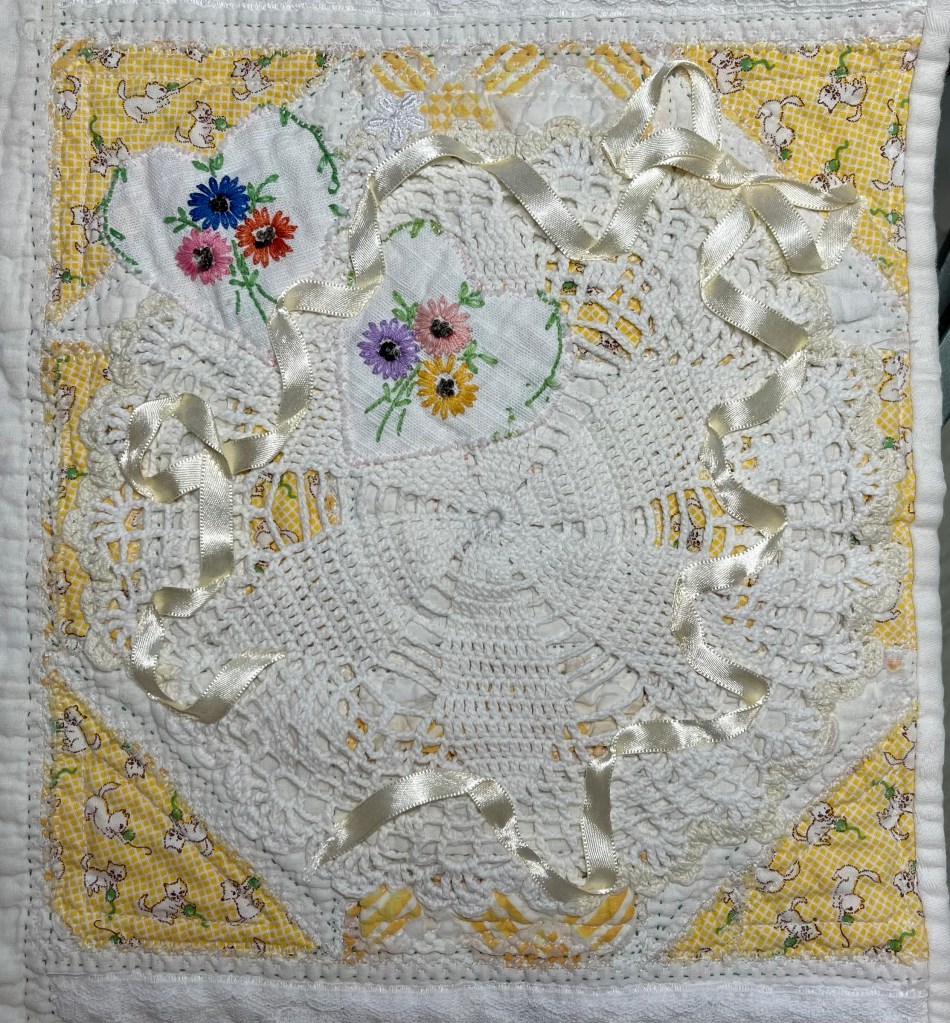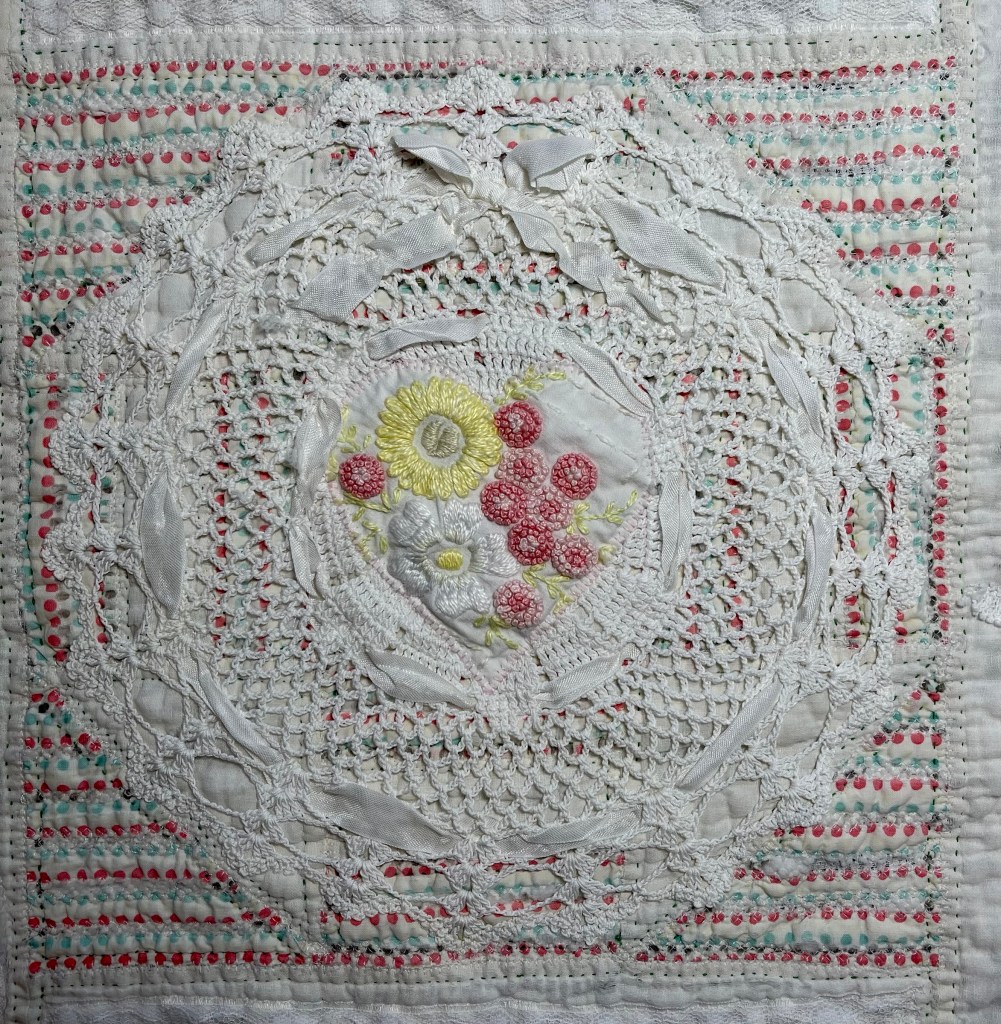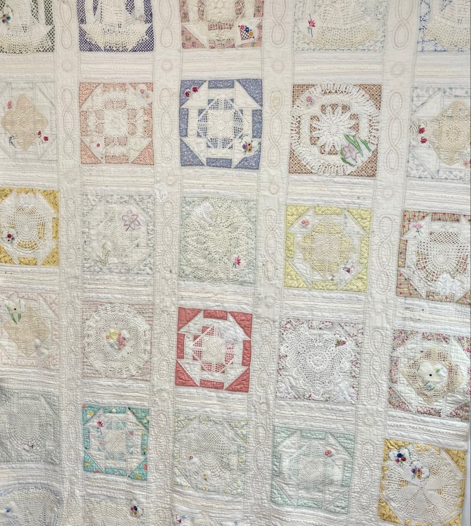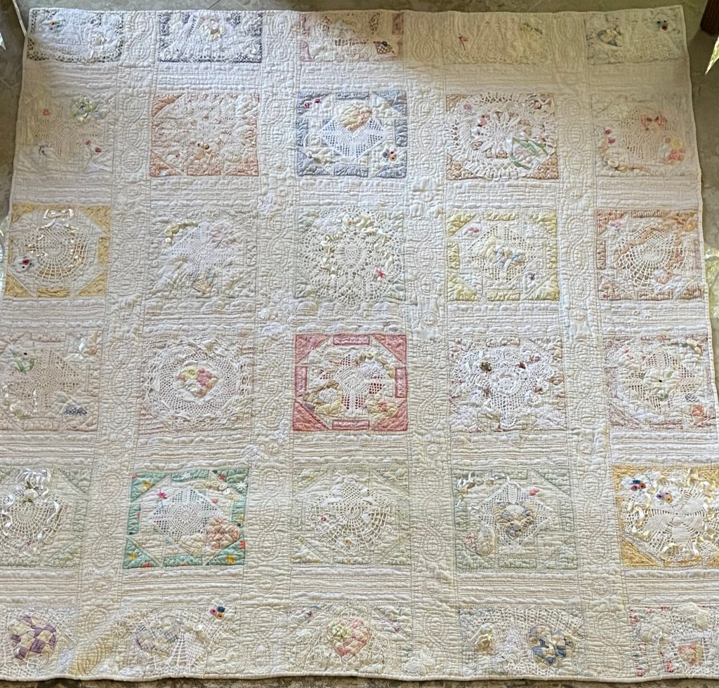 This project is moving along quickly with the machine stitching and the added doilies giving it a wonderful soft look. Stay tuned for more info as I continue working with this lovely very old quilt.