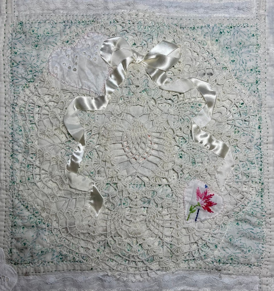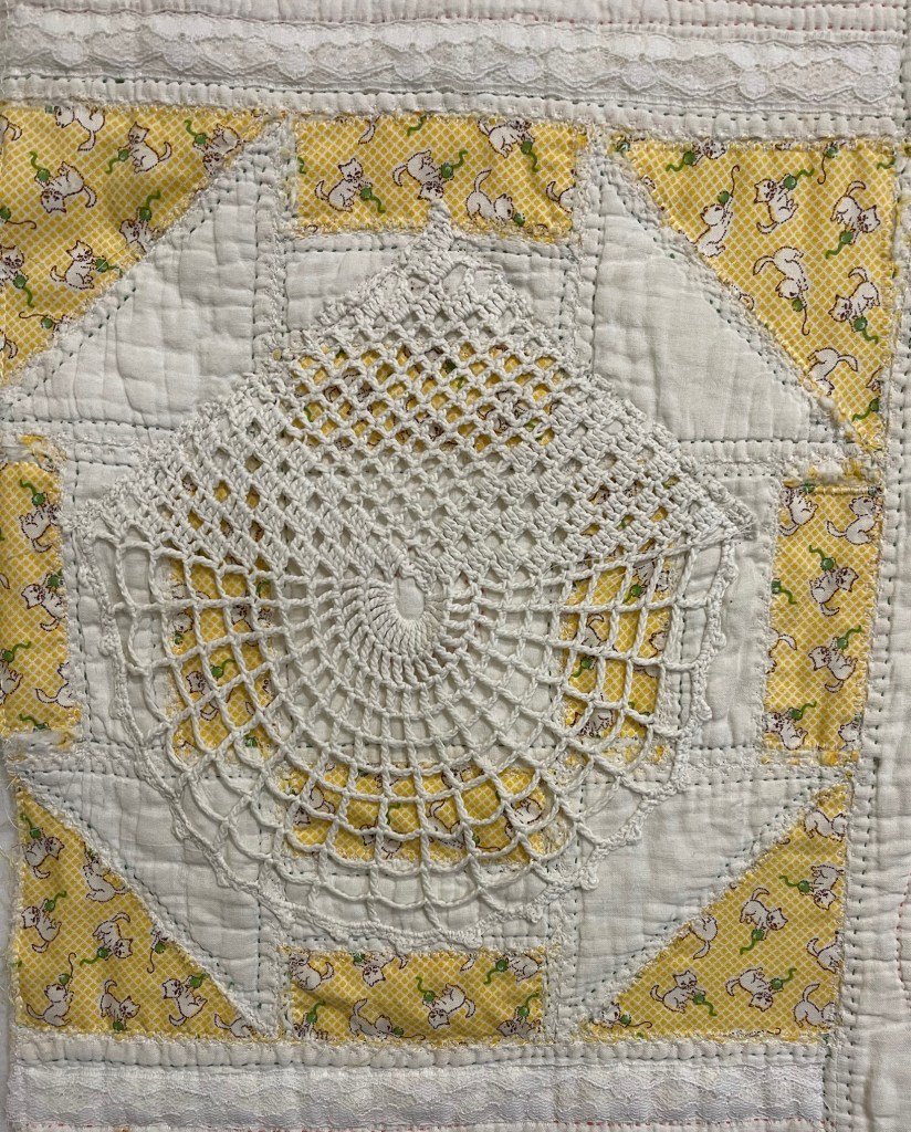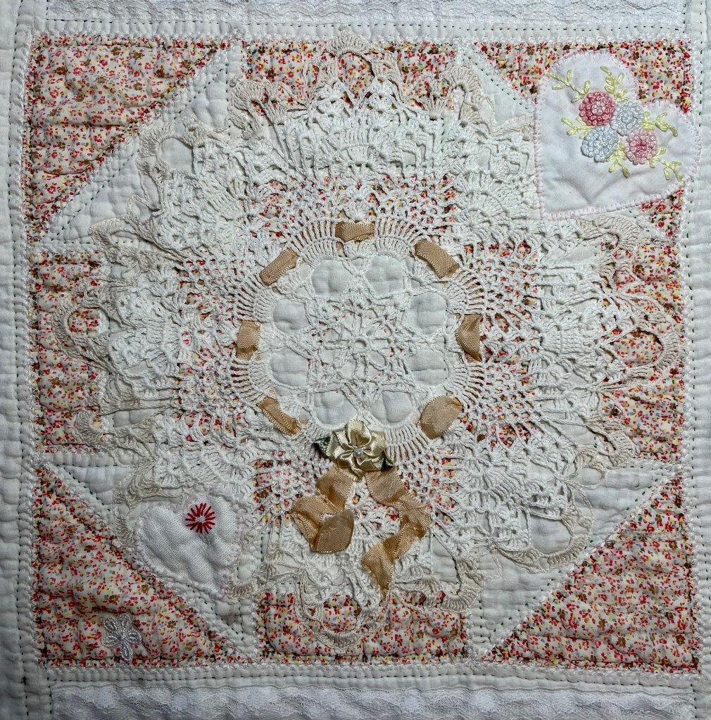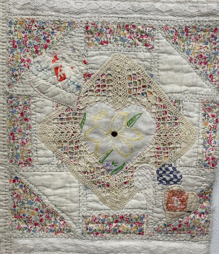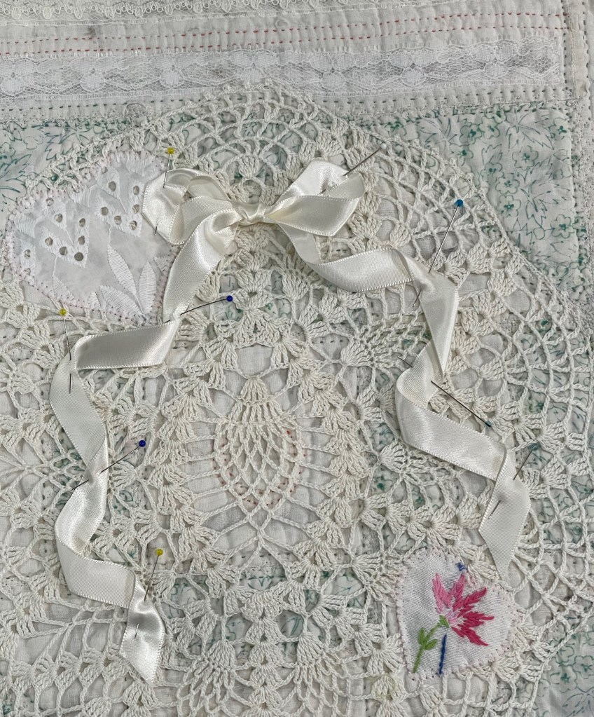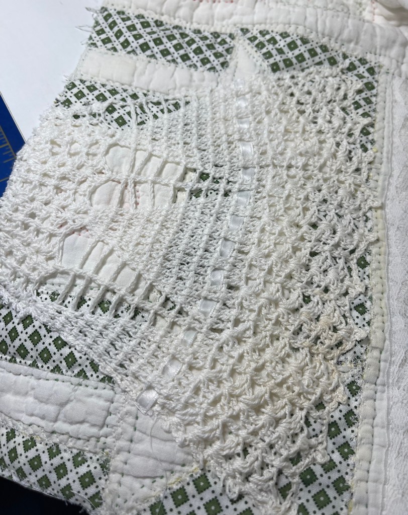 This project is moving along quickly with the machine stitching and the added doilies giving it a wonderful soft look. Stay tuned for more info as I continue working with this lovely very old quilt.