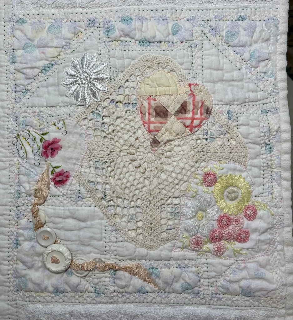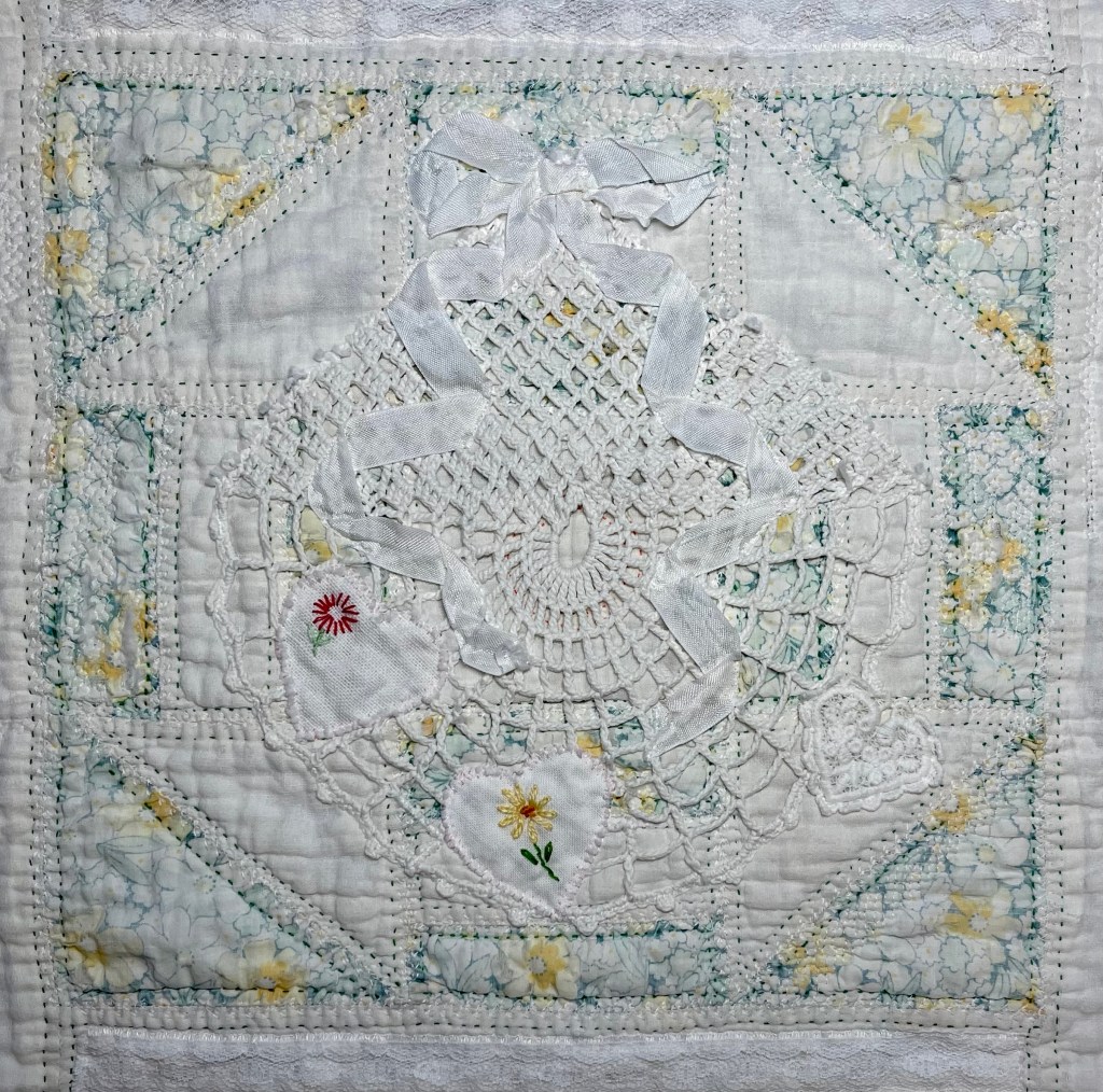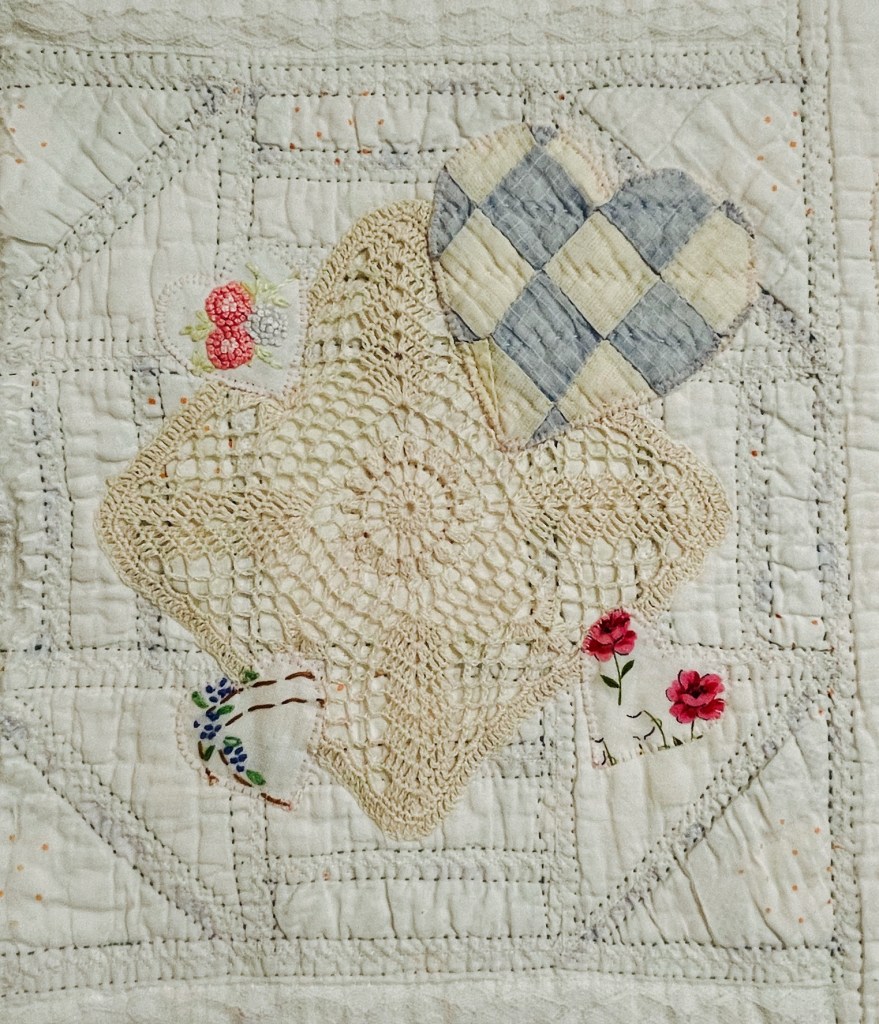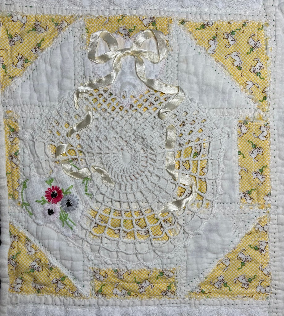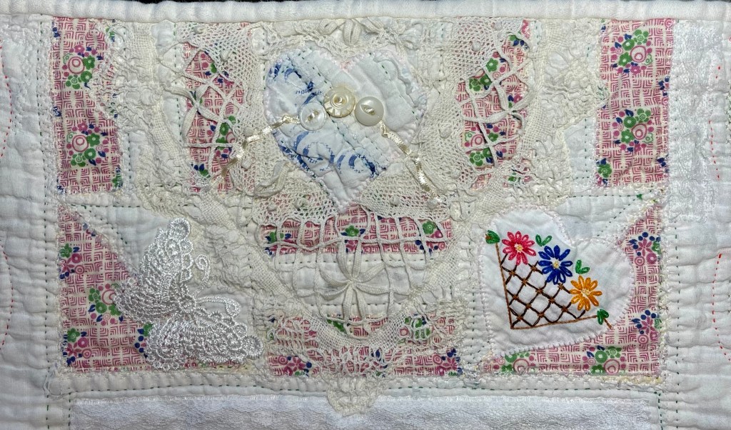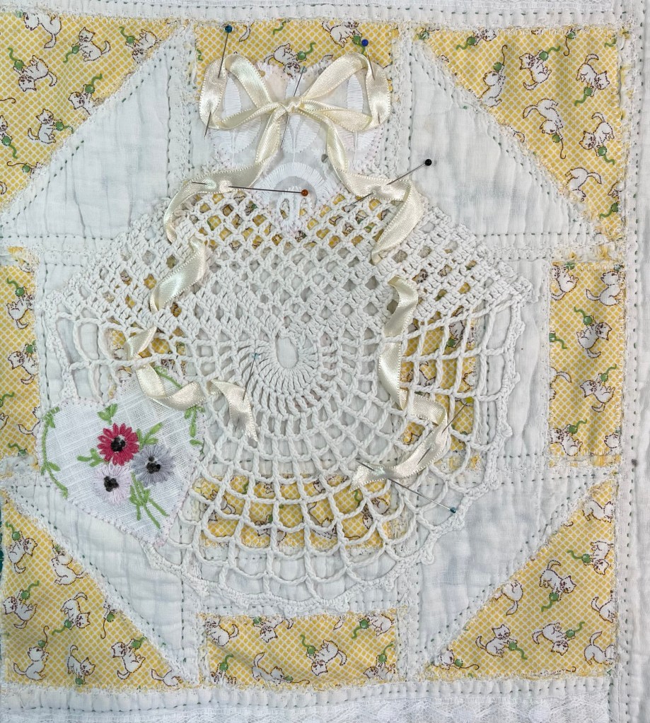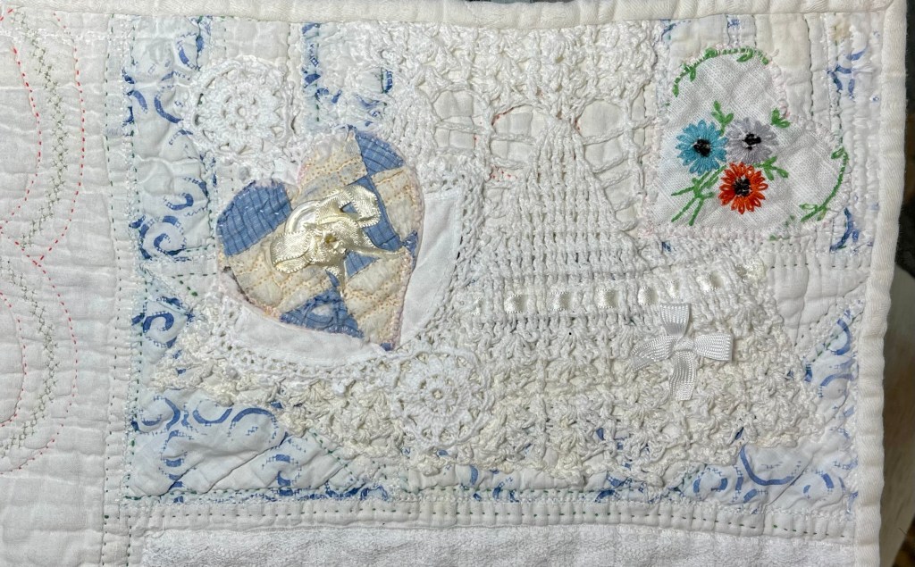 This project is moving along quickly with the machine stitching and the added doilies giving it a wonderful soft look. Stay tuned for more info as I continue working with this lovely very old quilt.