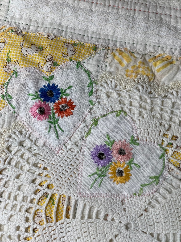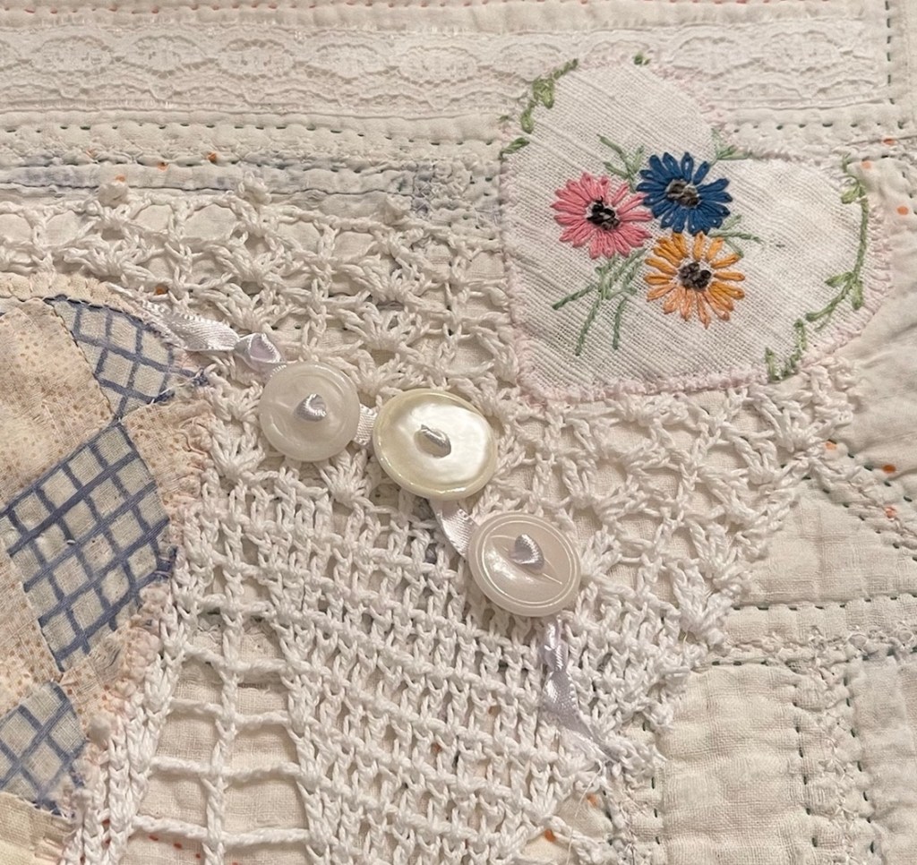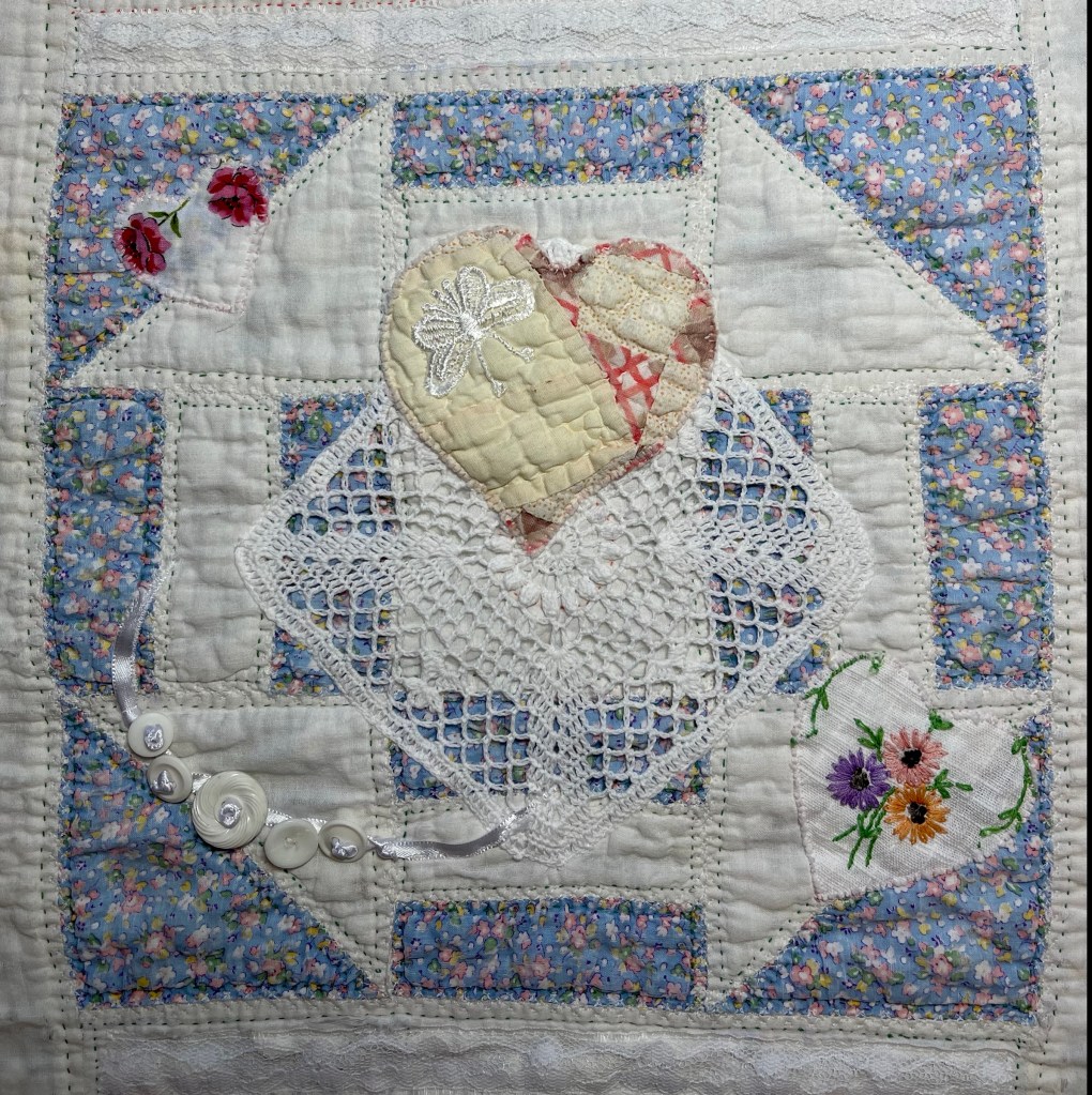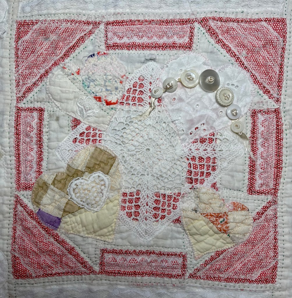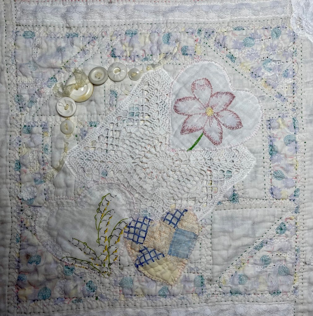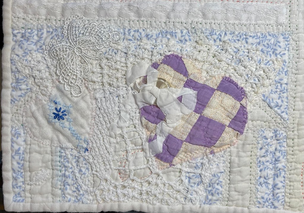 This project is moving along quickly with the machine stitching and the added doilies giving it a wonderful soft look. Stay tuned for more info as I continue working with this lovely very old quilt.