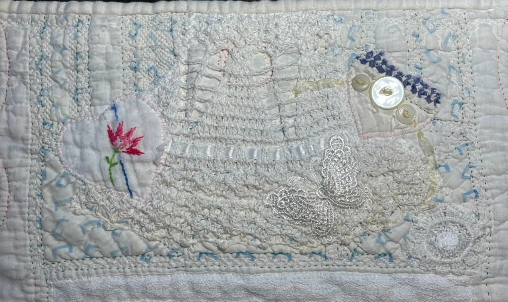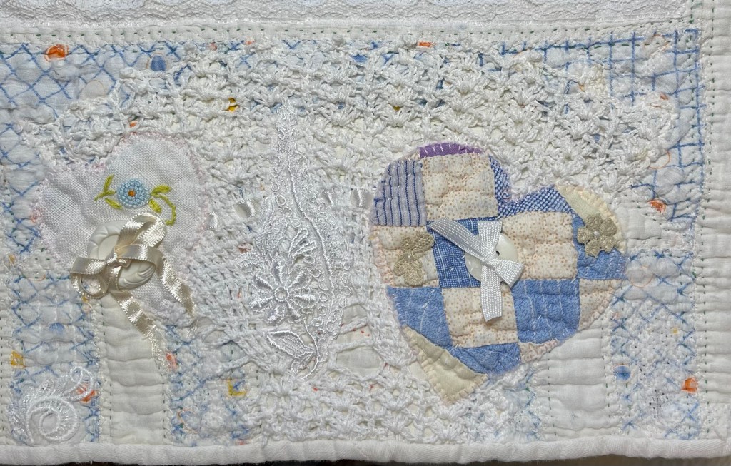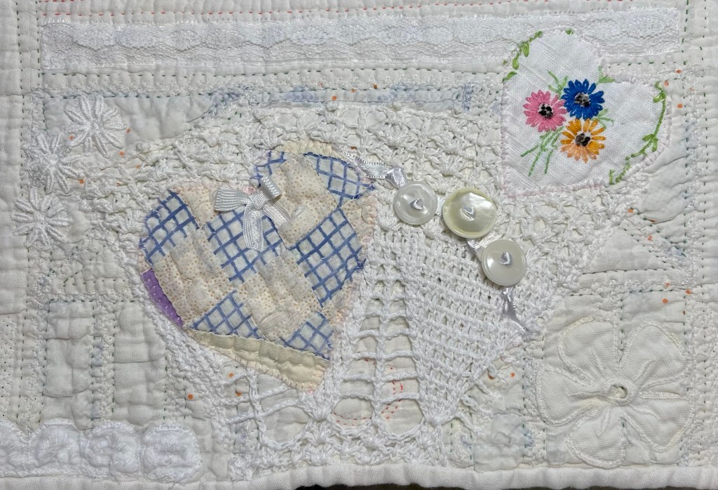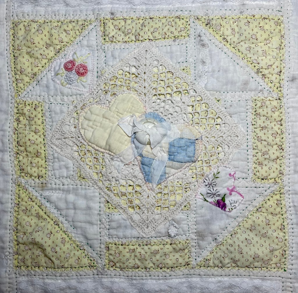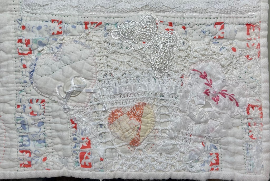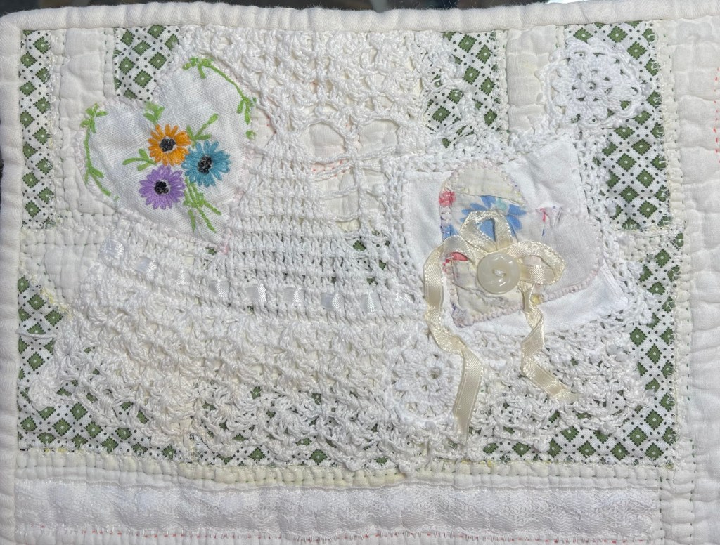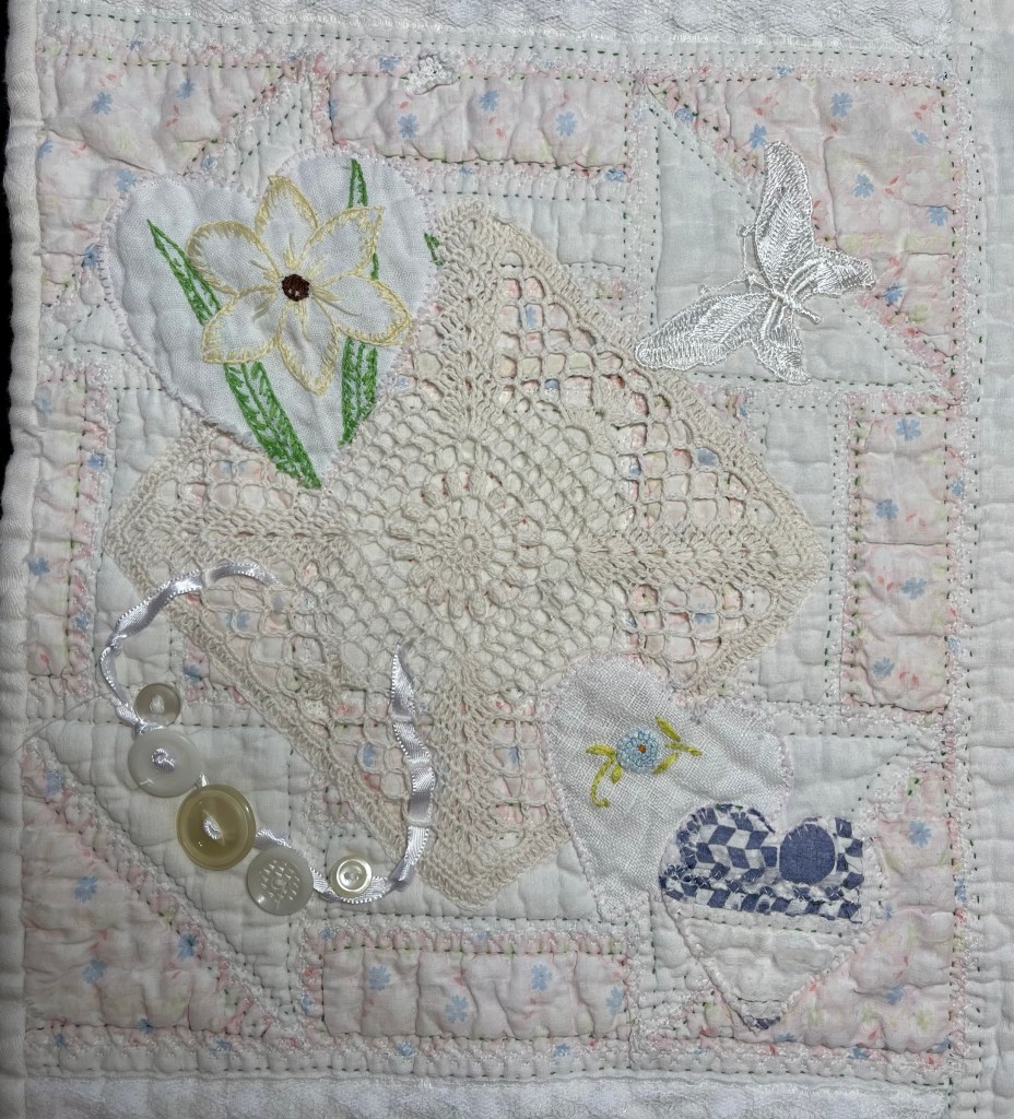 This project is moving along quickly with the machine stitching and the added doilies giving it a wonderful soft look. Stay tuned for more info as I continue working with this lovely very old quilt.
