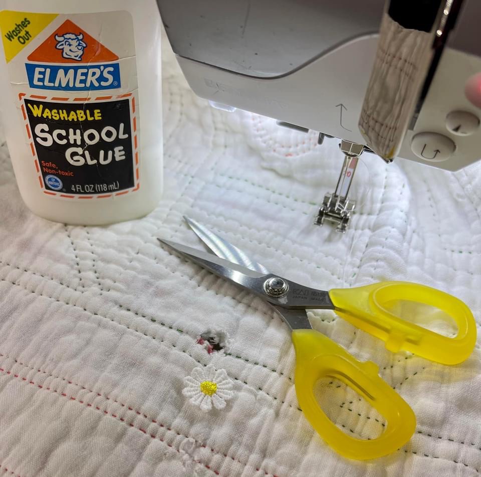 What to do about an index finger sized hole straight through the quilt? Elmer’s Glue and a commercially produced daisy flower will mask the hole from the back side.
