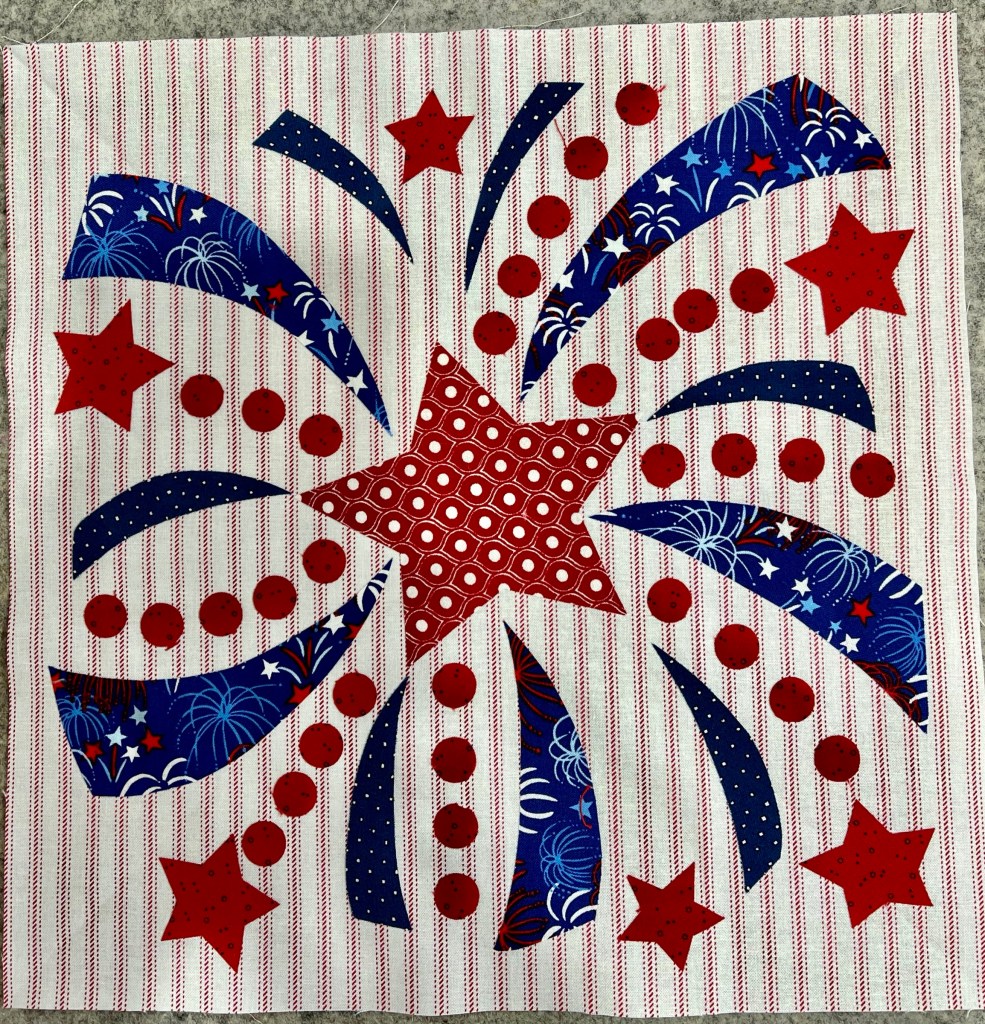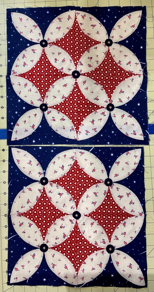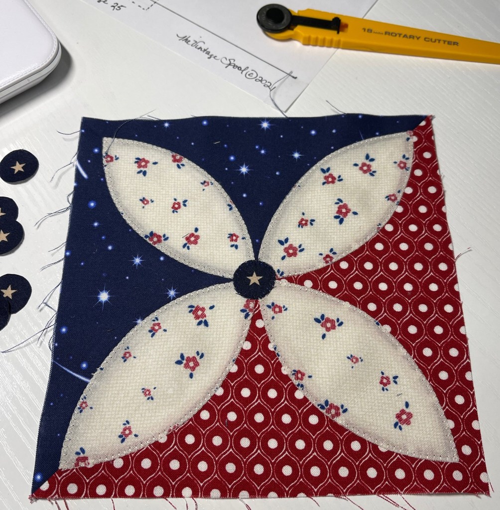 The tiny red circles…33 of them…two identical blocks means I’ve got 66 of these to machine applique! Yikes!!