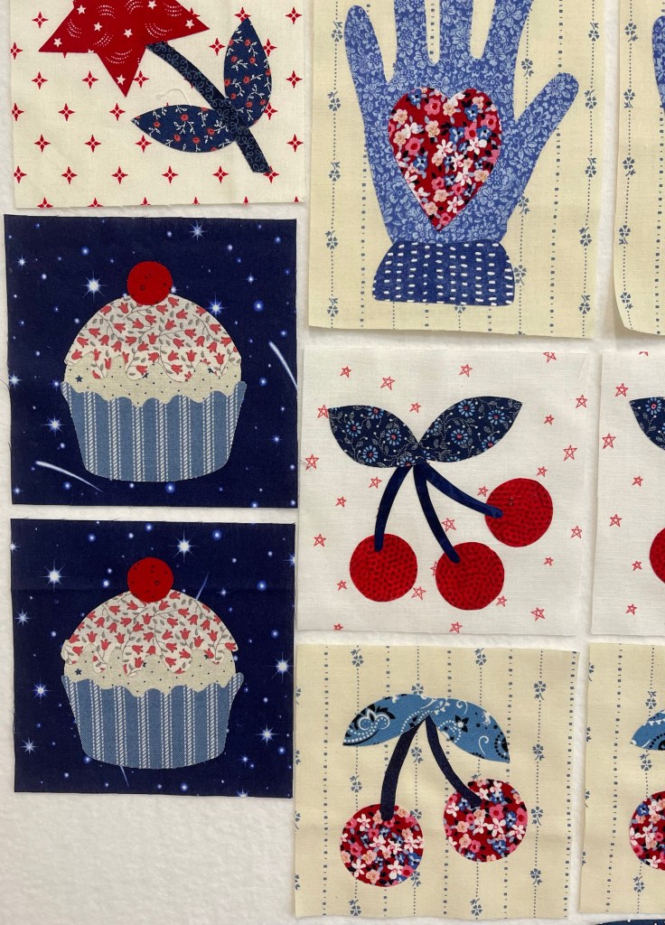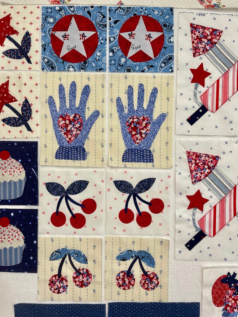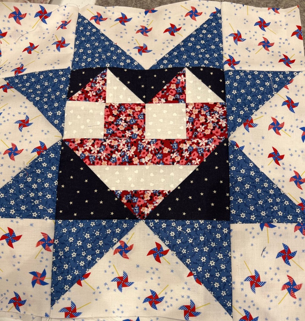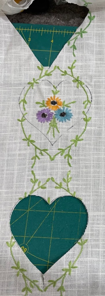 If you look carefully at the above and below pictures you’ll notice I changed the background fabric for the Heart in Hand block.