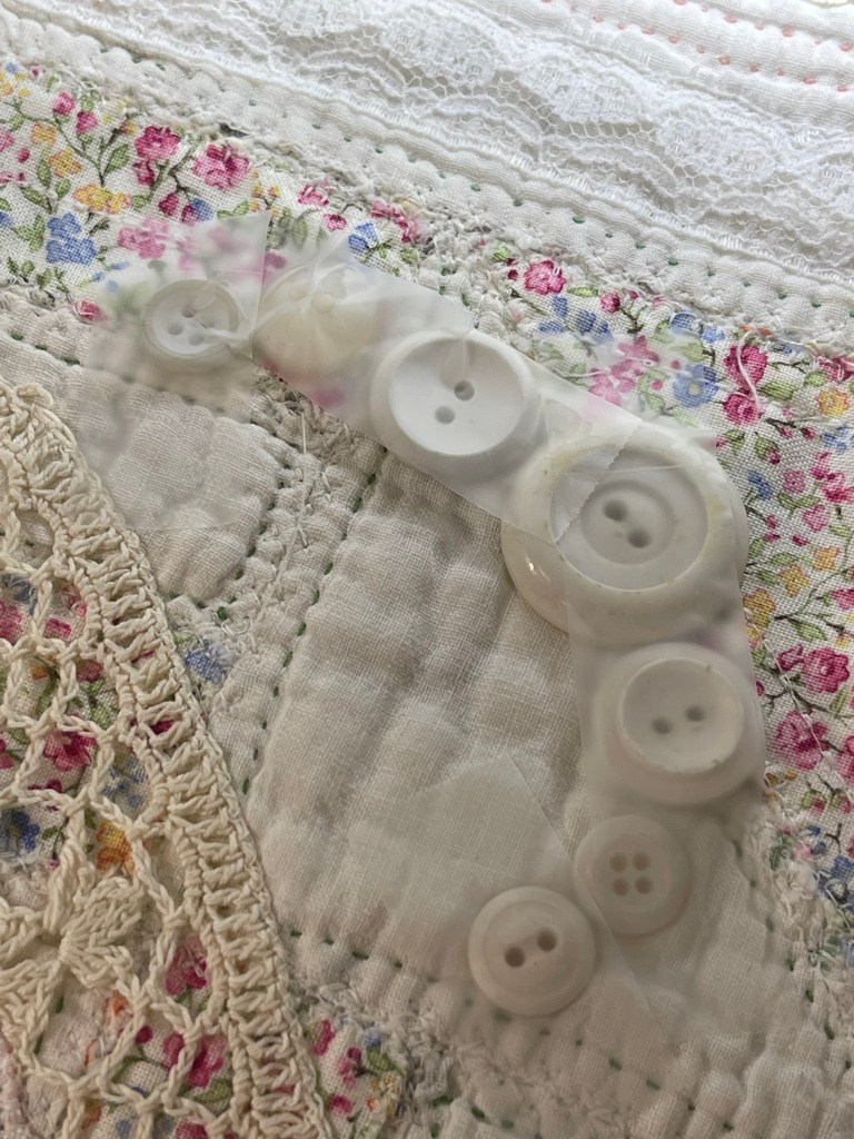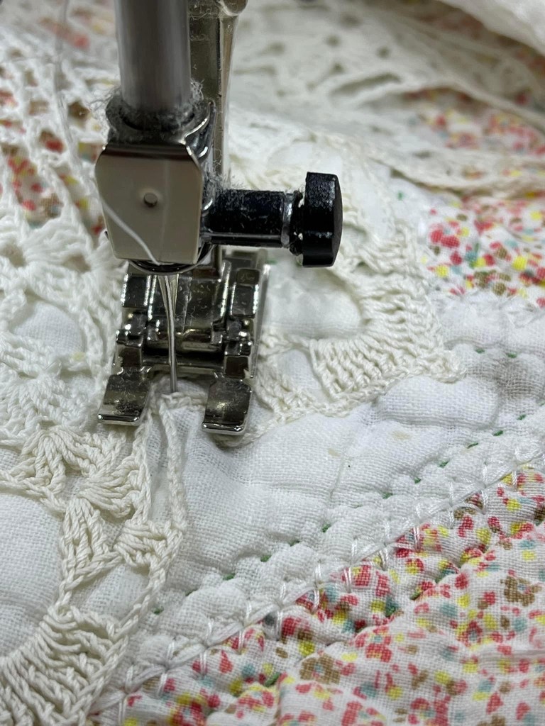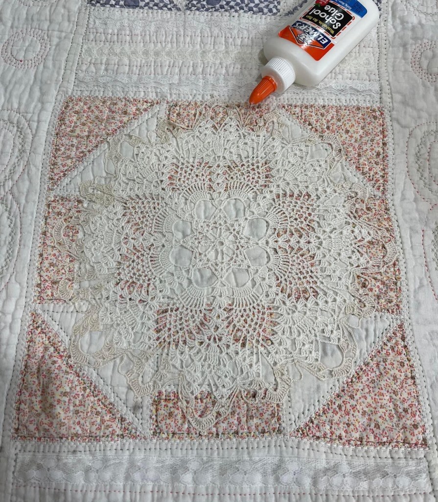 And now onto attaching (by machine) the vintage hand crocheted doilies, the really fun part. Each doily was secured to the quilt using Elmer’s Washable School Glue. I ran a bead of glue around the entire edge of the doily and then dry pressed it with my iron. Because this quilt will be laundered when I am finished, and because this glue is “washable” I know (with hands on experience) that no glue will remain in the finished quilt. If you were wanting to hand stitch the doily to the quilt, skip the glue and hold the doily in place with straight pins. Why? It is quite difficult to hand stitch through the dried glue.