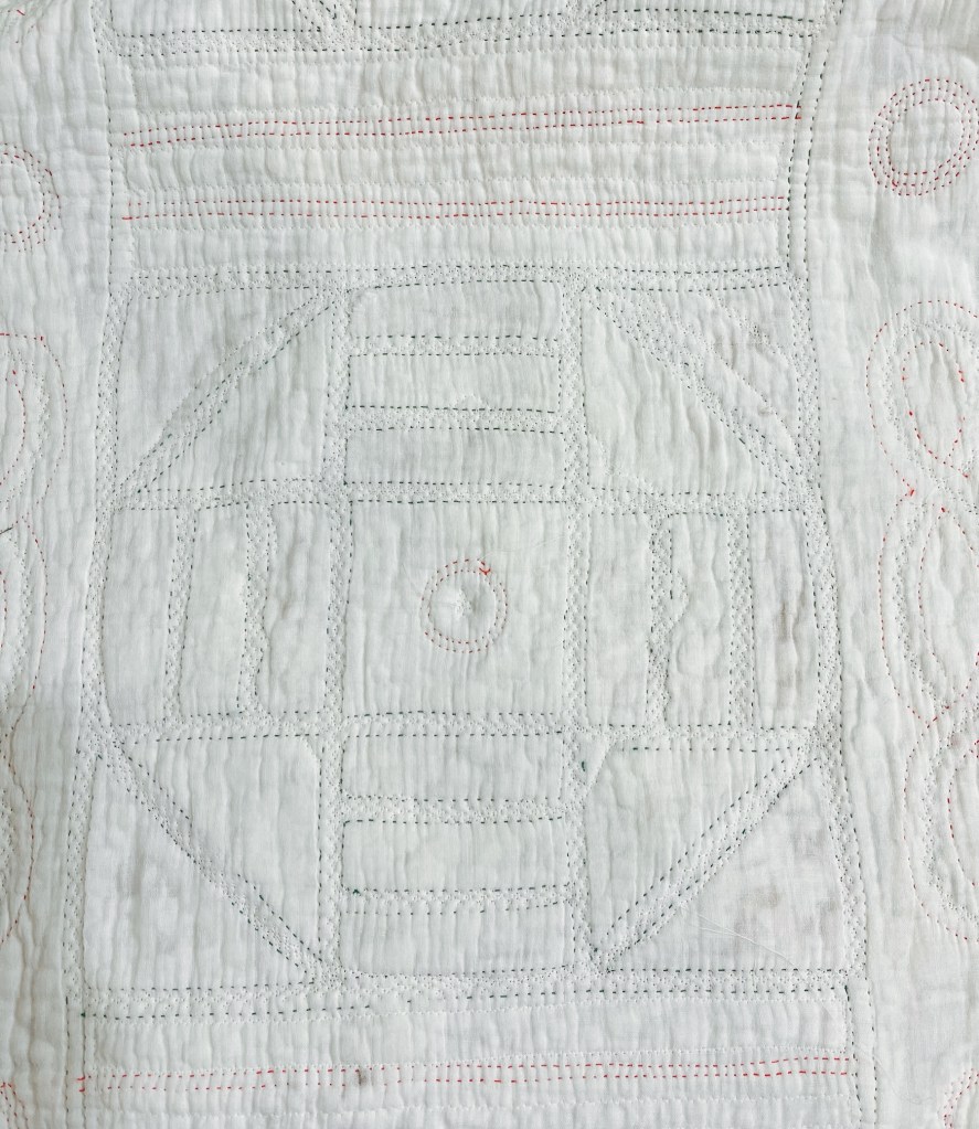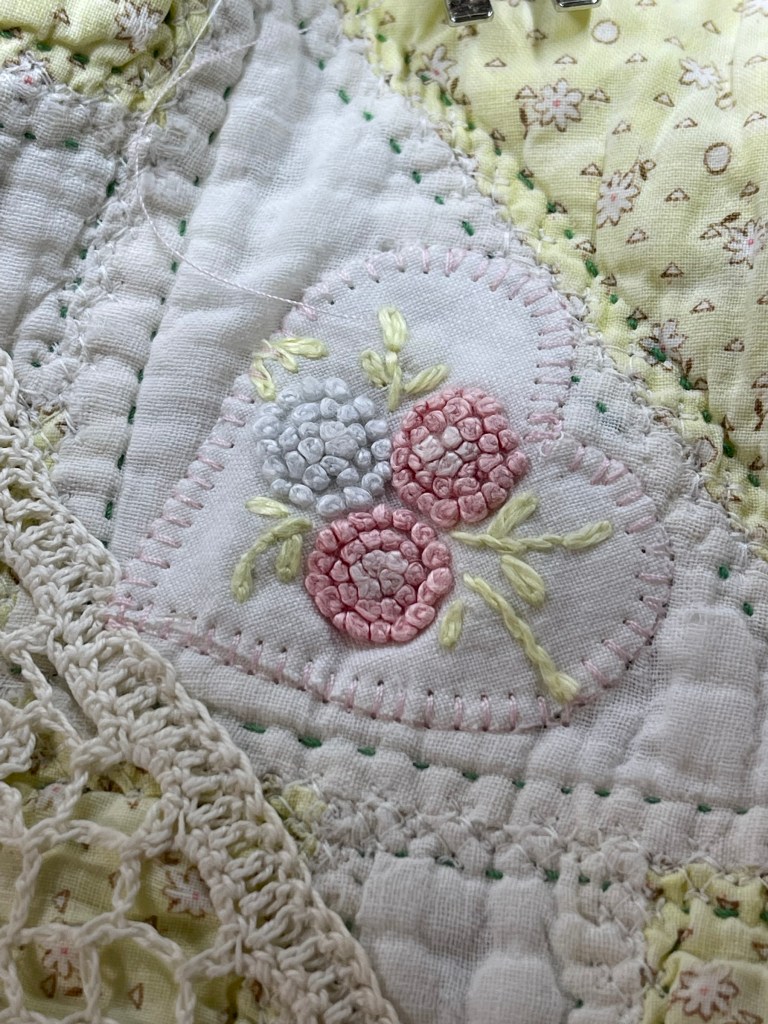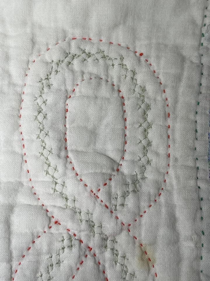 I also did a machine decorative stitch in the sashing swirls choosing a thread that matches the original green hand quilting found throughout the quilt.