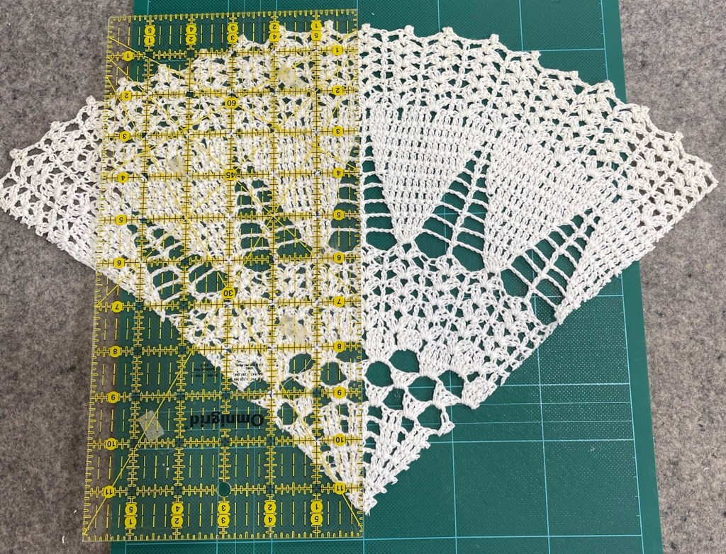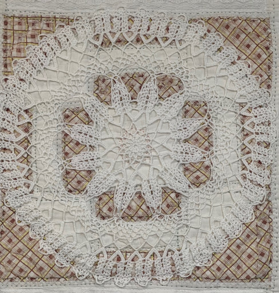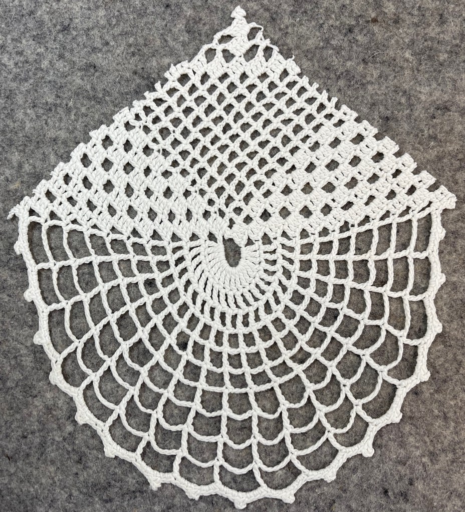 The 10 partial blocks (5 top and 5 bottom) present another challenge. I had a very large and in my mind a very unattractive white doily to experiment with. Why unattractive? If you’ve ever crocheted you will know the look you get when you use a crochet hook a bit too large for the crochet thread. I think that’s the case with this 12” doily: