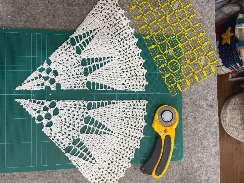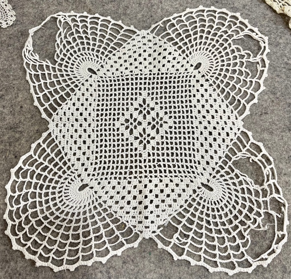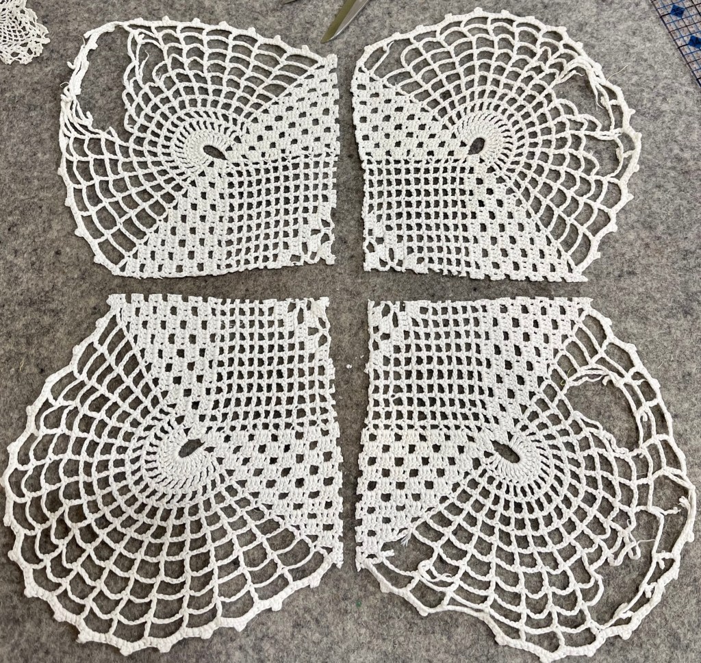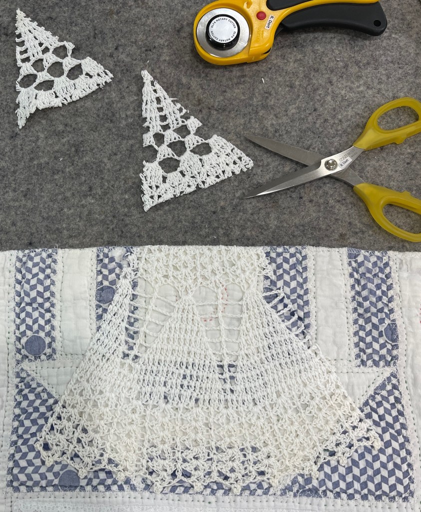 Then there was this unusual shaped doily. The first picture shows you the extensive damage and the size is far too large for this quilt. I decide I’ve got nothing to lose by experimenting and cutting it apart into 4 sections.